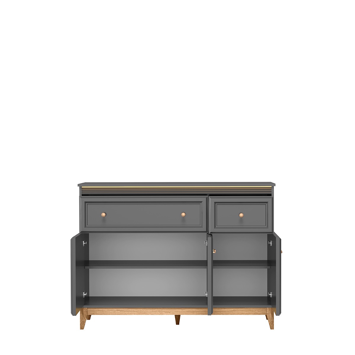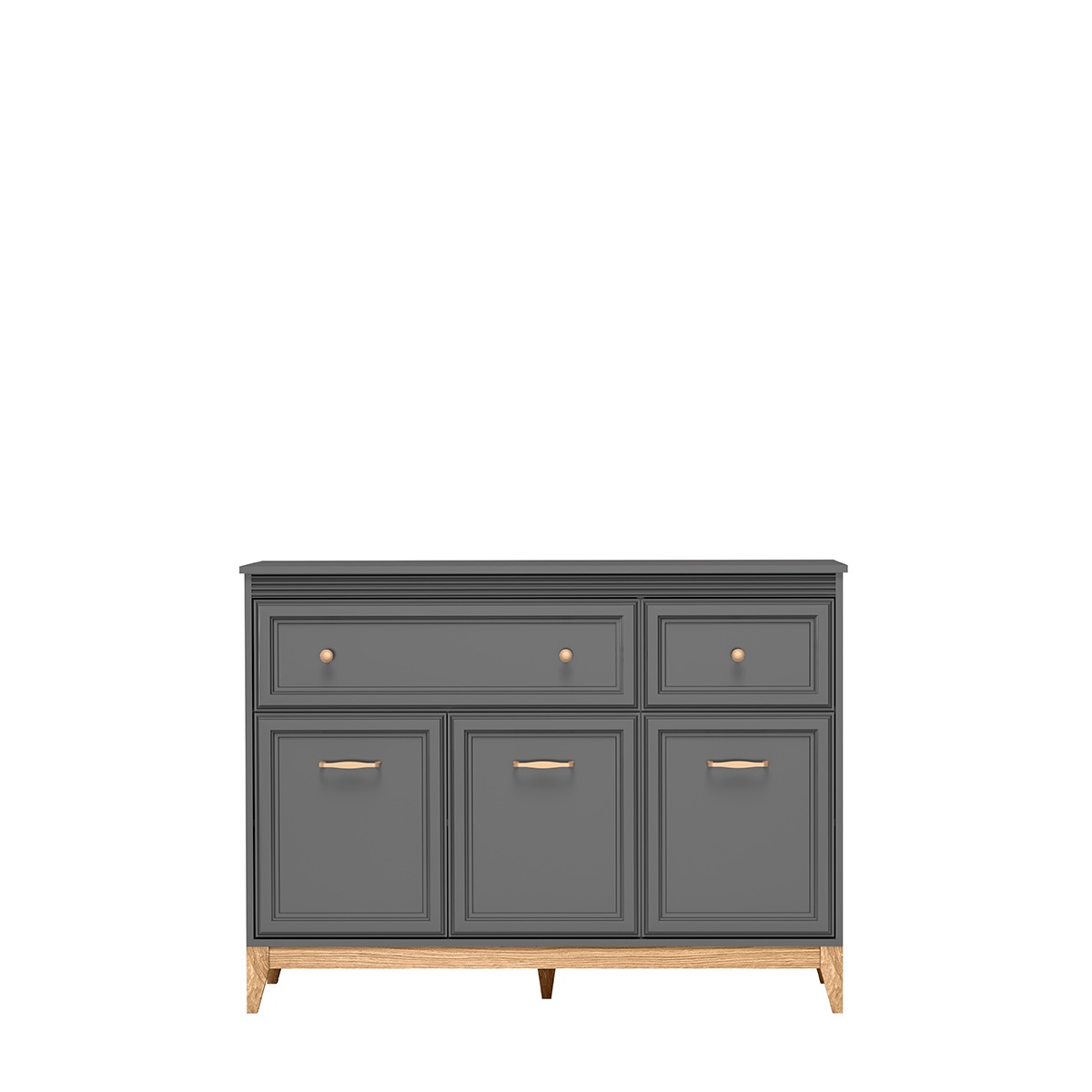 Komoda TA-1 to idealne połączenie funkcjonalności i nowoczesnego designu. Fronty wykonane z płyty MDF o grubości 22mm w odcieniu szary diamentowy tworzą elegancką, matową powierzchnię, która pięknie współgra z naturalnym drewnem nóg. Meble posiada dwie górne szuflady oraz dwie dolne szafki z drzwiczkami, oferując wszechstronne możliwości przechowywania.Wyróżnikiem modelu TA-1 jest standardowe oświetlenie LED umieszczone pod blatem, które włączasz dotykowym przyciskiem przez powierzchnię blatu – bez widocznych włączników. Ciepła poświata podkreśla minimalistyczną formę komody i tworzy w pomieszczeniu atmosferę luksusu i przytulności, szczególnie wieczorami. Eleganckie metalowe uchwyty w kolorze różowego złota stanowią subtelny, ale zauważalny akcent, który harmonijnie komponuje się z chłodnym szarym diamentowym kolorem frontów. Drewniane nogi podnoszą meble nad podłogę, wizualnie odciążając bryłę i ułatwiając sprzątanie pod meblem. Efekt lewitacji, który dodatkowo potęguje podświetlenie LED, nadaje komody lekkości i współczesnego charakteru.TA-1 sprawdzi się doskonale w salonie, sypialni czy jadalni – wszędzie tam, gdzie potrzebujesz funkcjonalnego mebla o ponadczasowej estetyce i nowoczesnych rozwiązaniach.