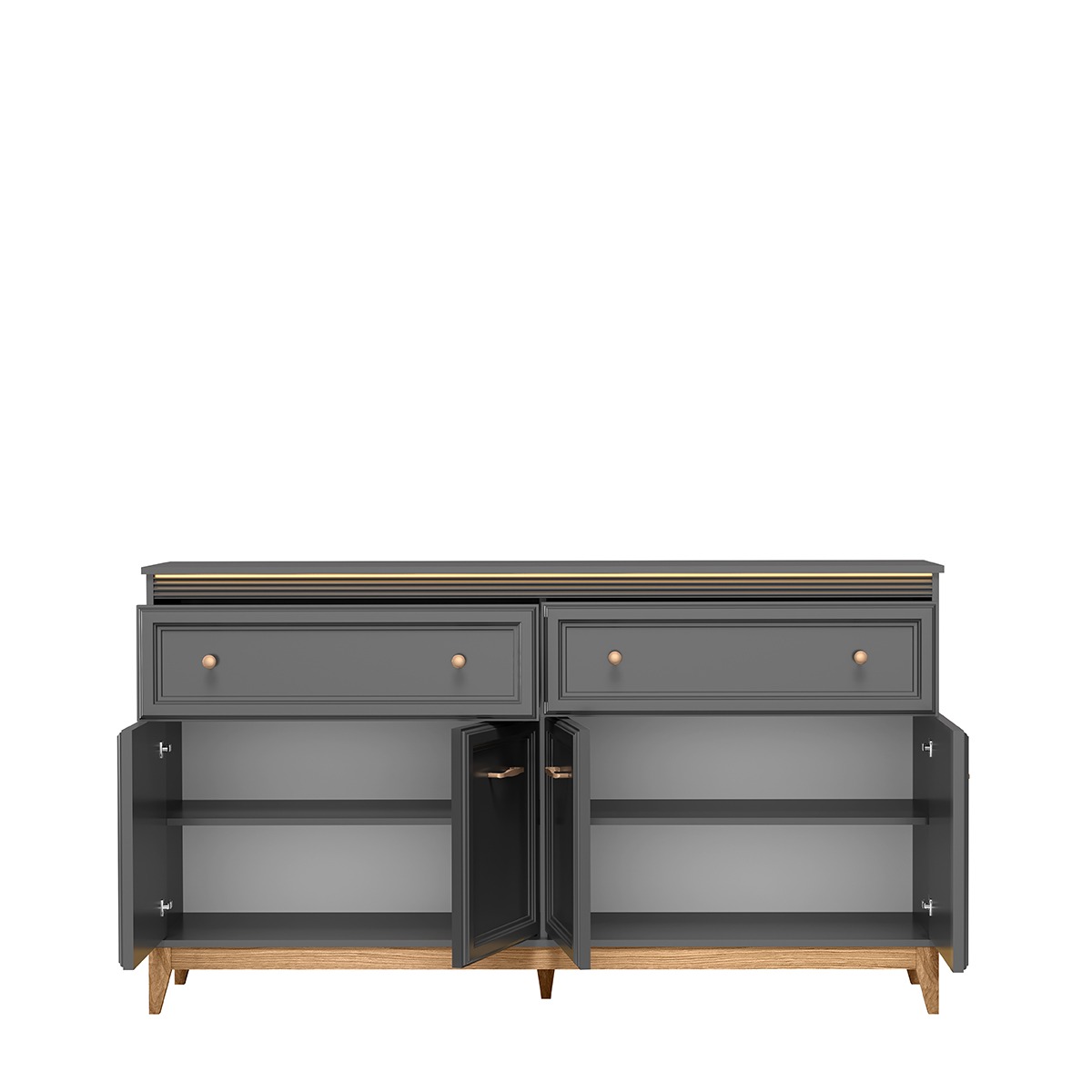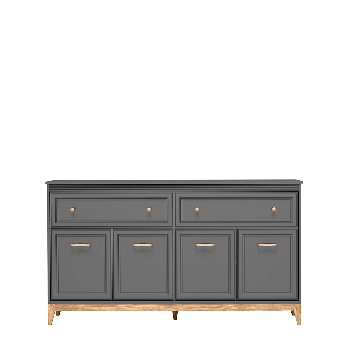 The spacious TA-2 sideboard features four lower cabinets and two upper drawers. Standard LED lighting under the countertop is activated by touching the countertop. Diamond gray fronts, wooden legs, and rose gold handles create a harmonious, modern composition.