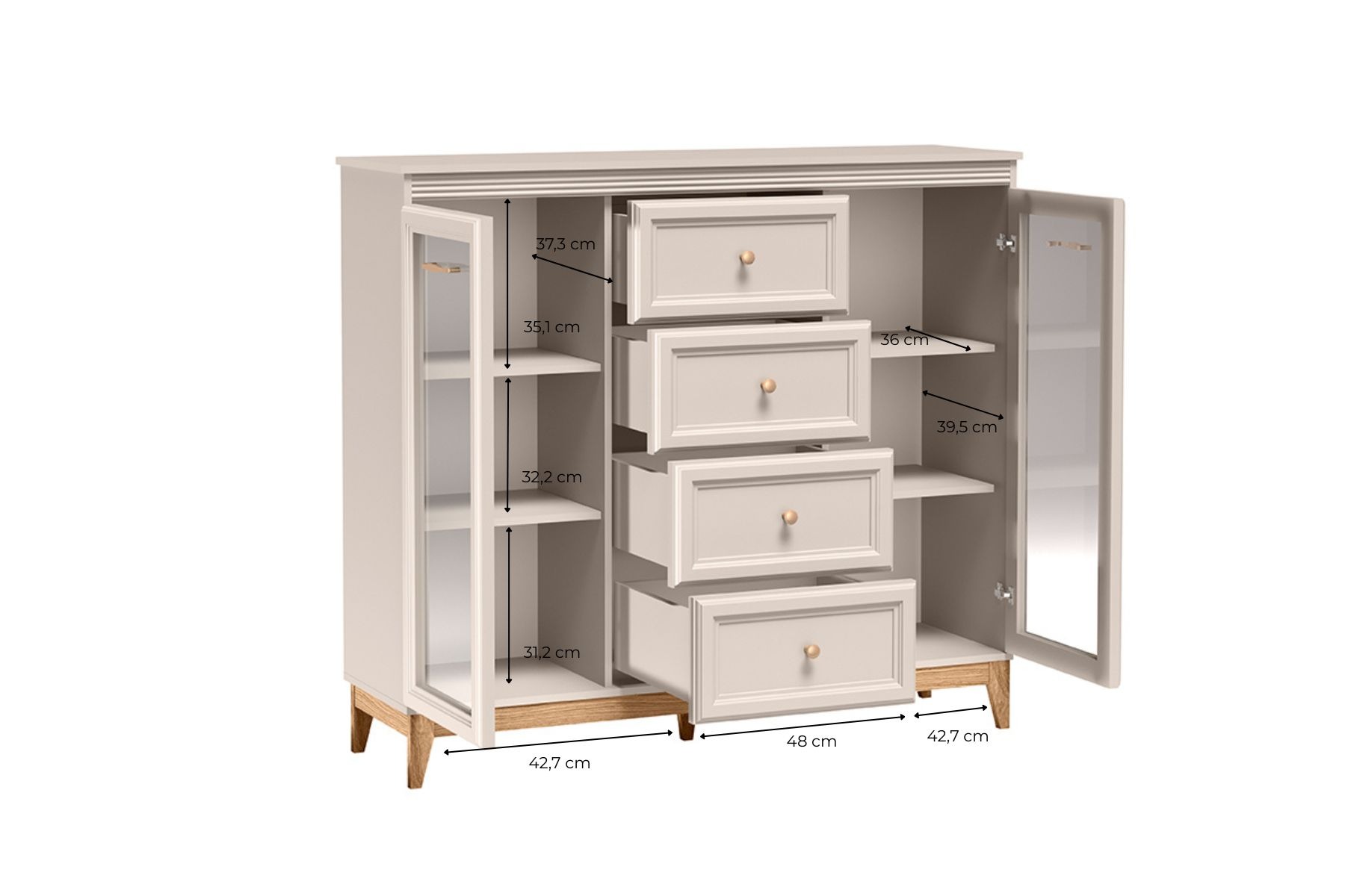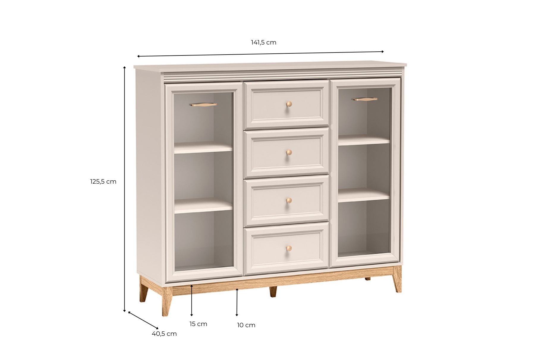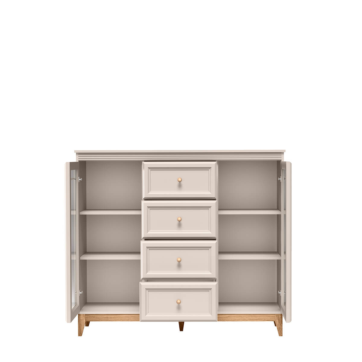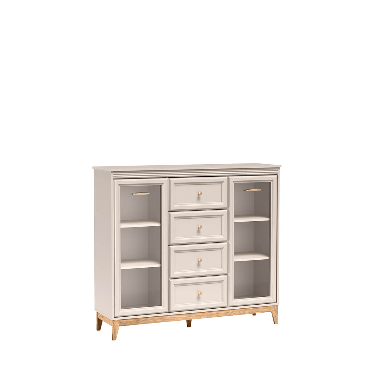 WINDSOR – 7 is an elegant and functional display cabinet that combines classic aesthetics with modern solutions. Its subtle color scheme in the shade of cashmere, juxtaposed with wooden accents, creates a harmonious and cozy atmosphere in any interior. Thanks to its well-thought-out layout and high-quality workmanship, the display case will be perfect for a living room, dining room or study, serving both a decorative and practical function.