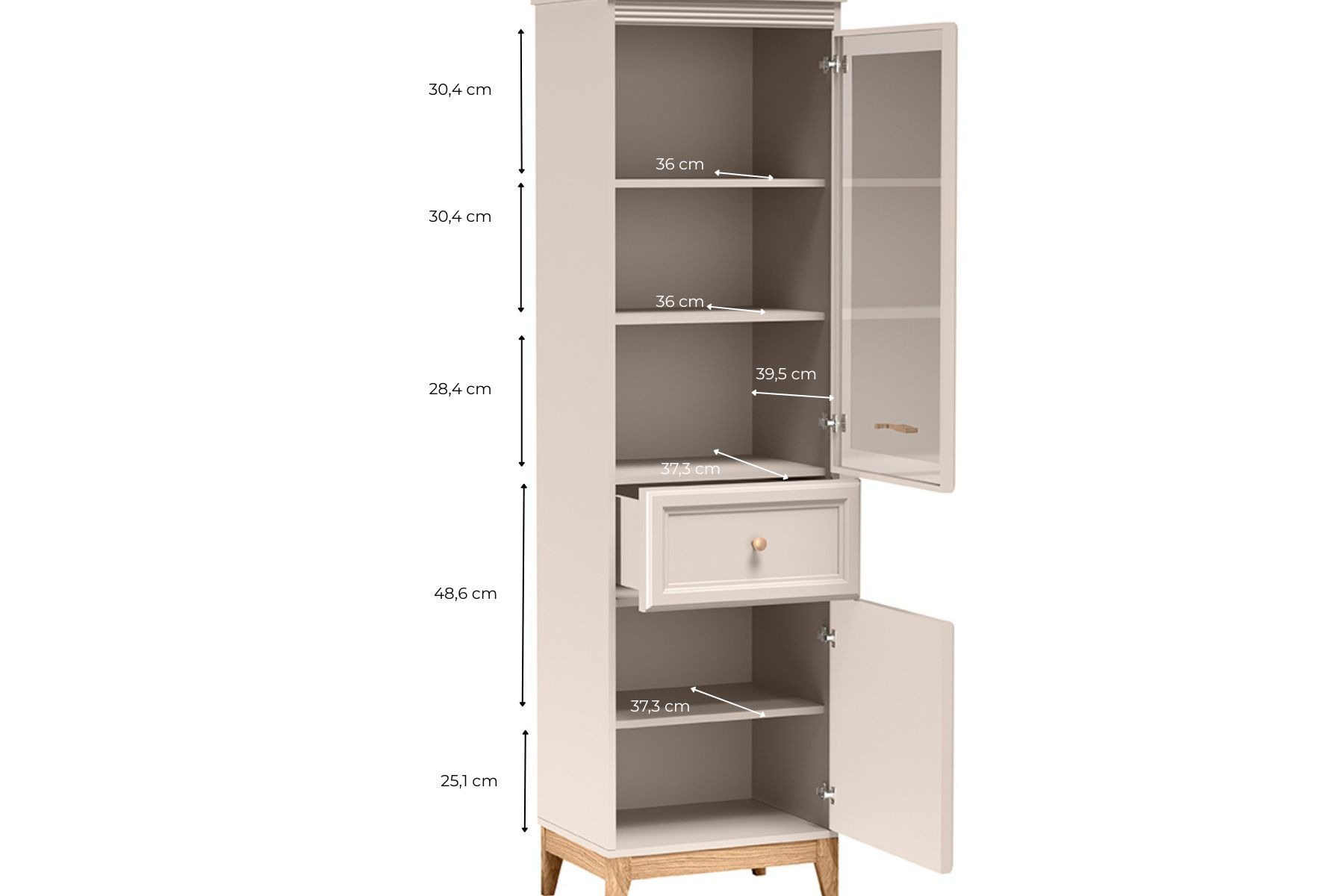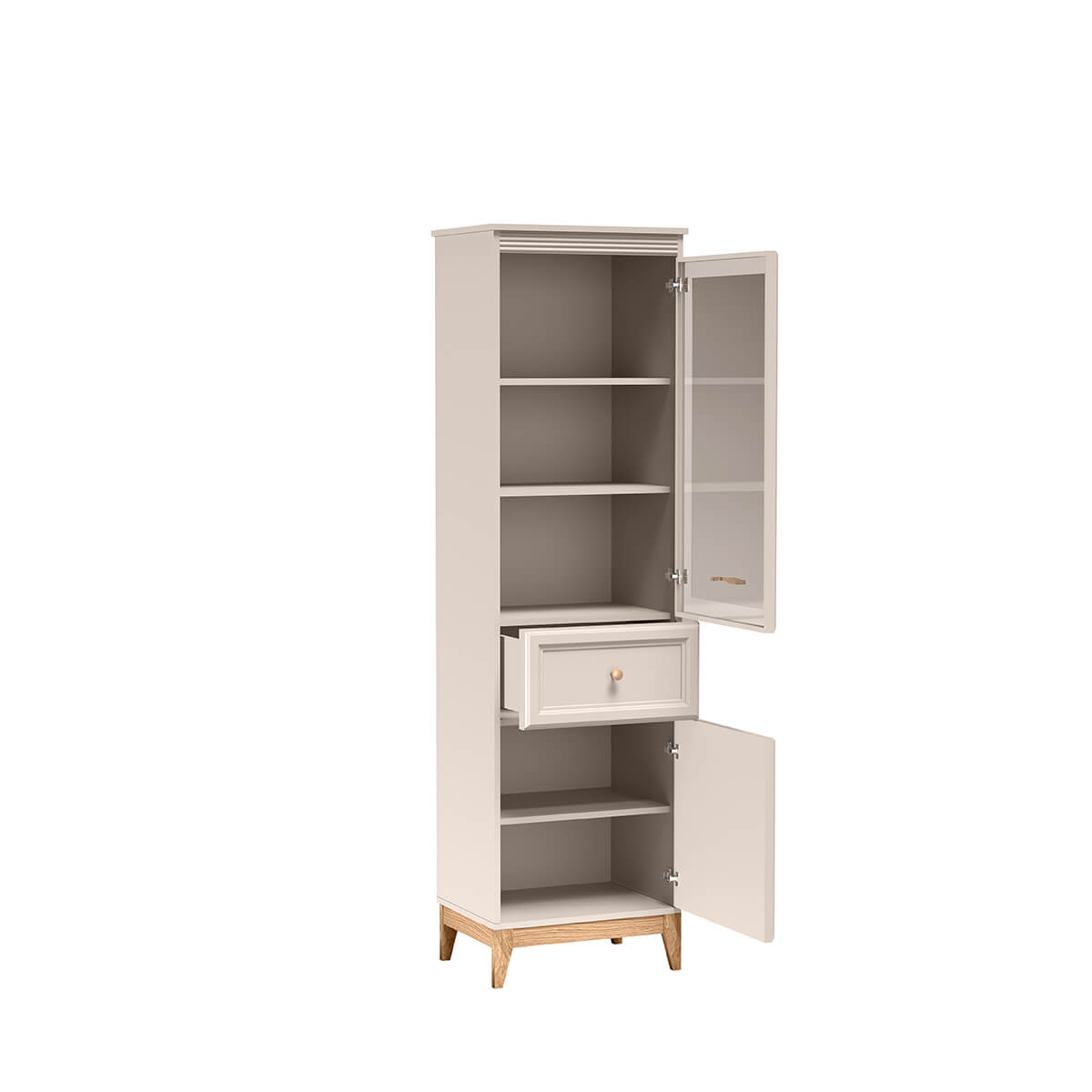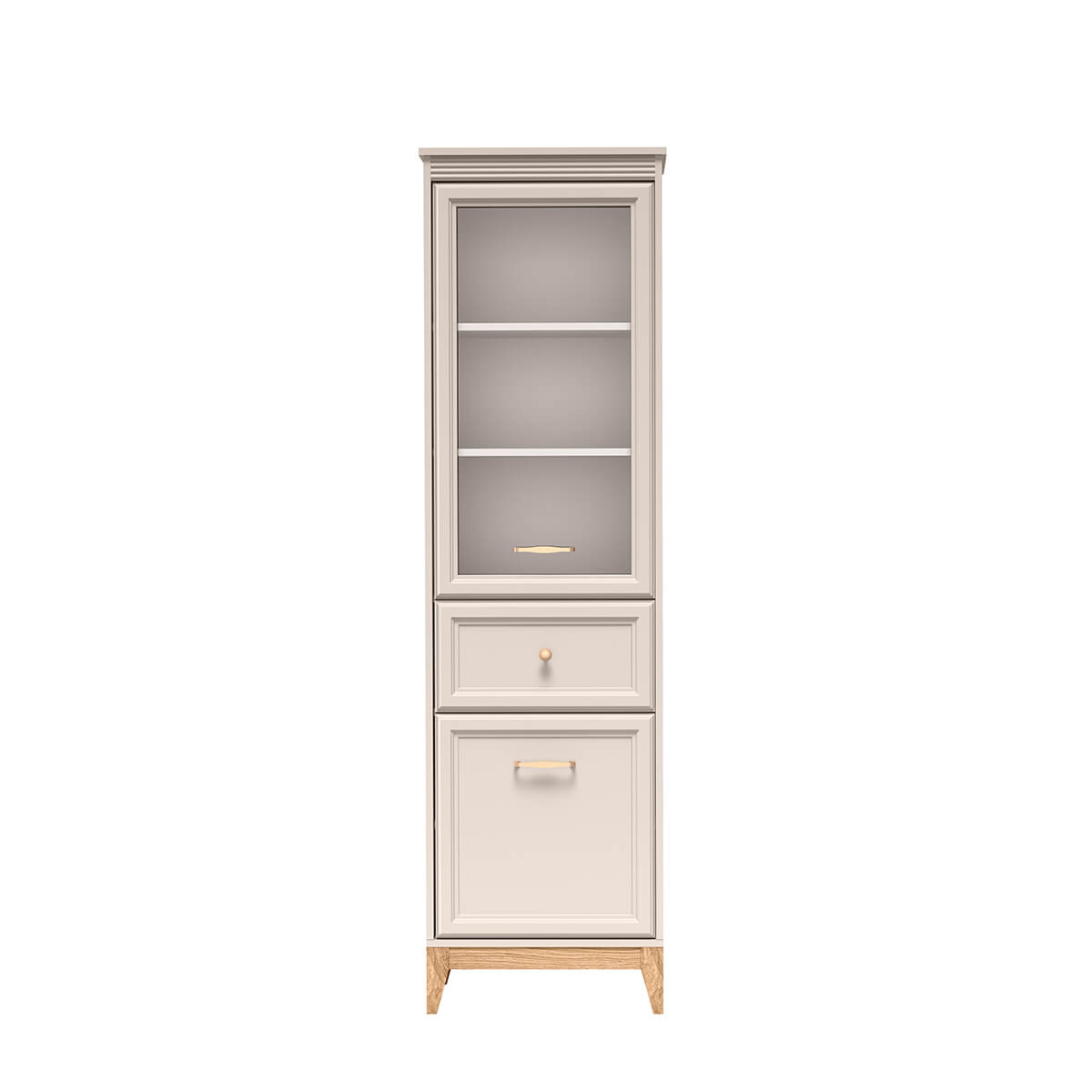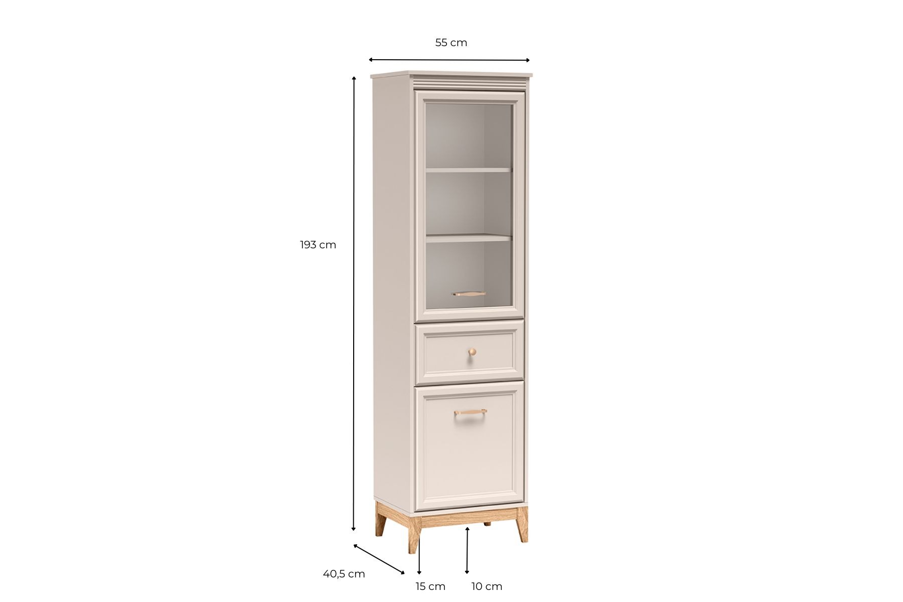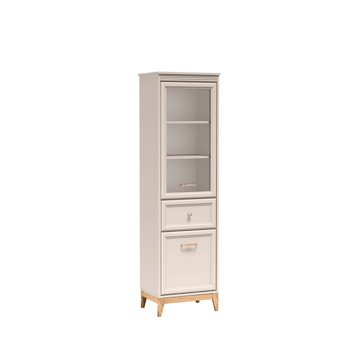 The upper part of the display case is a glass door with delicate milling, behind which there are two practical shelves. Thanks to them you can stylishly present tableware, decorations or books. Underneath there is a capacious drawer, ideal for small items, and a lockable cabinet providing space for larger items.