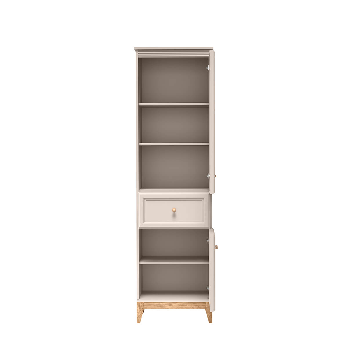 The showcase stands on solid oak legs, which give it lightness and emphasize the natural character of the furniture. Cashmere-colored fronts blend beautifully with gold metal handles, adding subtle elegance to the whole. The comfort of use is ensured by a silent closing system, which makes the use of drawers and cabinets almost noiseless. WINDSOR – 6 is a proposal for those who appreciate the classics in a modern edition. It will work perfectly in both the living room and dining room, adding a unique character to the interior.