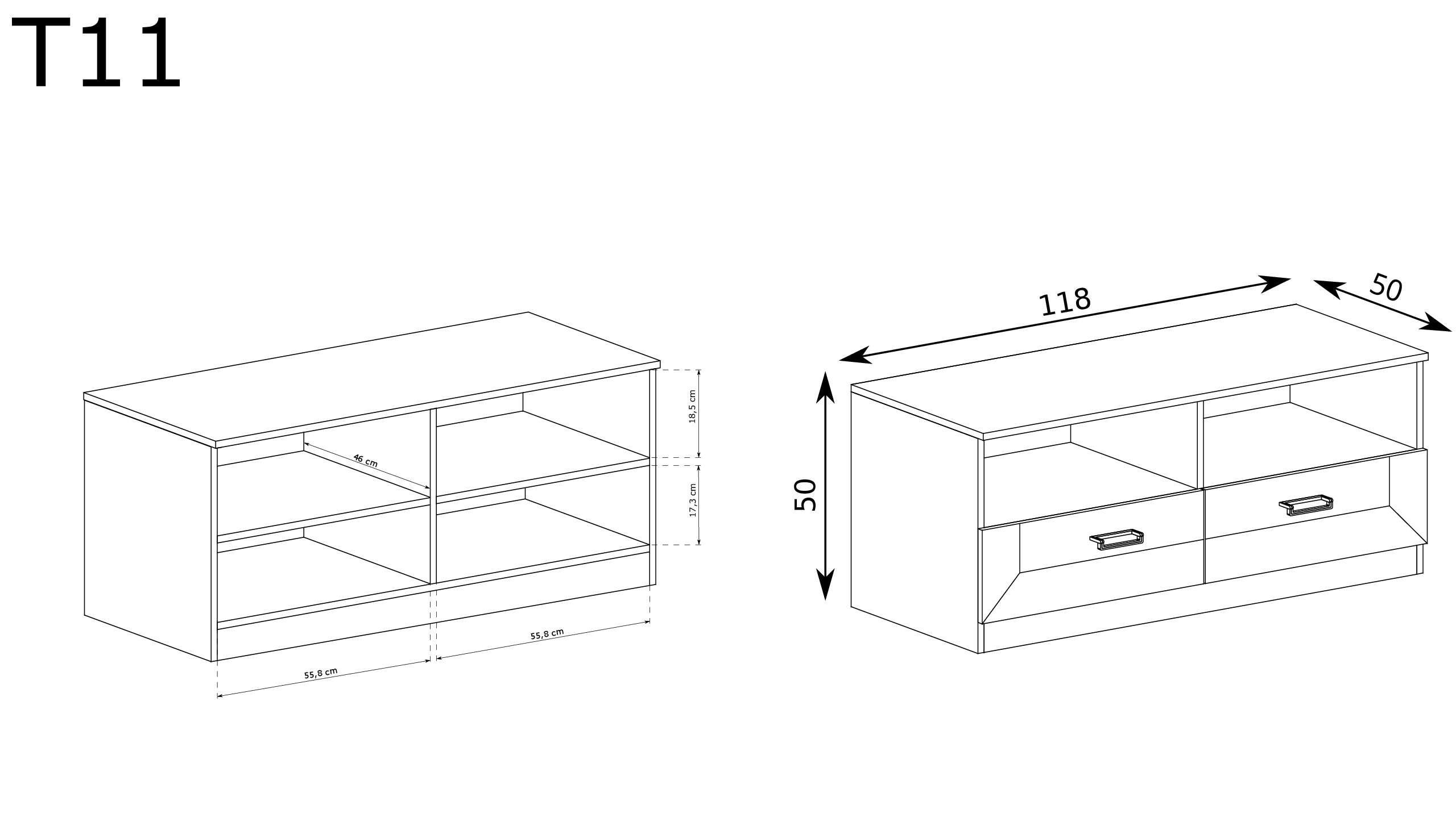 Small, compact RTV cabinet for the TV. At the bottom there are drawers for small items and two shelves on which, for example, a set-top box or console can stand.