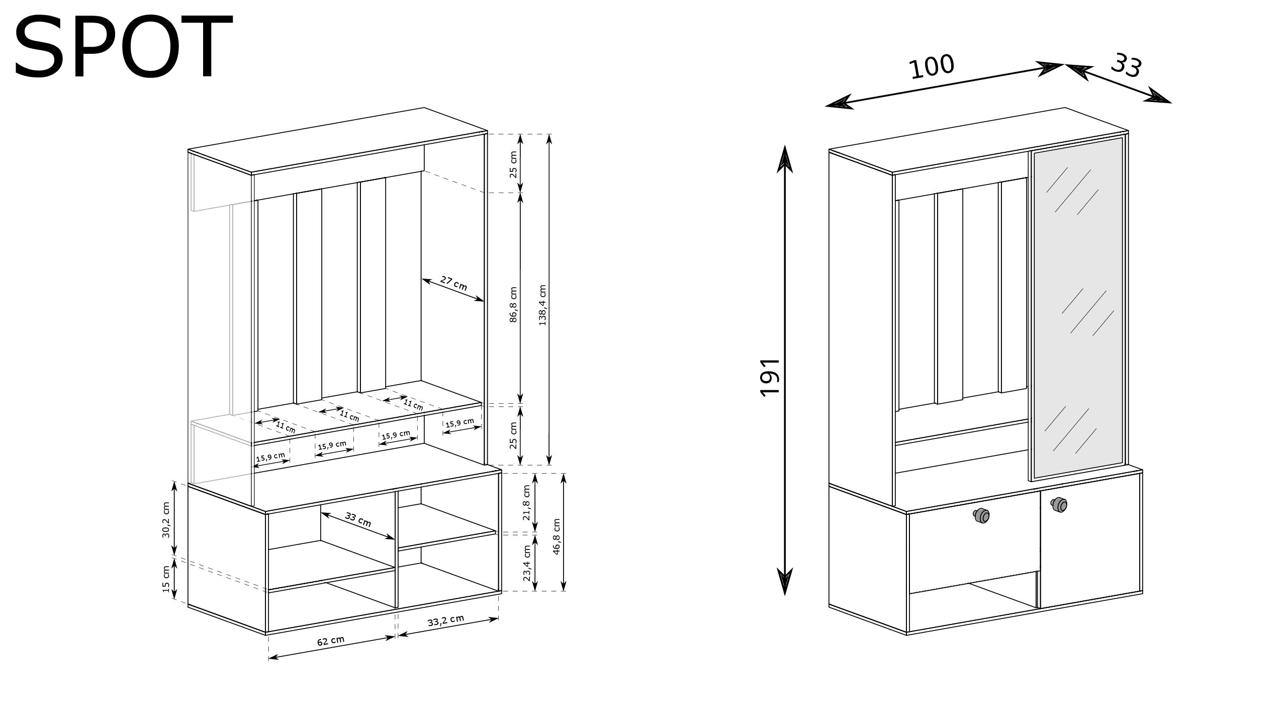 A closet is a piece of furniture that is needed in every home, it is a functional closet for storing shoes and hanging up jackets on a hanger. It must not lack a mirror, in which we can look at ourselves before leaving the apartment. With a modern design, the closet will fit into the fashion trends of the season. Behind the mirrored door there are shelves that can be used to store footwear for the whole family. The closet is available in two color versions: all Artisan and black combined with warm, natural Artisan. The closet will fit into any hall, it is versatile, decorative laths can be on the right as well as on the left side. The hanger and handles are very solid and made of metal.