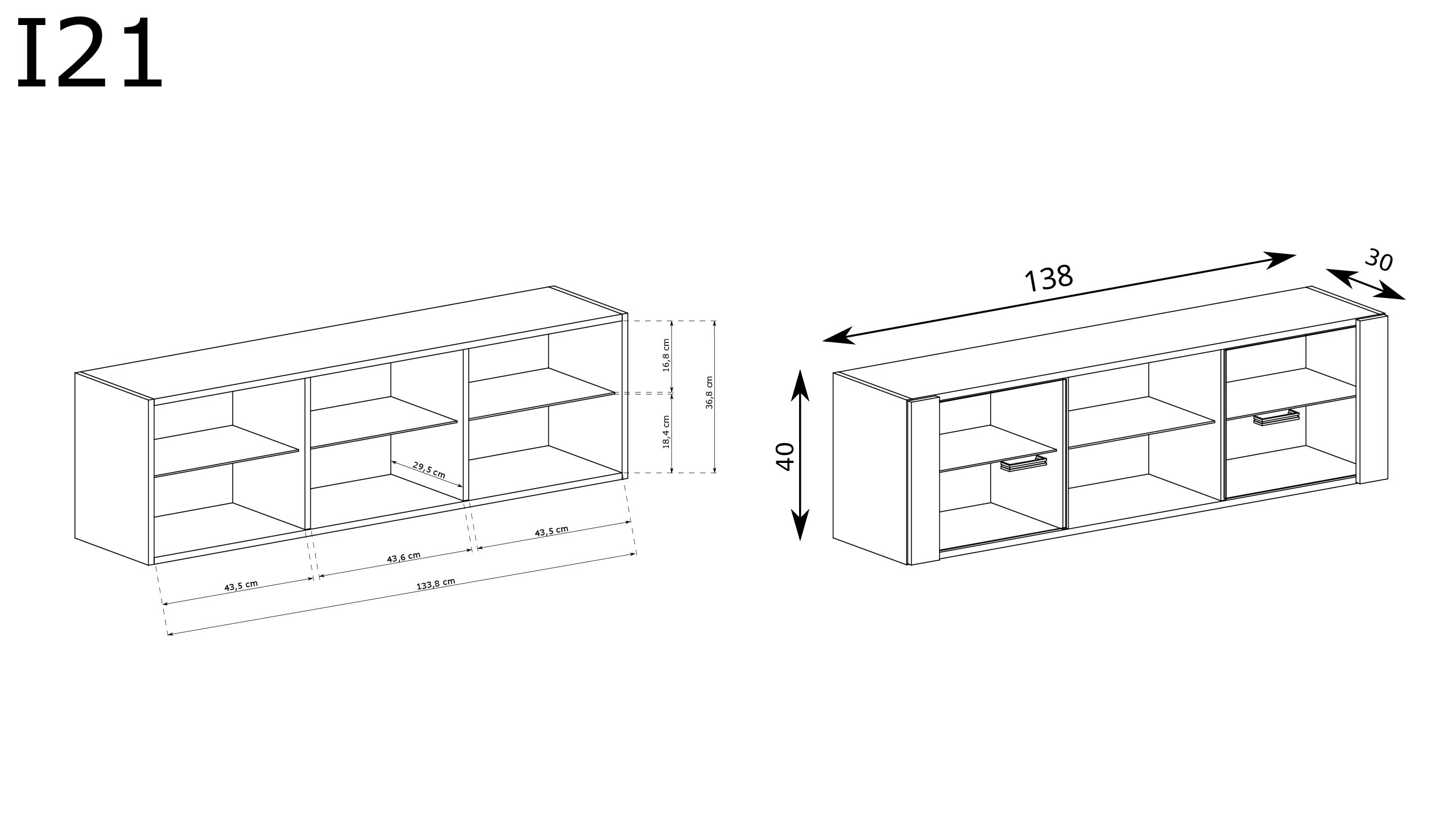 A hanging shelf from the Indianapolis collection, which will fit perfectly into the room and complement it. It has glass doors and shelves that make it amazing. The shelf has metal handles and the possibility of attaching LED lighting. Instead of glass fronts, you can use full plates, shelves as well . It is available in three colours.