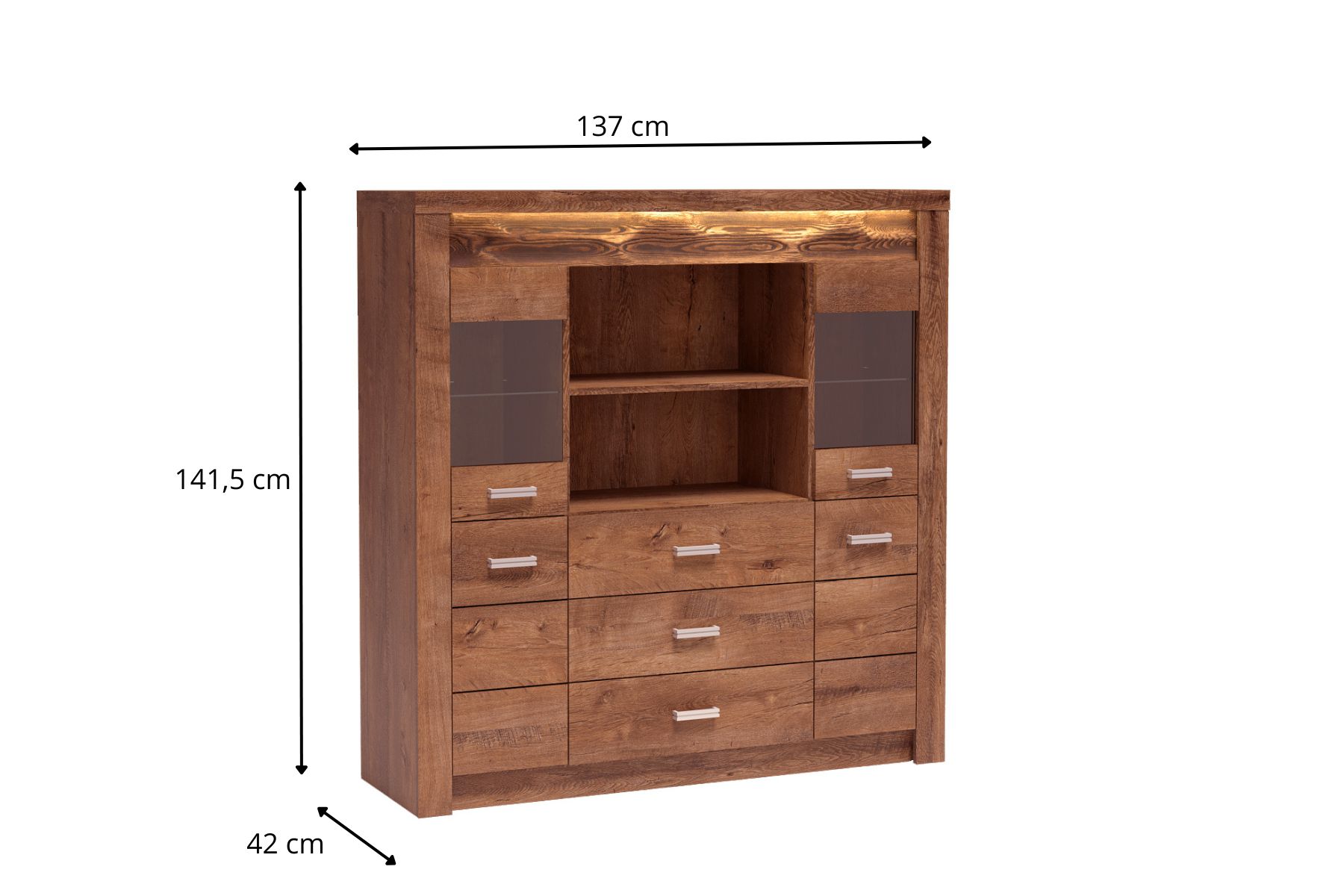 A large chest of drawers that will fit well in your home. It has three spacious drawers and five shelves for storing ornaments, souvenirs, porcelain sets, trinkets and more. Glass fronts will make it original and will give a great atmosphere in the room. Option with full fronts is possible. The chest of drawers is made of thick and good quality laminated boards and metal handles that emphasize the solidity of the furniture. Available in three colours