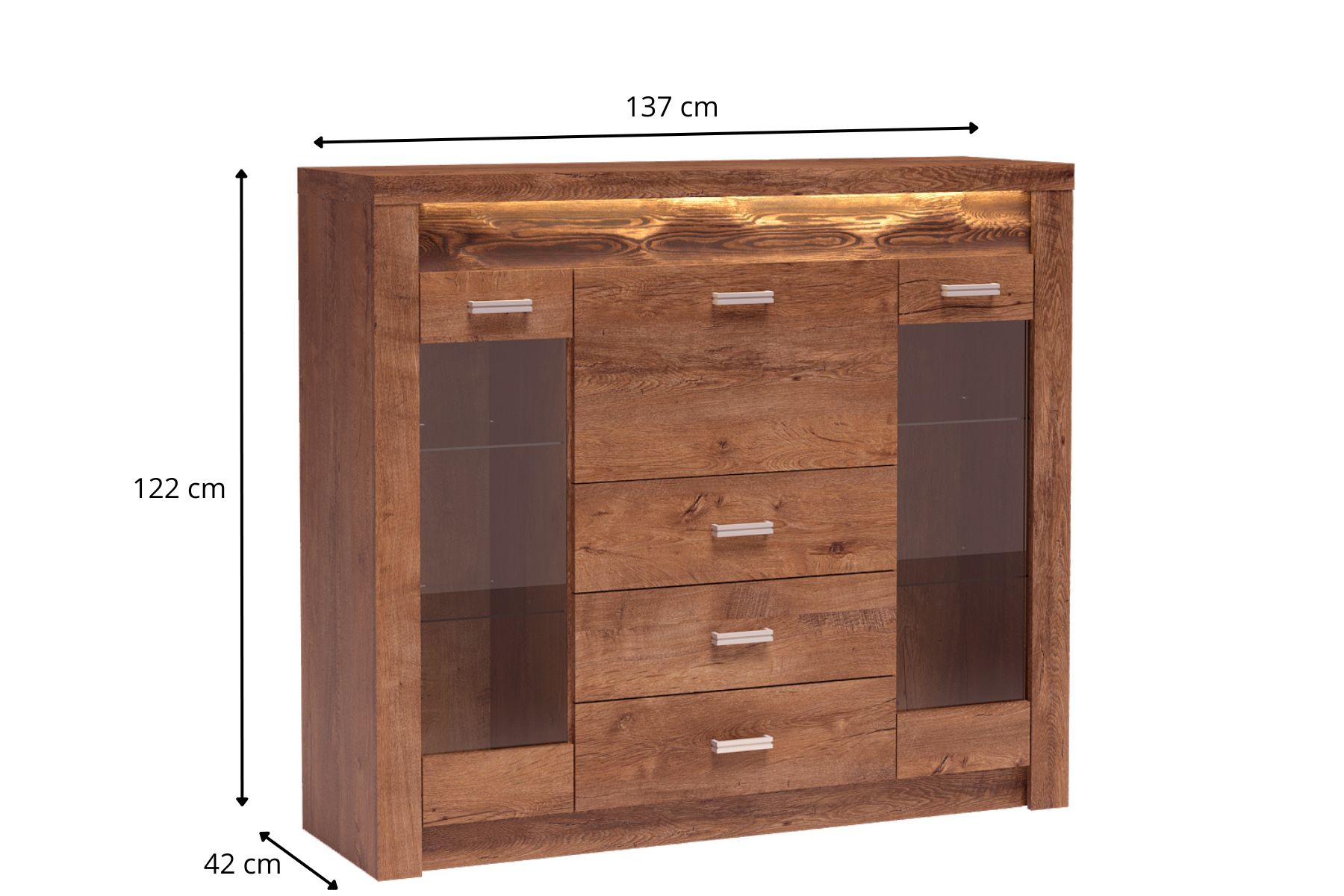 High chest of drawers with side windows with double glass shelves in the middle. In the center there are three deep drawers and a bar. The display cases are perfect for displaying books, porcelain or souvenirs. The furniture can accommodate a lot, it is capacious and original. It will fit into any room, living room, dining room or hallway. It will attract many guests. Metal handles emphasize attention to details. It is possible to buy a piece of furniture with full fronts. Available in three colours.