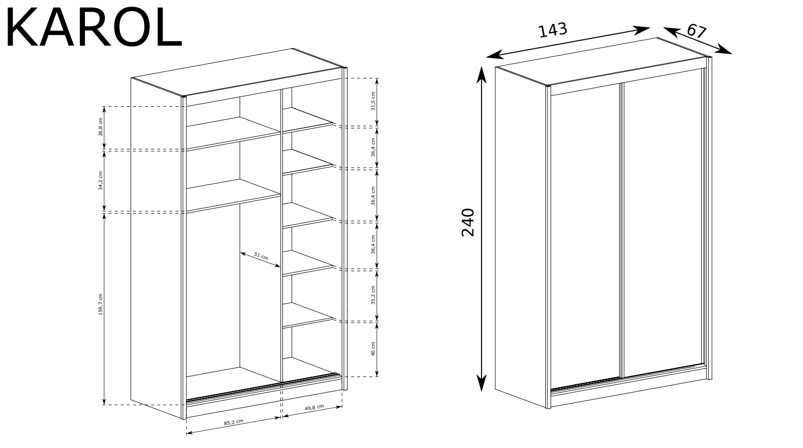 A small but capacious wardrobe with sliding doors. Perfect for small interiors, due to its depth, it allows you to store more things. There is also the option of additional shelves and mirrors that will enlarge a small space. Because of the possibility of selecting the colours of the bodies and fronts, it will certainly fit perfectly into our room.