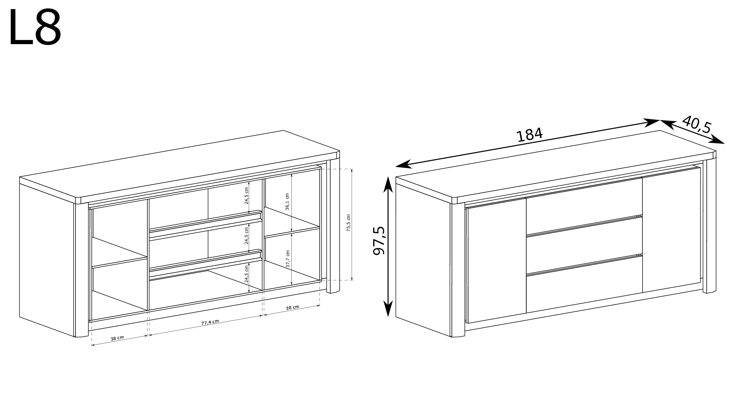 The largest chest of drawers from the LIVINIO collection. It is very wide – 184 cm! In the central part you will find three large drawers, sliding on slides with a soft close . The same system is used for the wardrobe doors. The piece of furniture is very stable and capacious. The combination of the colours of the front and the body used will fit perfectly into any interior. We can use the backlight available in the set, which will illuminate the chest of drawers .