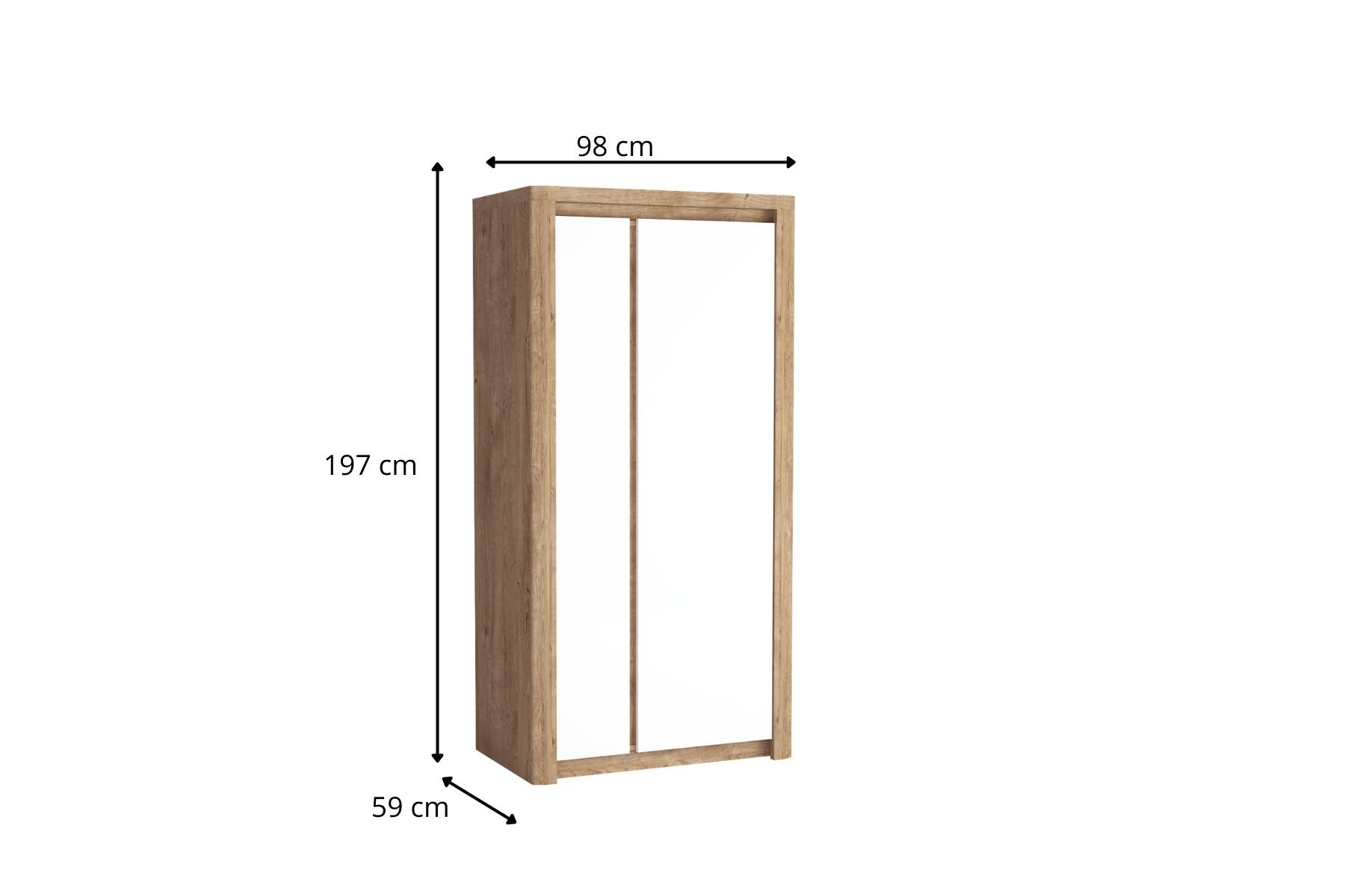 A modern two-door wardrobe in a warm, natural ribbeck colour combined with white. The wardrobe has a lot of space for clothes to hang, as well as shelves on which you can arrange documents, decorations and other accessories. White gloss fronts will enrich any interior and make the room look more interesting.