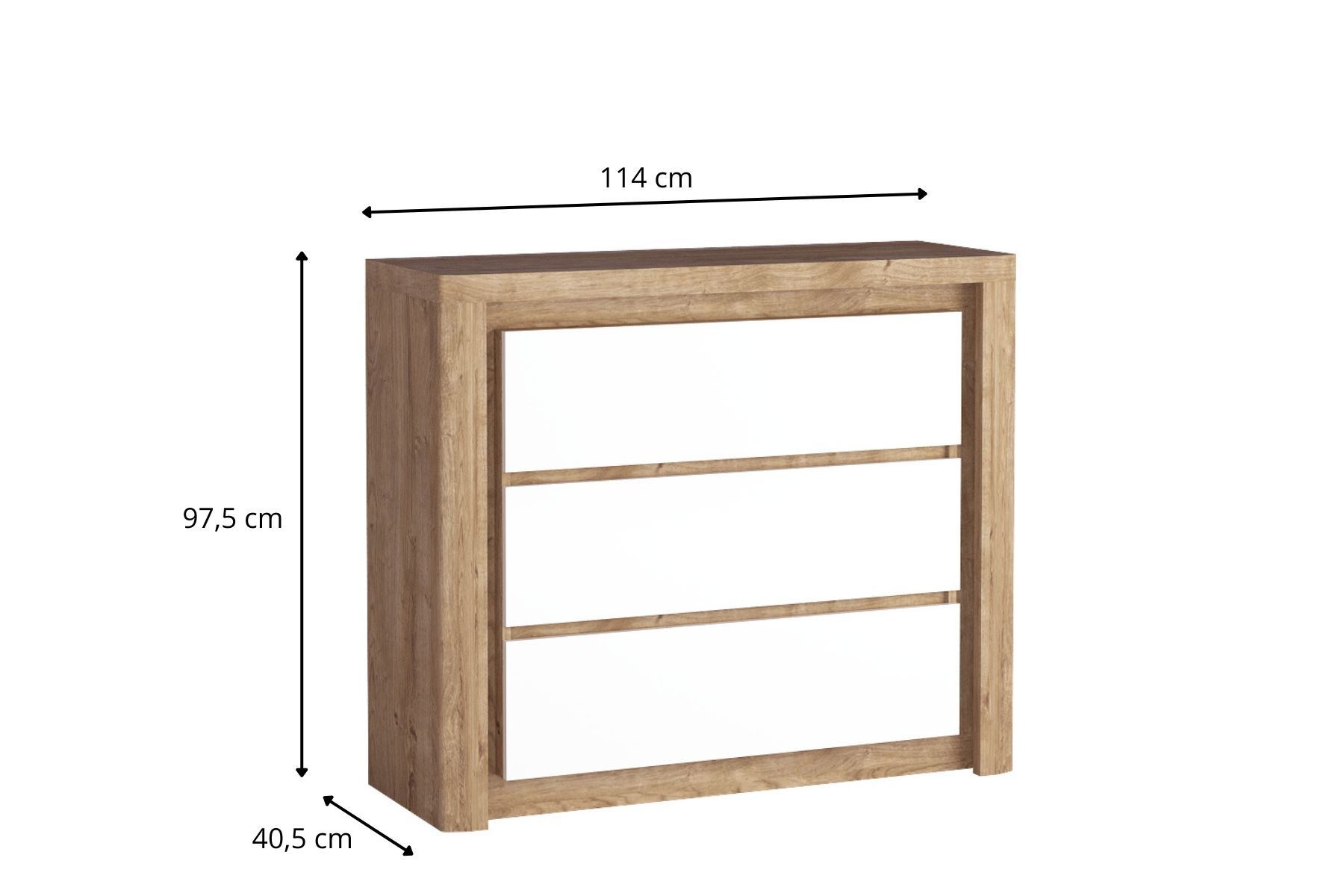Prosta komoda w nowoczesnym wydaniu z białymi frontami w połysku. Korpus mebla to laminowana płyta w kolorze ribbeck. Jest bardzo solida i okazała. Pomieści wiele naszych elementów garderoby. Wygodne trzy szuflady. Mebel do pokoju, sypialni czy salonu. Oświetlenie LED białych frontów z góry doda wyrazistości we wnętrzu. Prowadnice z systemem cichego domyku, wystarczy je lekko popchną a zamkną się same.