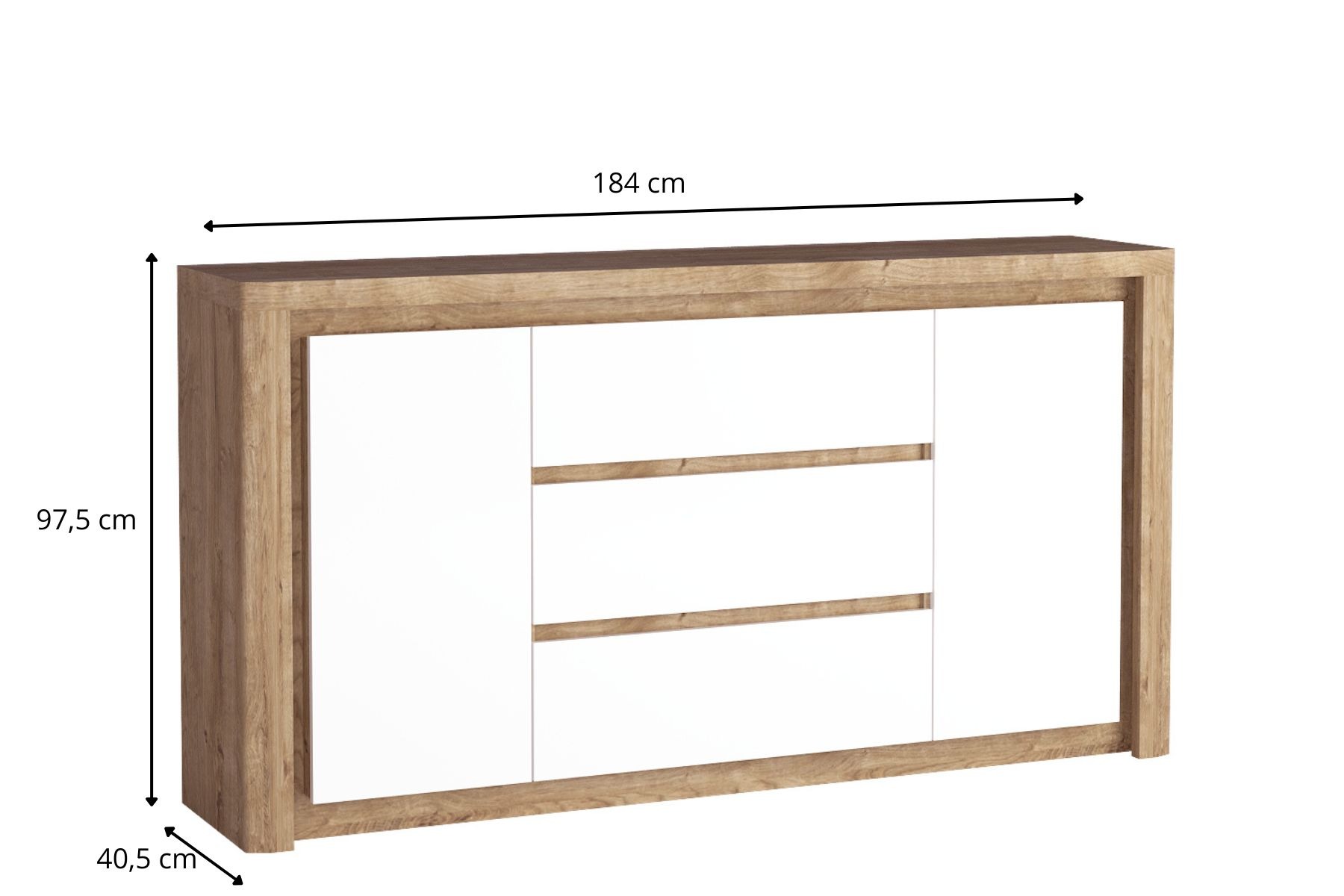 Największa komoda z kolekcji LIVINIO. Jest bardzo szeroka, ma aż 184 cm szerokości! W środkowej część znajdziemy trzy bardzo duże szuflady, wysuwane na prowadnicach z cichym domykiem. Taki sam system zastosowano w drzwiach od szaf. Mebel jest bardzo stabilny i pojemny. Użyte połączeni kolorów frontu i korpusu idealnie wpasuje się w każde wnętrze. Wykorzystać możemy podświetlenie dostępne w zestawie, które oświetli nam górę blatu jak i boki komody.