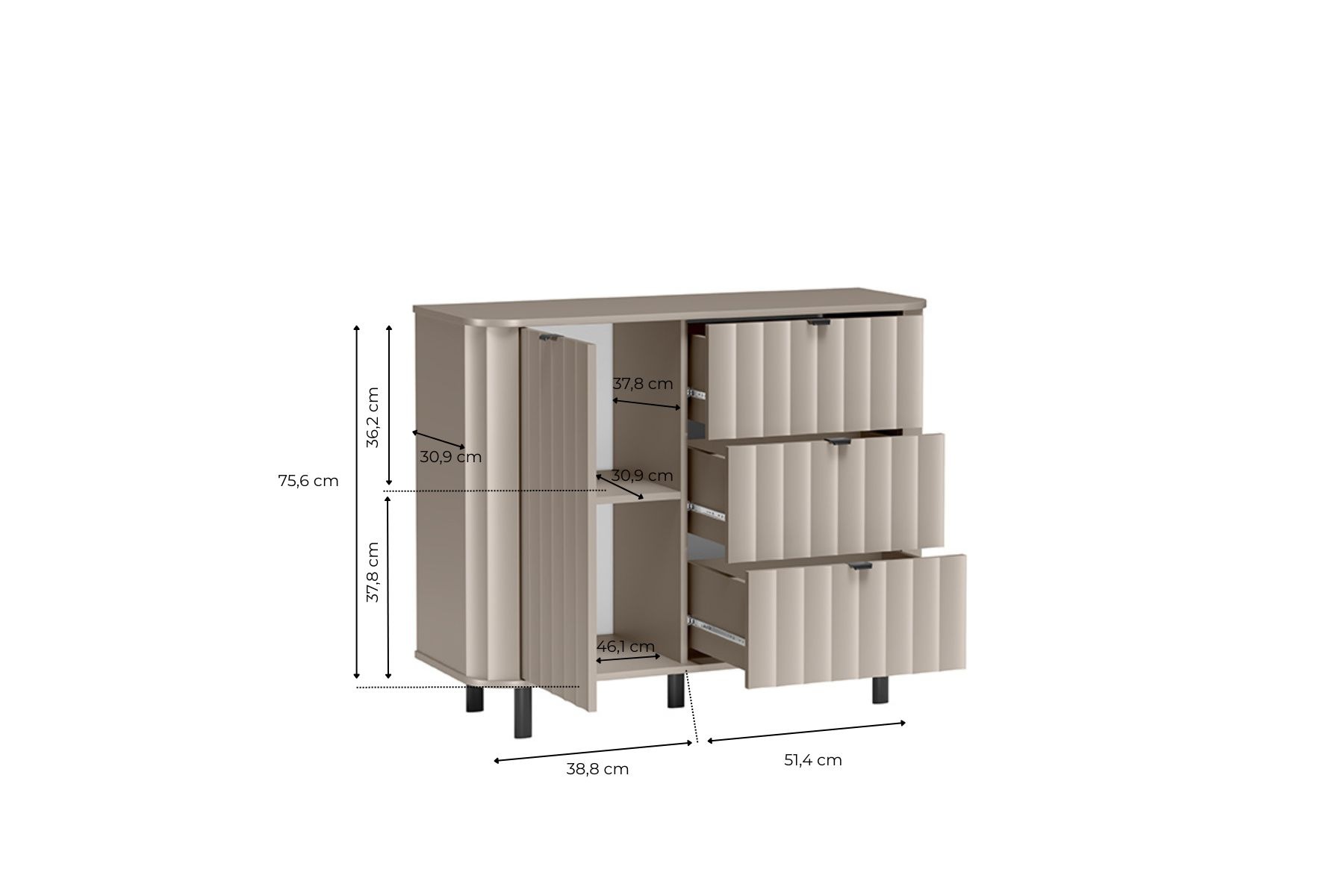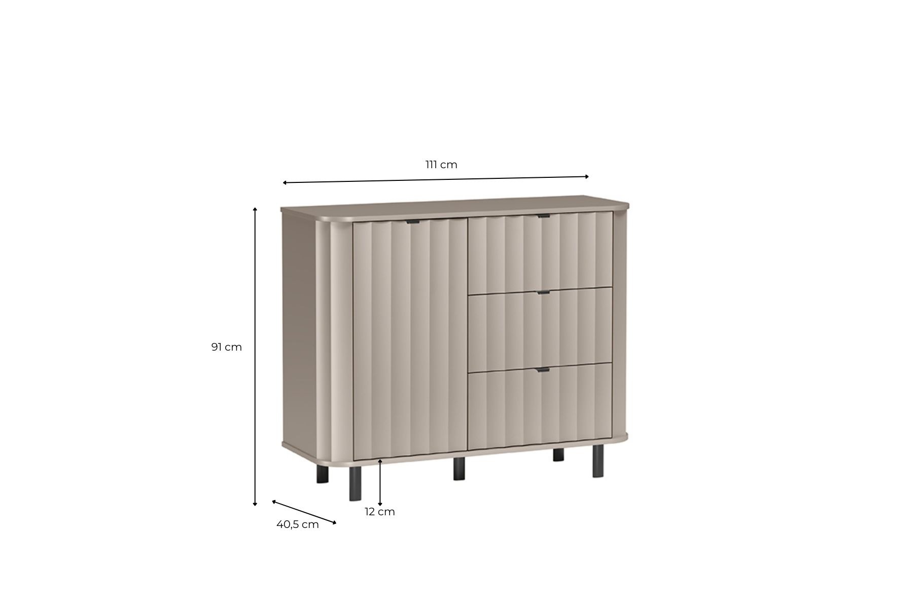 Komoda NOVADO-3 to eleganckie i funkcjonalne rozwiązanie do nowoczesnych wnętrz. Dzięki kompaktowej długości 111 cm świetnie sprawdzi się w salonie, sypialni lub przedpokoju. Wyposażona w trzy pojemne szuflady oraz zamykaną szafkę z półką, zapewnia wygodne przechowywanie różnych przedmiotów. Stylowe frezowane fronty MDF, zaokrąglone blaty oraz czarne metalowe nogi i uchwyty nadają jej wyjątkowego charakteru. Dodatkowym atutem jest system cichego domyku, który zwiększa komfort użytkowania. Dostępna w dwóch uniwersalnych kolorach – klasycznej bieli i eleganckim odcieniu Clay Gray.