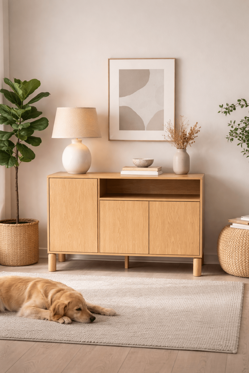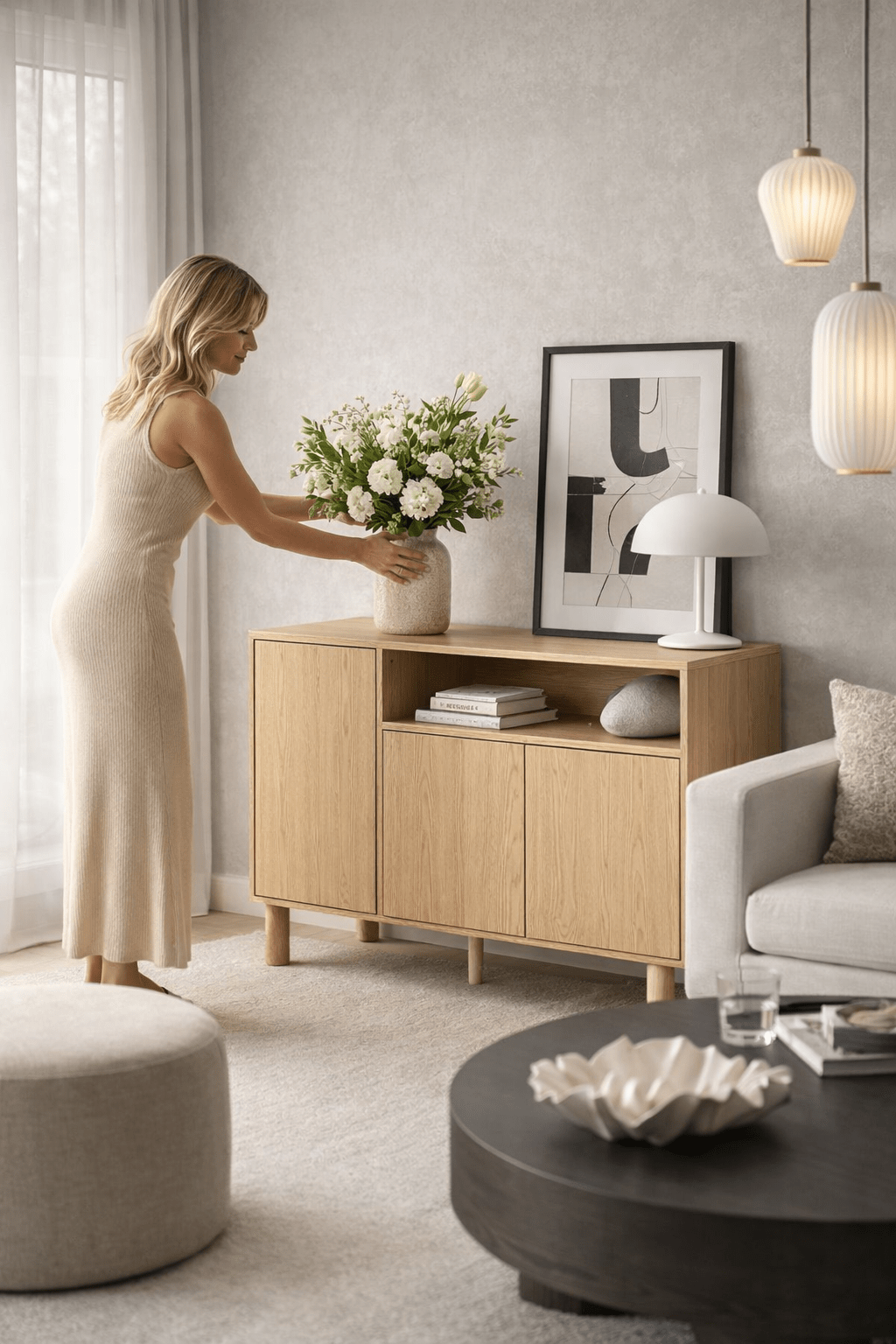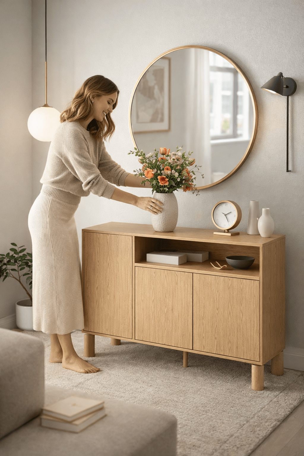 W salonie — SN-2 staje się naturalnym centrum ściany. Blat komody to idealne miejsce na lampę, rośliny, ulubione przedmioty. Szuflady skrywają to, czego nie trzeba pokazywać. Bookmatch na frontach działa jak naturalna dekoracja — przyciąga wzrok bez krzyku.
