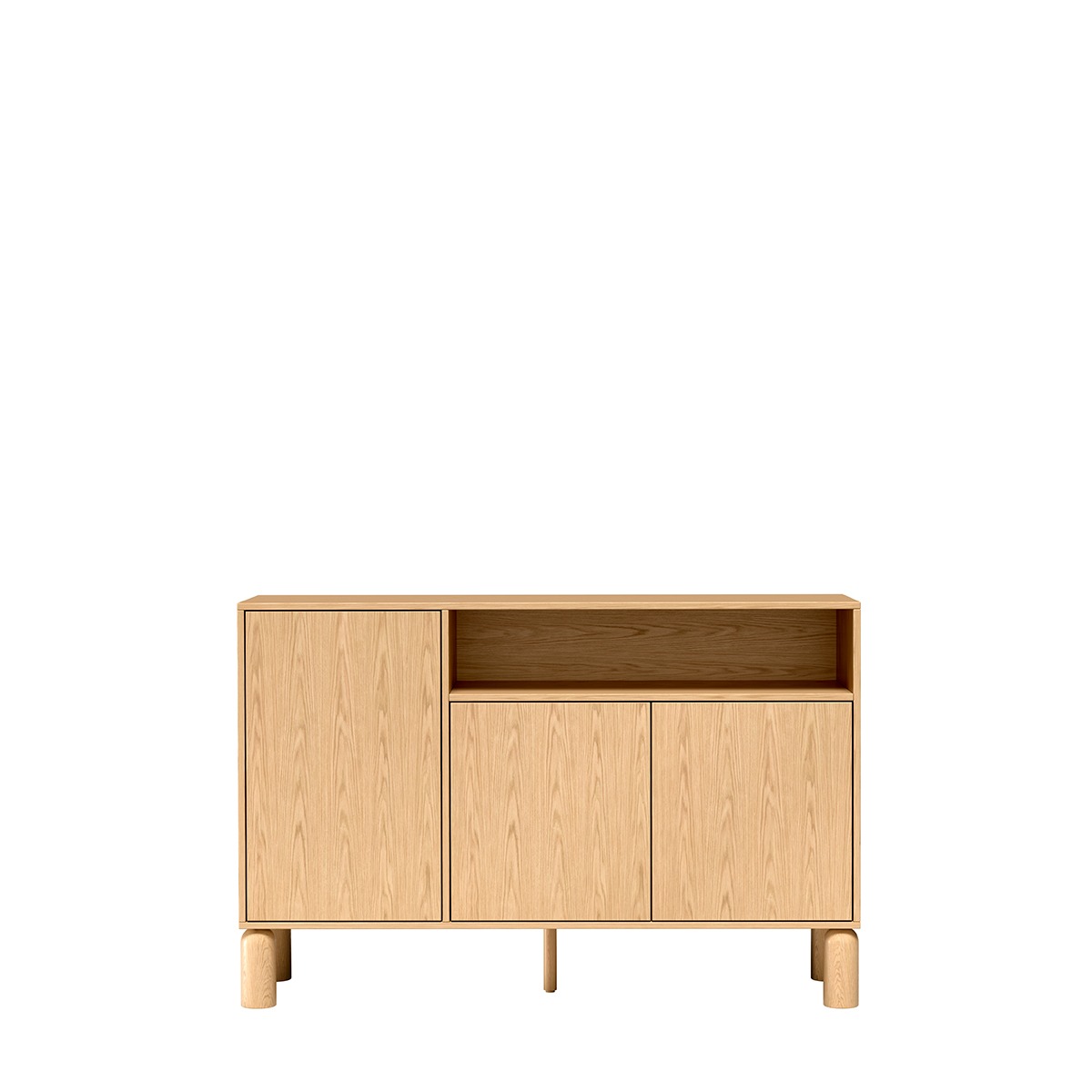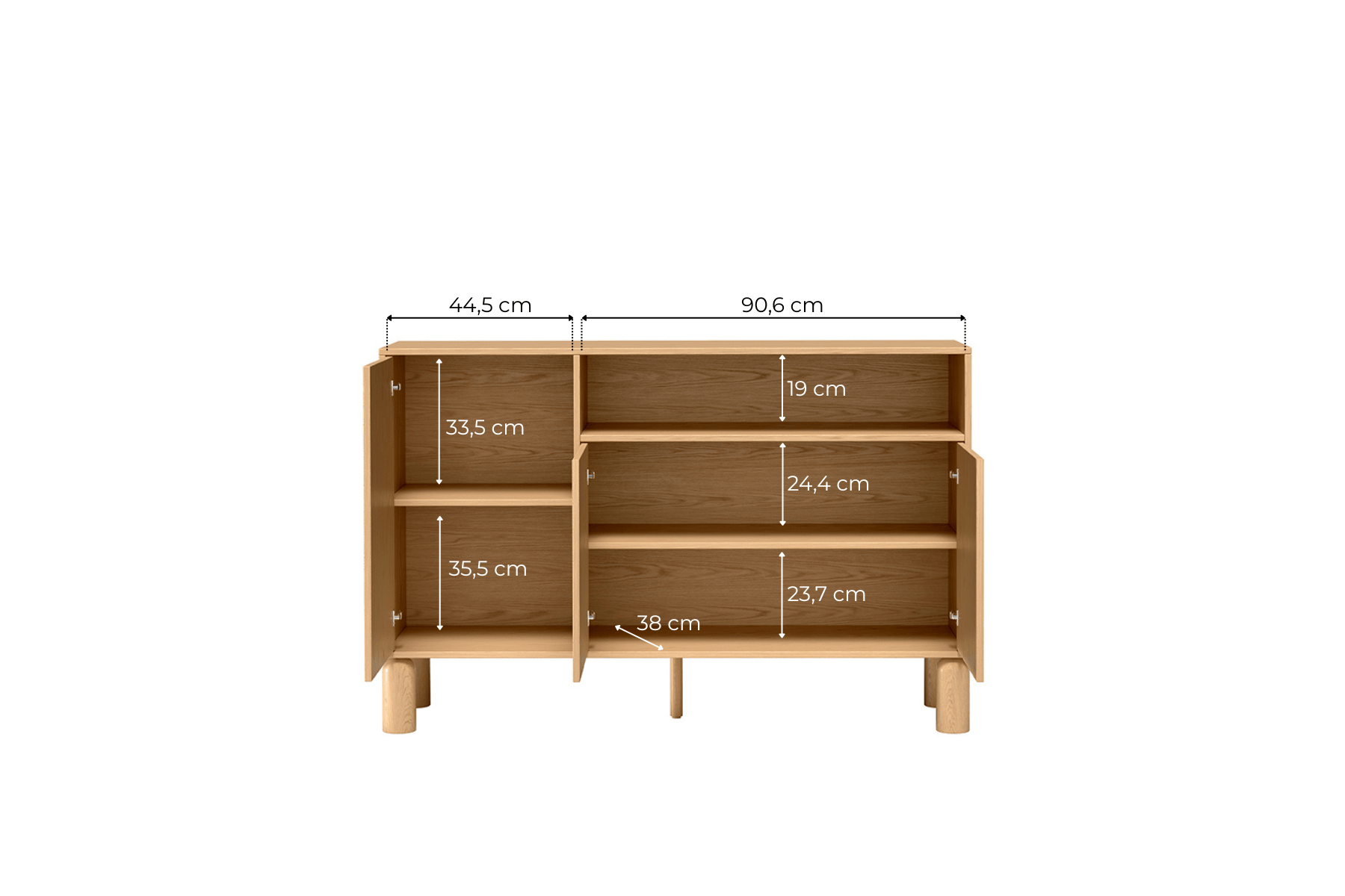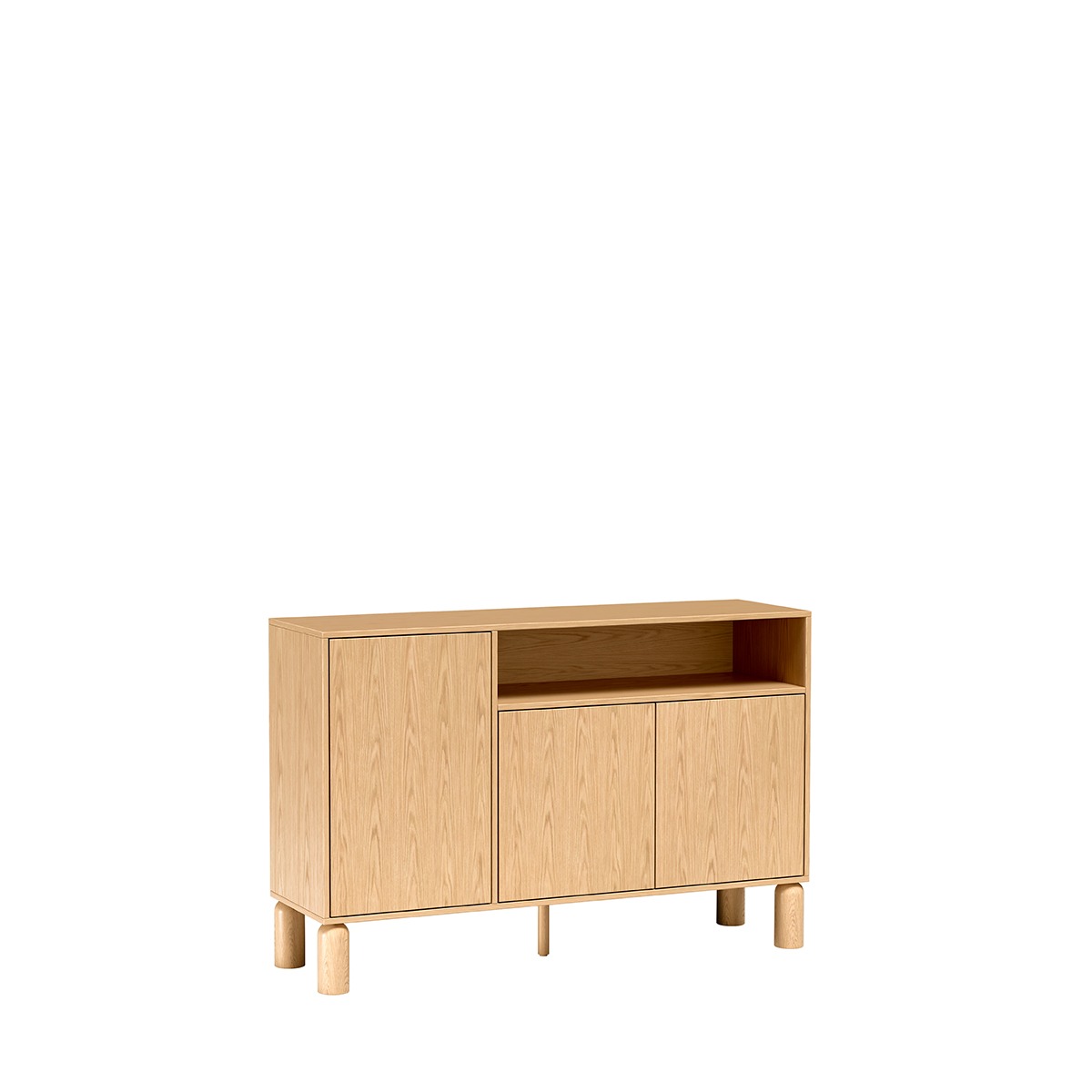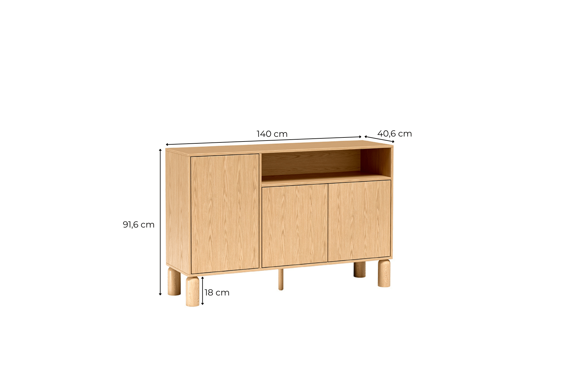Wysokie, toczne nogi dębowe o wysokości 18 cm unoszą komodę nad podłogą, nadając jej wizualnej lekkości. Dzięki nim mebel nie przyciąga podłogi — unosi się nad nią. Przestrzeń pod komodą zostaje wolna, łatwa do sprzątania, optycznie powiększająca wnętrze.