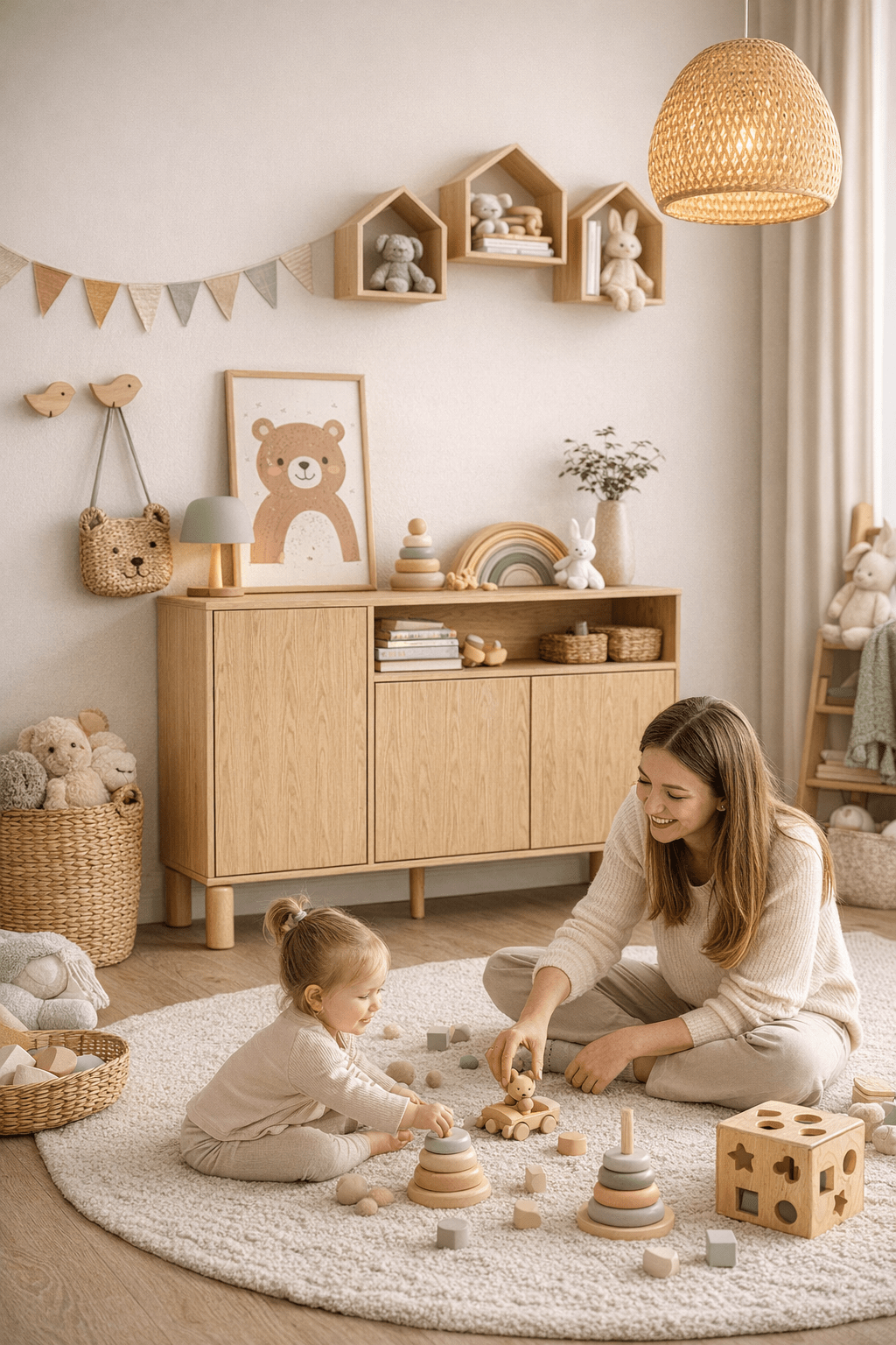 W pokoju dziecka — SN-2 to mebel, który rozumie chaos i zamienia go w porządek. Szuflady na ubranka, piżamki, skarpetki. Otwarta półka na ulubioną książeczkę i misia na dobranoc. Wysokie nogi ułatwiają sprzątanie pod spodem — bo wiadomo, co lubi wpadać pod meble. Łagodne formy i naturalne drewno tworzą przytulną, bezpieczną przestrzeń, w której dziecko czuje się dobrze.
