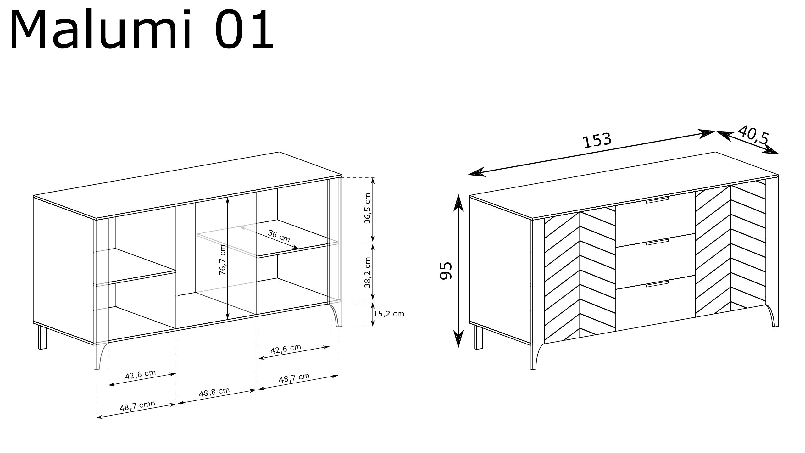 Elegancka i funkcjonalna komoda w kolorze głębokiej czerni, która doskonale wpasuje się w nowoczesne wnętrza. Wyróżnia ją unikalny wzór w jodełkę na frontach oraz minimalistyczne uchwyty, które podkreślają jej stylowy charakter.Komoda wyposażona jest w trzy pojemne szuflady oraz dwie zamykane szafki z półkami, które zapewniają doskonałą organizację przestrzeni. Wykonana z trwałych materiałów, co gwarantuje jej wytrzymałość i długowieczność. Smukłe, ale solidne nóżki nadają jej lekkości, a jednocześnie zapewniają stabilność. Idealna zarówno do salonu, sypialni, jak i przedpokoju.