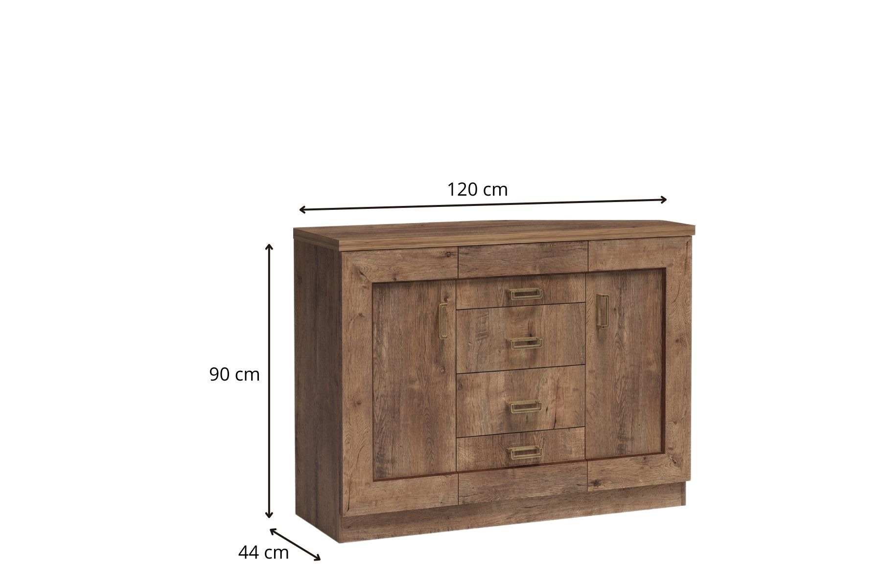 Mała, pojemna komoda z szafkami po bokach. Każda szafka posiada jedną półkę. Dodatkowo komoda posiada również cztery szuflady. Wszystkie fronty wykończone są metalowymi uchwytami nadającymi rustykalnego stylu.
