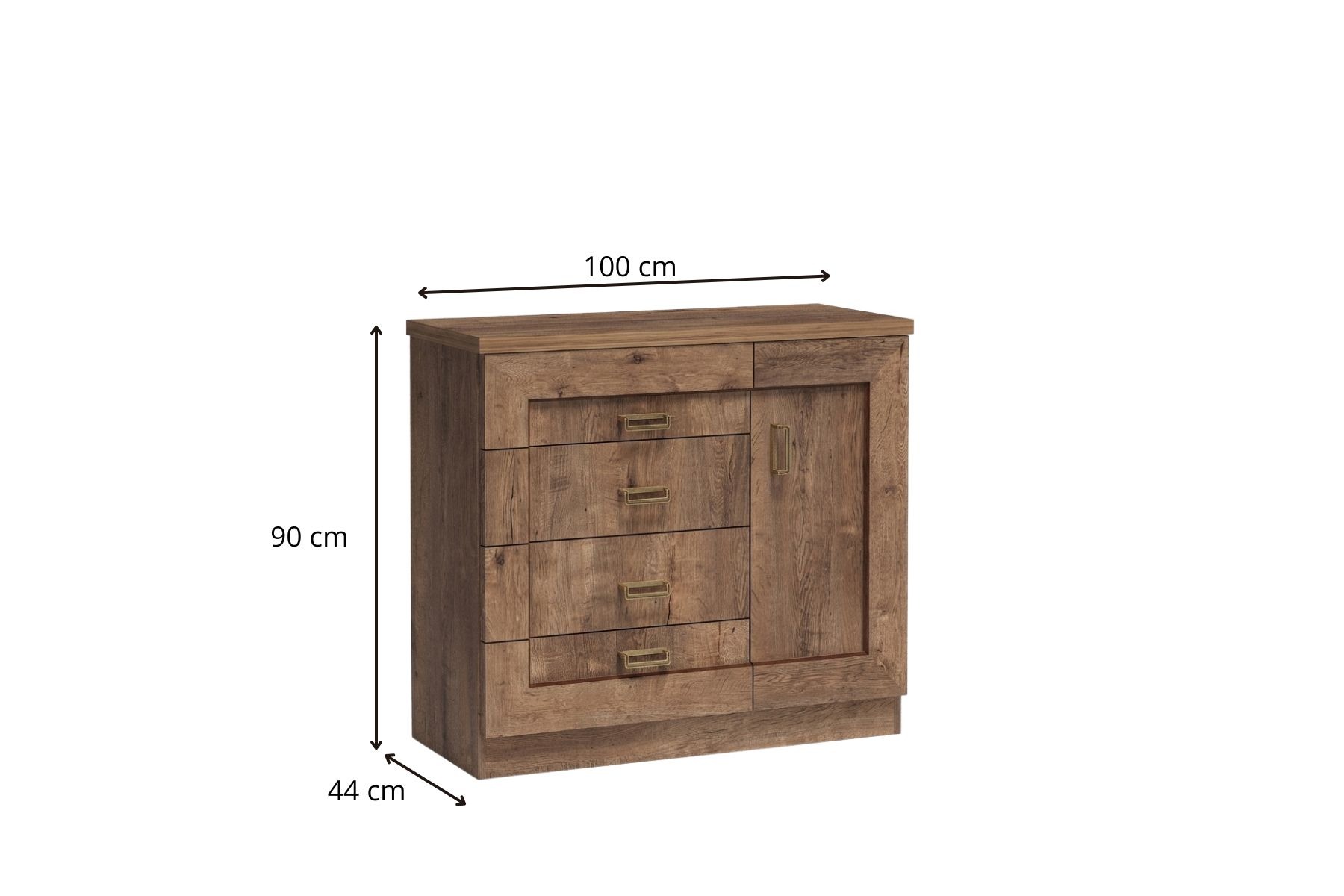Ta prosta komoda to kwintesencja praktyczności, zaprojektowana z myślą o efektywnym wykorzystaniu każdego centymetra. Jej asymetryczny podział na szuflady i szafkę wnosi do wnętrza dynamikę, zachowując jednocześnie spokojny, tradycyjny charakter.
