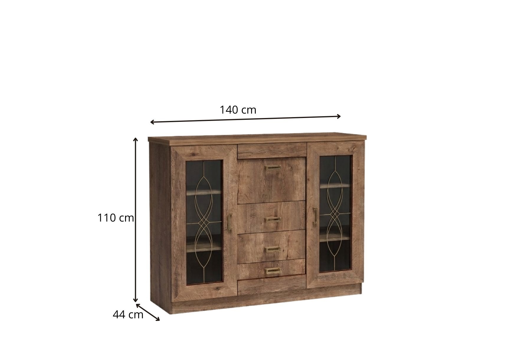 Wysoka komoda z barkiem oraz przeszklonymi frontami z szykownym wzorkiem. Świetnie sprawdzi się w salonie lub jadalni. Pojemna i elegancka z trzema szufladami. Dostępna w dwóch wybarwieniach.