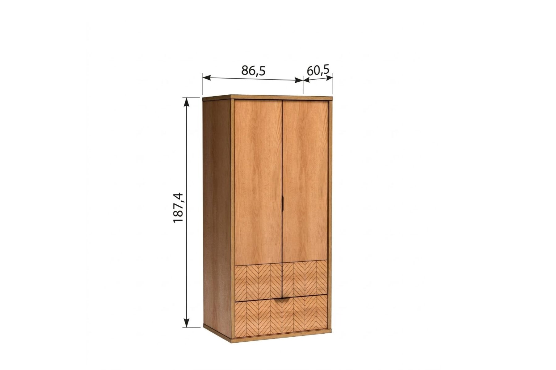 Prosta, funkcjonalna szafa dwudrzwiowa w kolorze dąb karmel z kolekcji FONTI. W dolnej części znajdziemy dużą, pojemną szufladę na bieliznę czy drobiazgi. Po prawej stronie znajdują się półki, które pozwalają na wygodne ułożenie ubrań. Po lewej stronie w górnej części znajdziemy półkę, a pod nią drążek do wieszania ubrań.