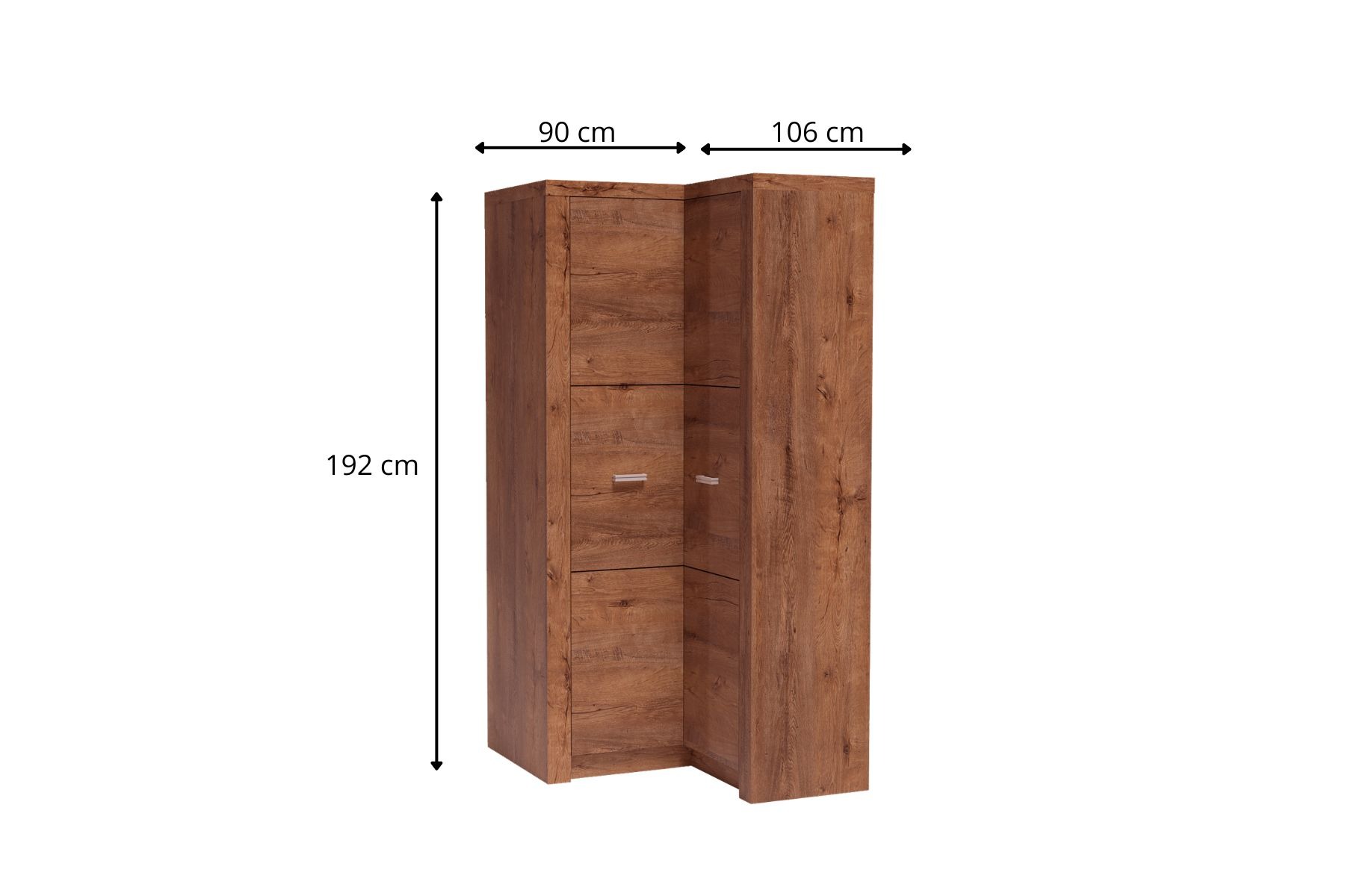 Szafa narożna z kolekcji Indianapolis. Mebel jest bardzo pojemny, co da możliwość łatwej organizacji i łatwego zagospodarowania miejsca. Lewa strona posiada jedną półkę oraz drążek, co pozwala zapełnić przestrzeń, która znajduje się pod drążkiem. Po prawej stronie szafy znajdują się cztery półki, które są ideale do pomieszczenia ubrań, które można poskładać. Szafa idealnie wpasuje się w każdy kąt, doda pomieszczeniu ciepła i uroku. Dostępna jest opcja trzech półek, które będą dostawione do lewej strony. Metalowe uchwyty podkreślają akcent mebla. Możliwa jest również opcja odwrotna. Dostępna w trzech wybarwieniach.
