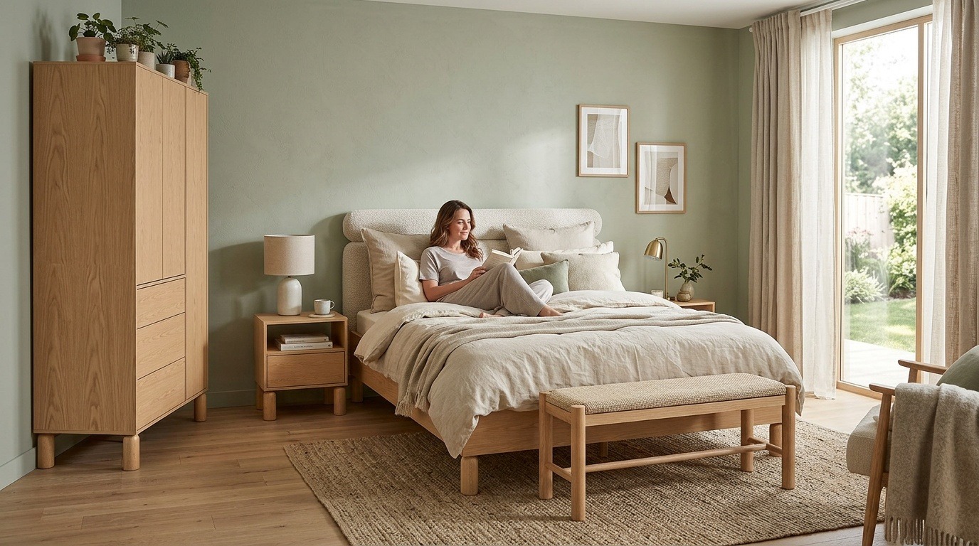 Łóżko S-12 to centrum spokojnej, skandynawskiej sypialni, gdzie prostota formy łączy się z funkcjonalnością i komfortem. Rama wykonana z naturalnego dębu bookmatch prezentuje unikalne, symetryczne wzory słojów, tworząc harmonijną kompozycję, która wprowadza ciepło i naturalność do wnętrza. Tapicerowany zagłówek w jasnym, neutralnym odcieniu dodaje miękkości i komfortu, tworząc przytulne oparcie podczas czytania czy odpoczynku. Wysokie 18-centymetrowe dębowe nogi unoszą łóżko nad podłogą, optycznie powiększając sypialnię i ułatwiając utrzymanie czystości. Minimalistyczna forma bez zbędnych ozdób podkreśla skandynawską filozofię „less is more” – wszystko, czego potrzebujesz, nic, czego nie potrzebujesz. Solidna konstrukcja zapewnia stabilność i trwałość na lata. Łóżko S-12 doskonale komponuje się z innymi meblami z kolekcji Sanden, tworząc spójną, harmonijną sypialnię pełną spokoju i naturalnego piękna.