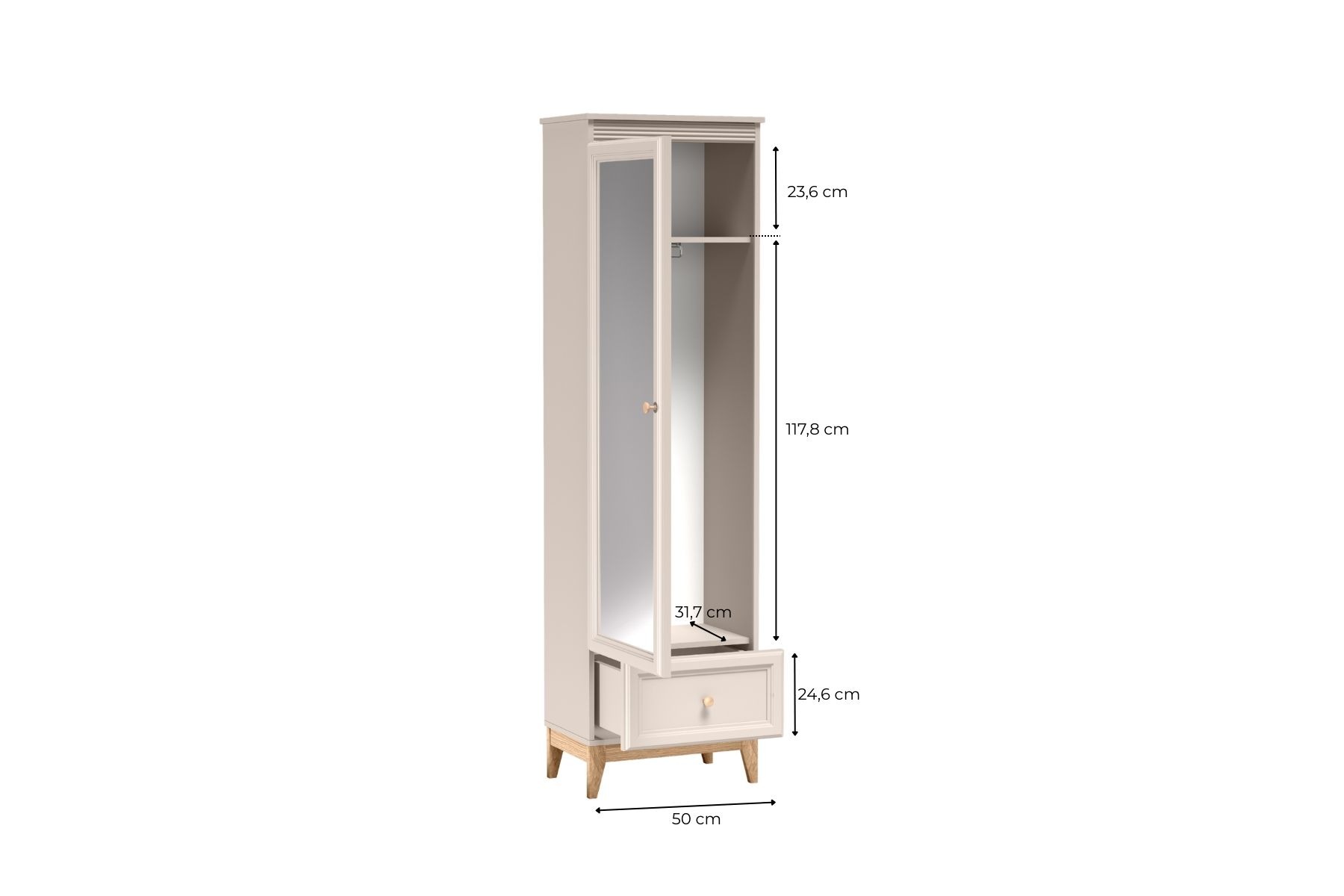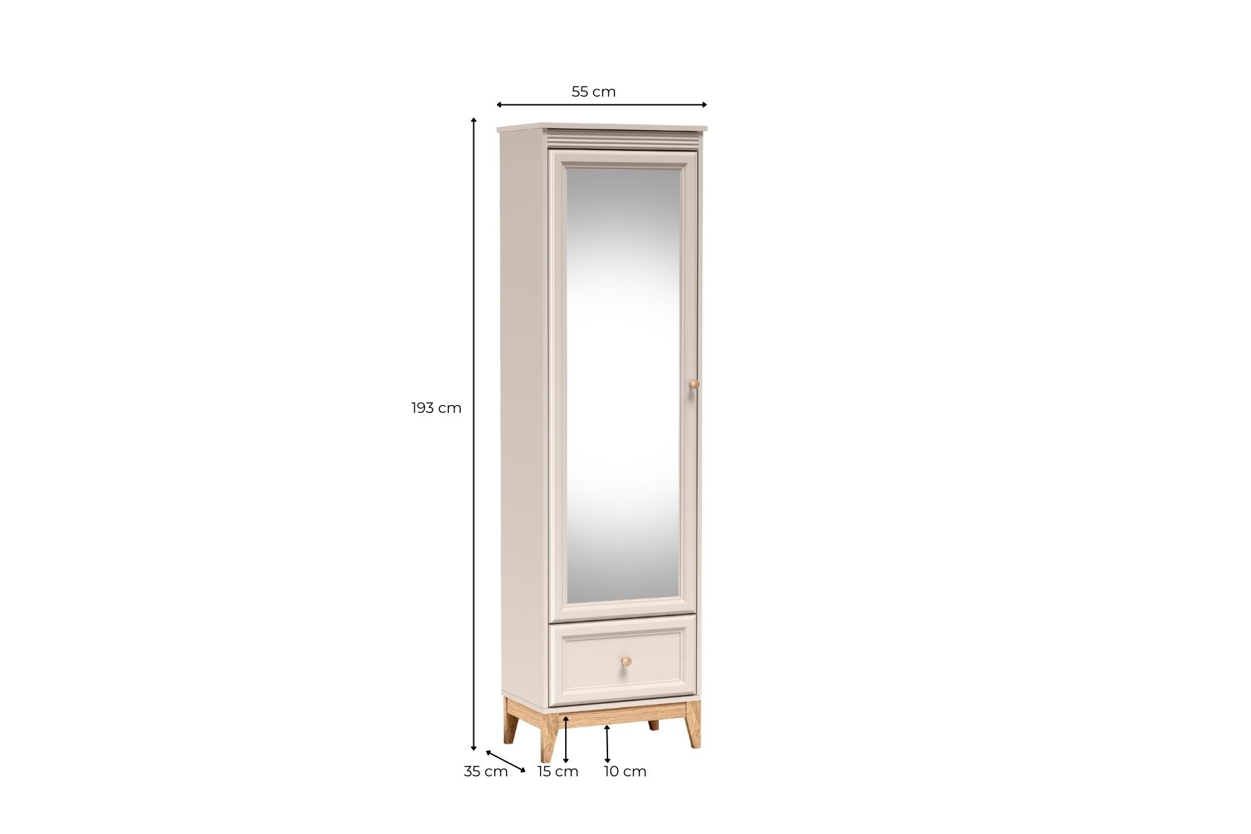Wysoka, smukła bryła optycznie powiększa przestrzeń, a duże lustro na froncie nadaje lekkości i funkcjonalności – doskonale sprawdzi się podczas codziennego przygotowywania do wyjścia.