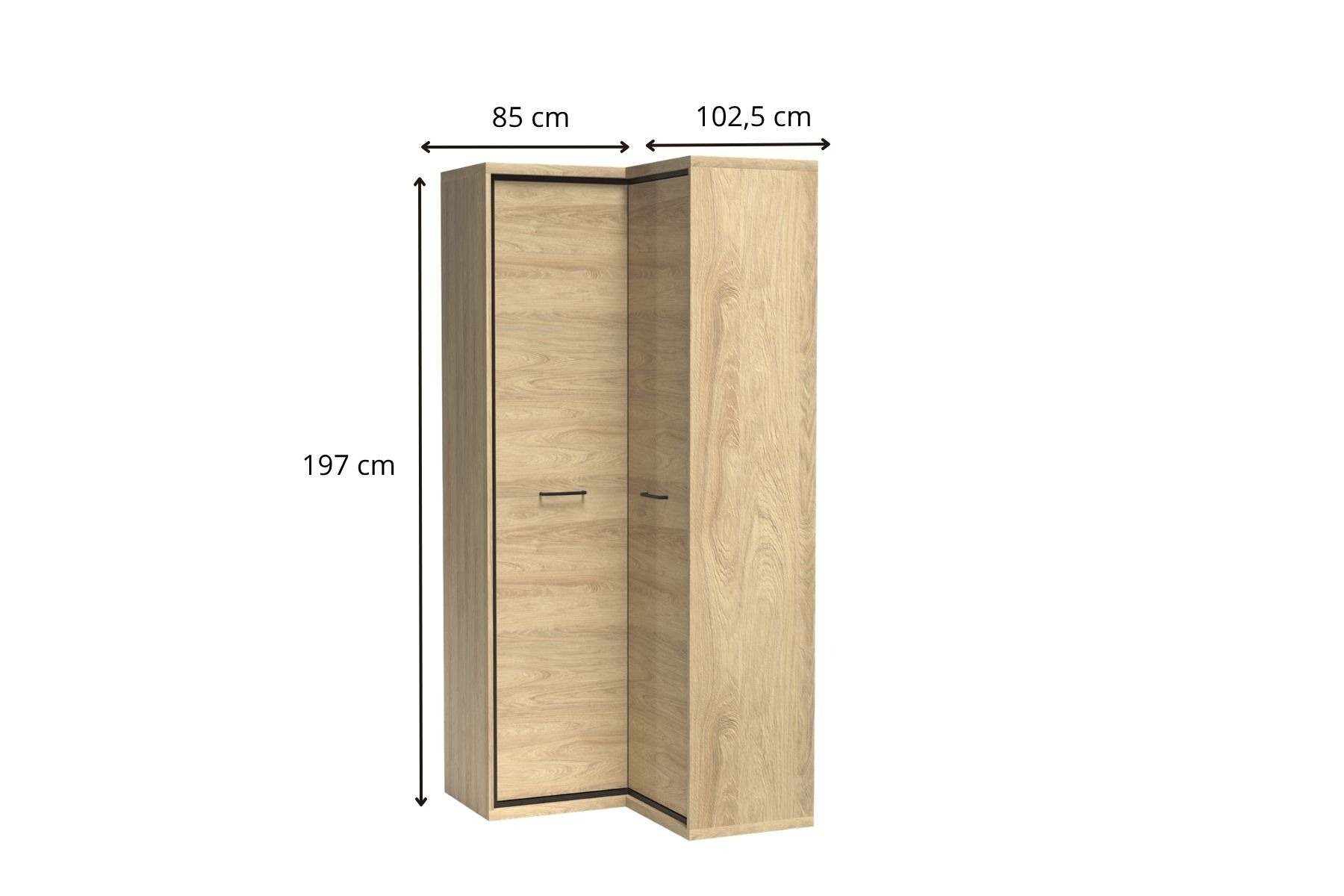 Narożna, pojemna szafa dwudrzwiowa z uchwytami do przechowywania ubrań. Dzięki opcji dodatkowych półek możemy zyskać mnóstwo miejsce. Rzadko spotykane rozwiązanie wśród szaf. Mebel w środku ma drążek do wieszania ubrań, a nad nim półkę. Szafa idealnie nada się do uzupełniania niewykorzystanego miejsca w pokoju. Kolor naturalnego drewna oraz ciemne, ozdobne listwy w stylu loftowym ocieplają wnętrze.