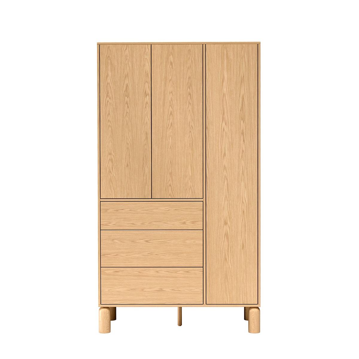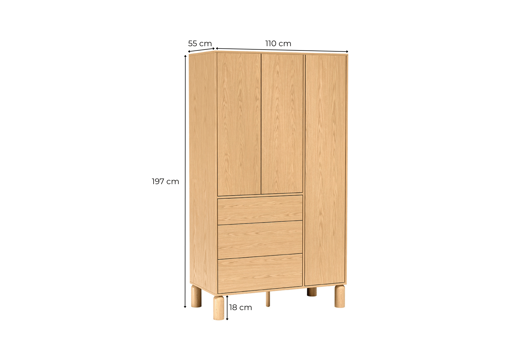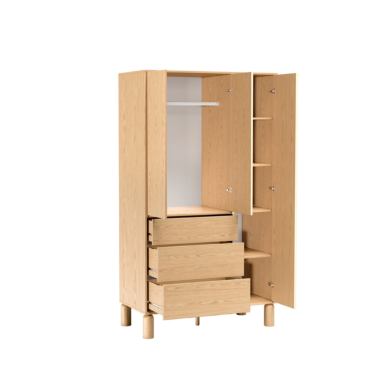 Szafa S-9 to wszechstronne rozwiązanie do sypialni lub garderoby, łączące przestrzeń na ubrania wiszące z praktycznymi szufladami. Górna część z drzwiami kryje drążek na wieszaki, idealny do przechowywania koszul, sukienek czy marynarek, podczas gdy dolne szuflady z systemem push to open oferują miejsce na bieliznę, T-shirty czy akcesoria. Fronty wykonane z naturalnego dębu bookmatch tworzą harmonijną, symetryczną kompozycję słojów – każda szafa jest unikalna, jak odcisk palca natury. Gładka powierzchnia bez uchwytów podkreśla minimalistyczny charakter mebla i ułatwia codzienne użytkowanie. System push to open pozwala na bezproblemowe otwieranie dotykiem – wystarczy delikatne pchnięcie. Wysokość 197 cm zapewnia maksymalną pojemność, a wysokie 18-centymetrowe dębowe nogi nadają lekkości i pozwalają na łatwe sprzątanie. To mebel stworzony dla tych, którzy cenią porządek i skandynawską estetykę.
