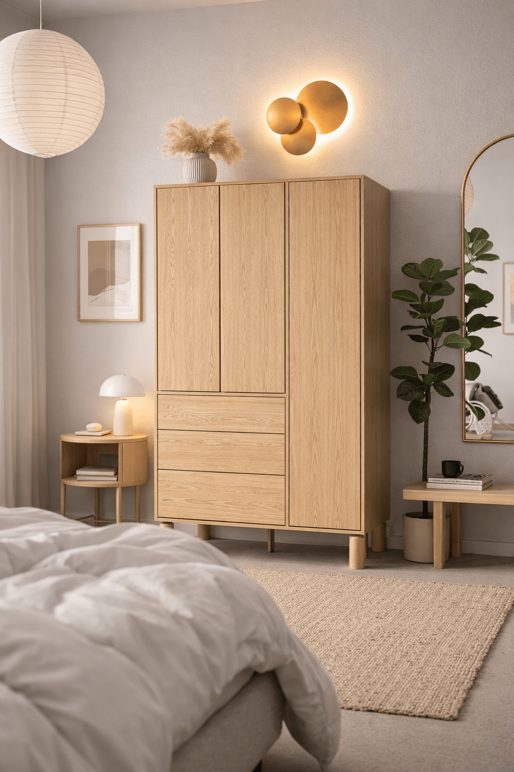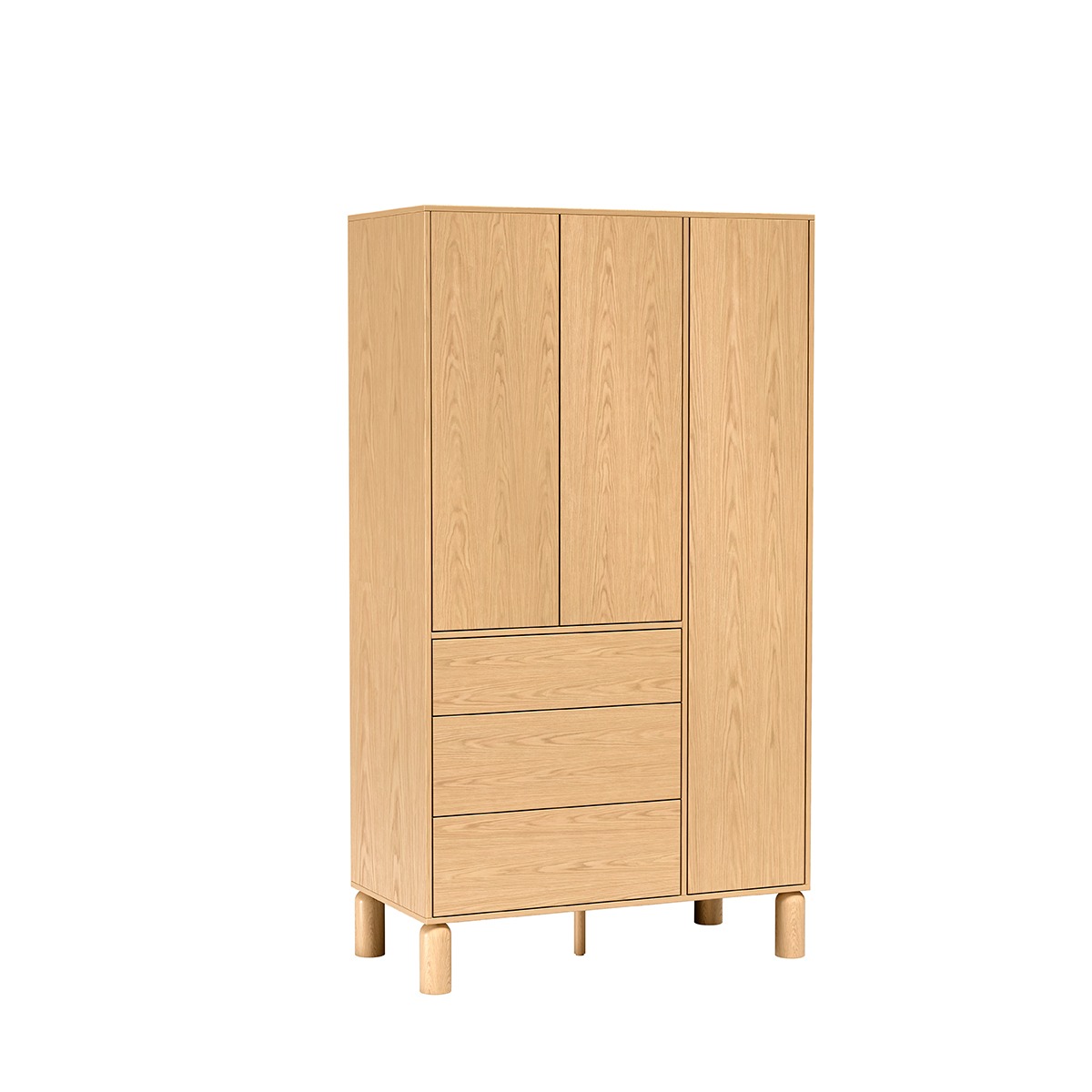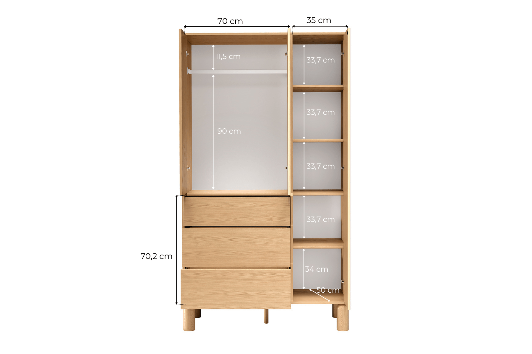 Szafa S-9 to wszechstronne rozwiązanie do sypialni lub garderoby, łączące przestrzeń na ubrania wiszące z praktycznymi szufladami. Górna część z drzwiami kryje drążek na wieszaki, idealny do przechowywania koszul, sukienek czy marynarek, podczas gdy dolne szuflady z systemem push to open oferują miejsce na bieliznę, T-shirty czy akcesoria. Fronty wykonane z naturalnego dębu bookmatch tworzą harmonijną, symetryczną kompozycję słojów – każda szafa jest unikalna, jak odcisk palca natury. Gładka powierzchnia bez uchwytów podkreśla minimalistyczny charakter mebla i ułatwia codzienne użytkowanie. System push to open pozwala na bezproblemowe otwieranie dotykiem – wystarczy delikatne pchnięcie. Wysokość 197 cm zapewnia maksymalną pojemność, a wysokie 18-centymetrowe dębowe nogi nadają lekkości i pozwalają na łatwe sprzątanie. To mebel stworzony dla tych, którzy cenią porządek i skandynawską estetykę.