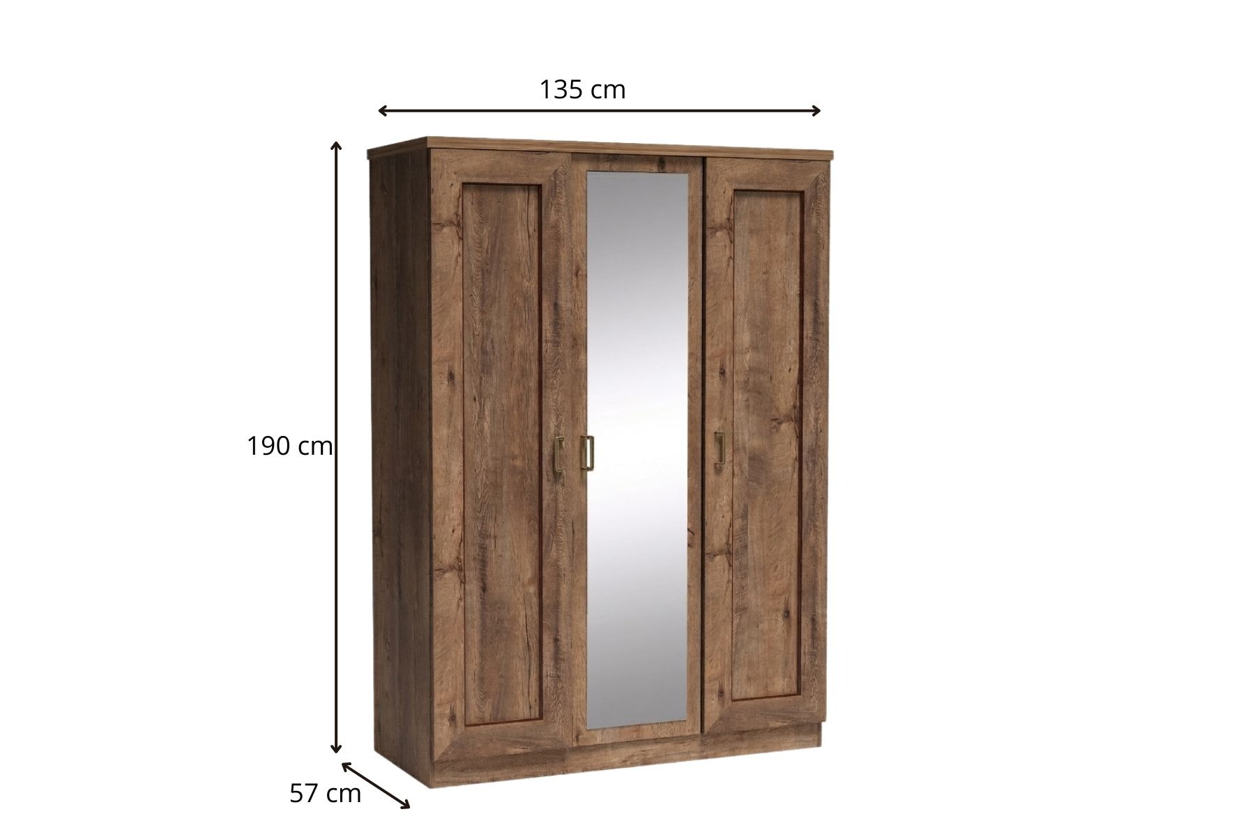 Duża szafa trzydrzwiowa z lustrem, które optycznie powiększa przestrzeń. Po jednej stronie drążek na ubrania wieszane na wieszakach. Nad nim znajduje się jedna praktyczna półka. Po drugiej stronie półki na rzeczy poskładane lub pościele. Cała szafa świetnie odnajdzie się w stylu rustykalnym. Dostępna w dwóch wybarwieniach.