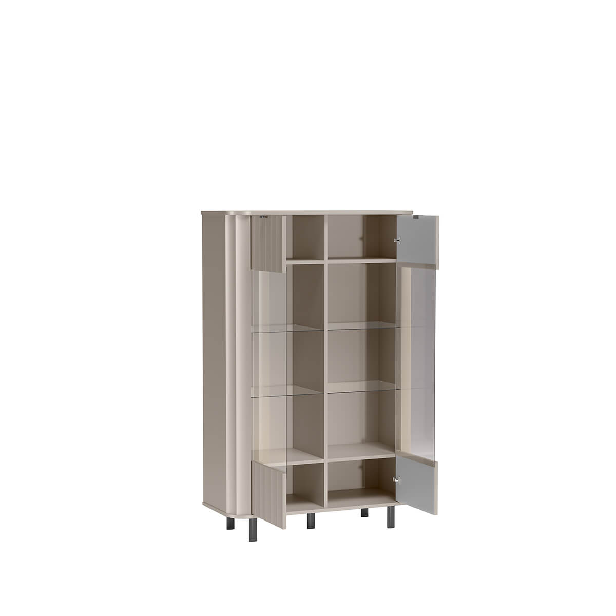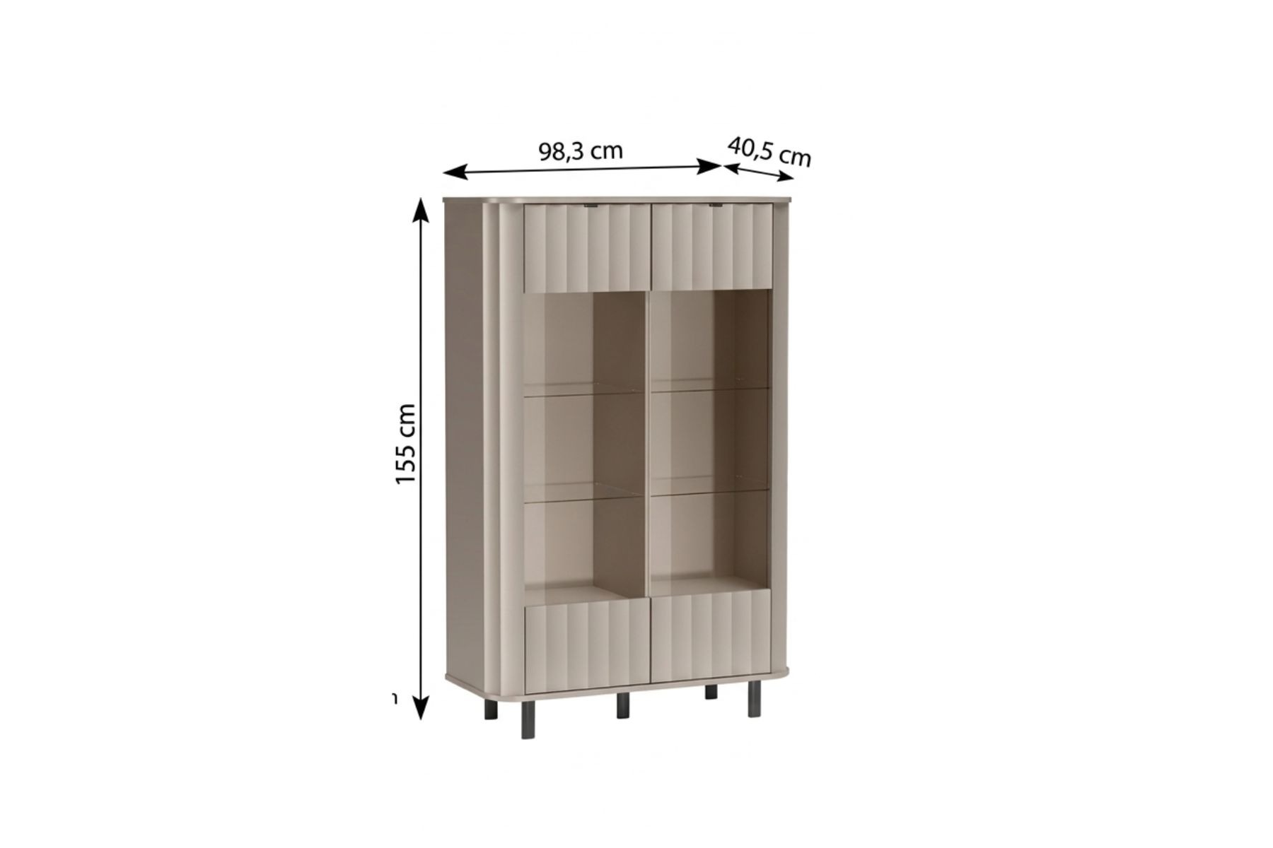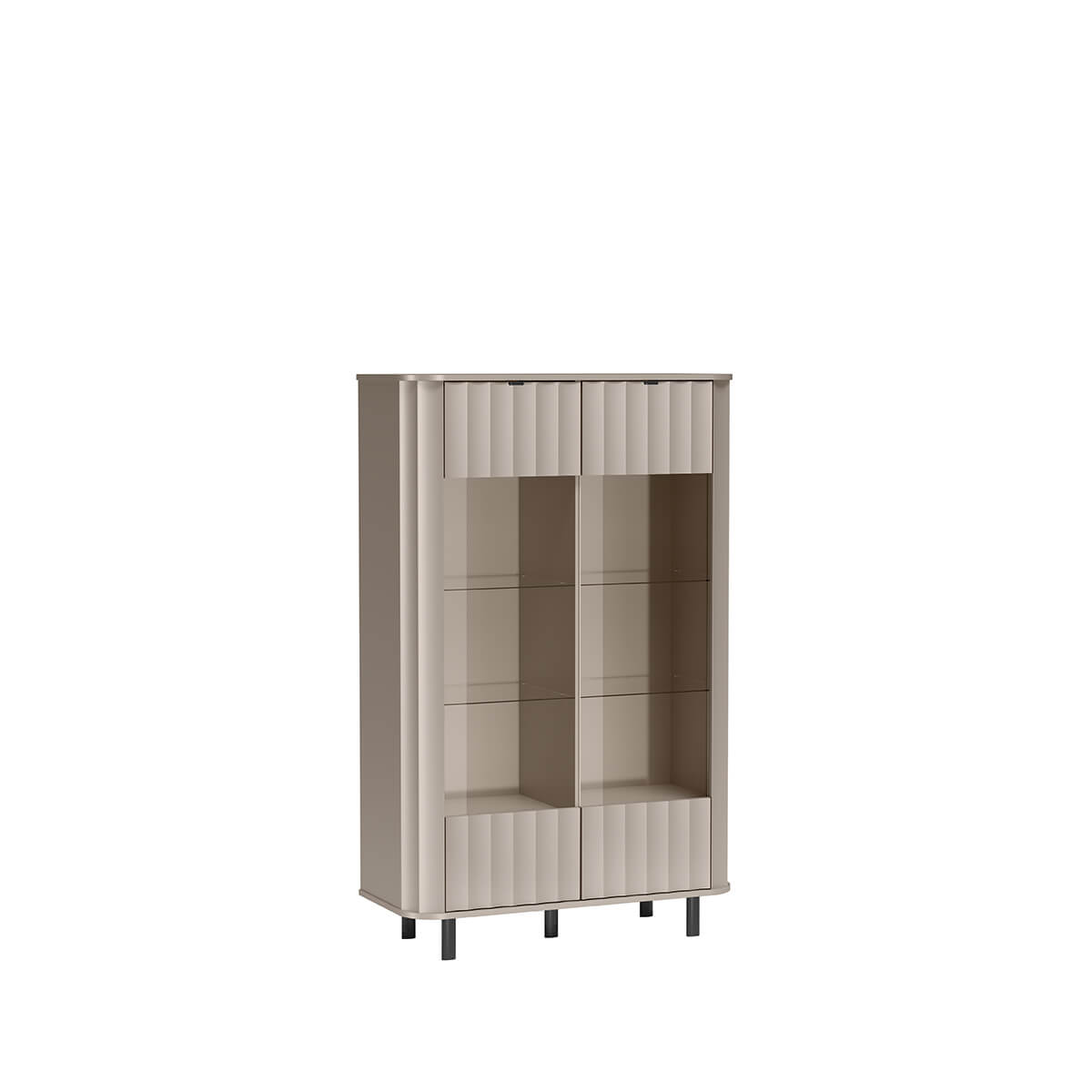 Estetyka kolekcji NOVADO objawia się tu w wielu detalach: zaokrąglone krawędzie nadają miękkości bryle, a smukłe, owalne nogi i minimalistyczne, metalowe uchwyty stanowią dopełnienie nowoczesnego charakteru mebla. Witryna dostępna jest w dwóch wariantach kolorystycznych – delikatnej bieli oraz modnym clay gray – dzięki czemu z łatwością dopasuje się do różnych aranżacji wnętrz.