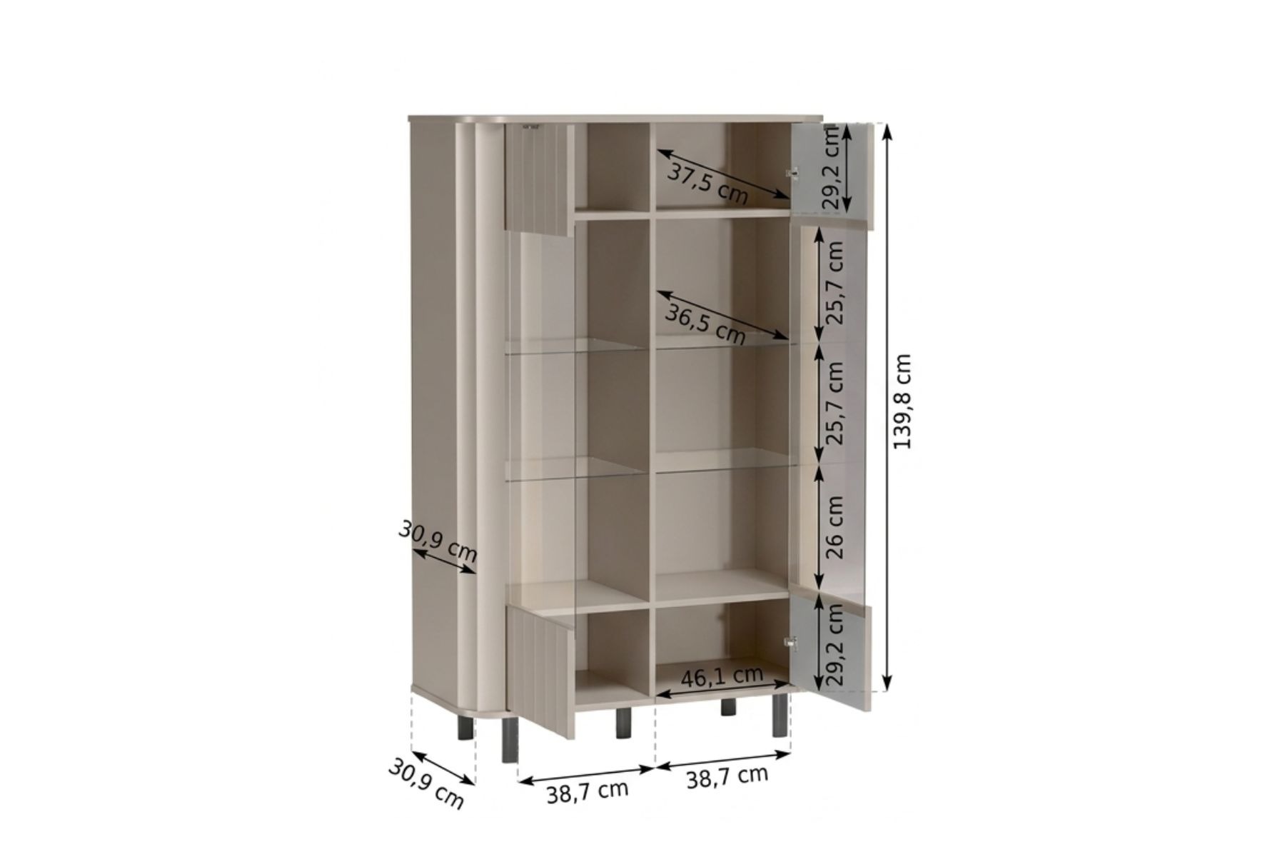 Wysoka i smukła forma witryny doskonale sprawdzi się w salonie, jadalni czy nawet w domowym biurze. Cztery szklane półki oferują przestrzeń idealną do prezentacji zastawy stołowej, dekoracji, kolekcji książek czy pamiątek. Dzięki zastosowaniu szkła mebel zyskuje wizualną lekkość, nie przytłaczając wnętrza – a przy tym wprowadza w nie nutę nowoczesnej elegancji.
