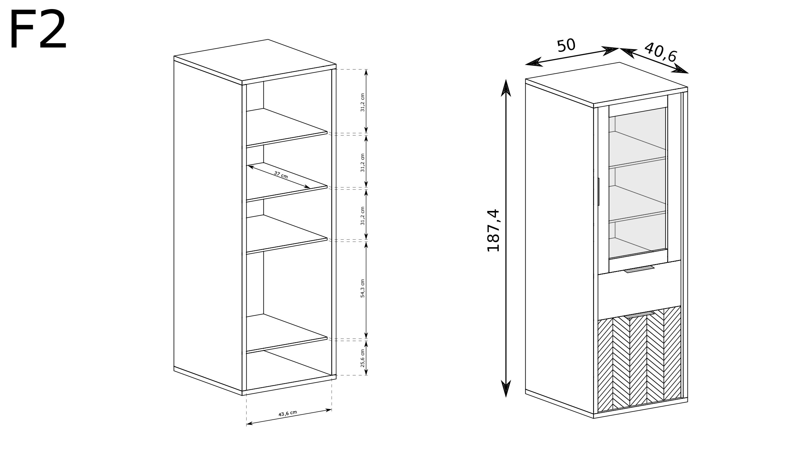 Witryna z kolekcji FONTI. Mebel posiada dwie szafki, jedna z pełnym frontem z jedną półką, która dzieli przestrzeń na pół, druga szafka ze szklanym z dwoma półkami. Pojemne szuflady w centrum witryny pomieszcą każdy dobiazg.