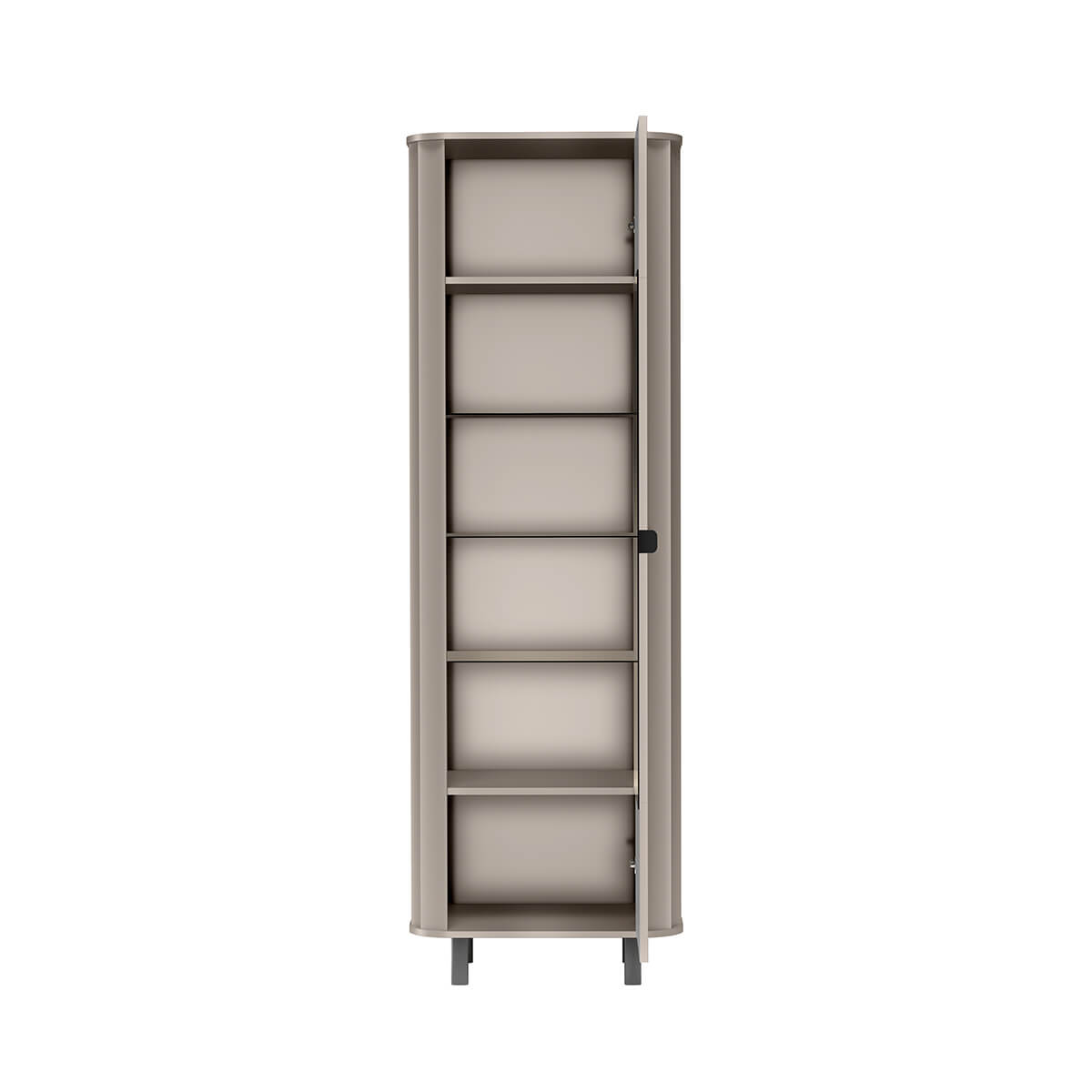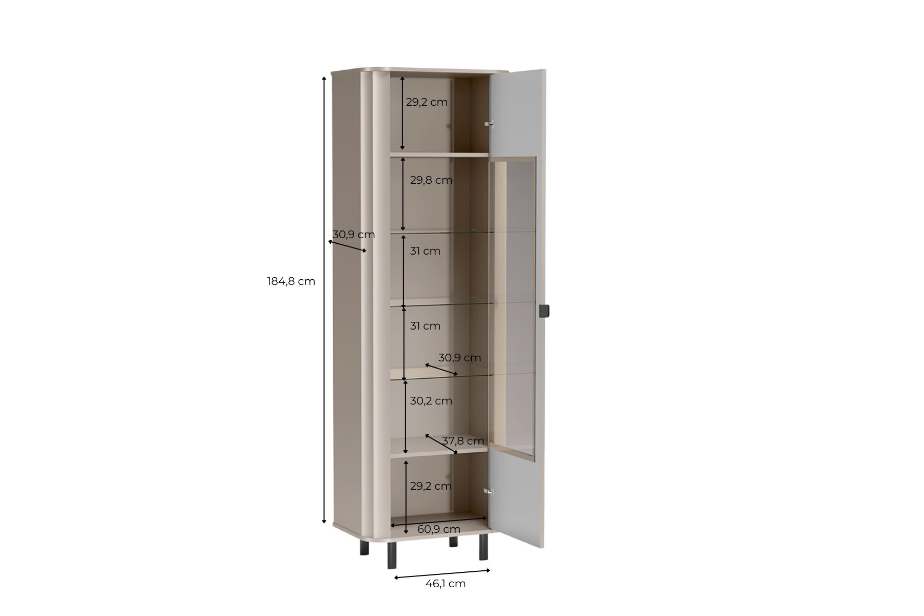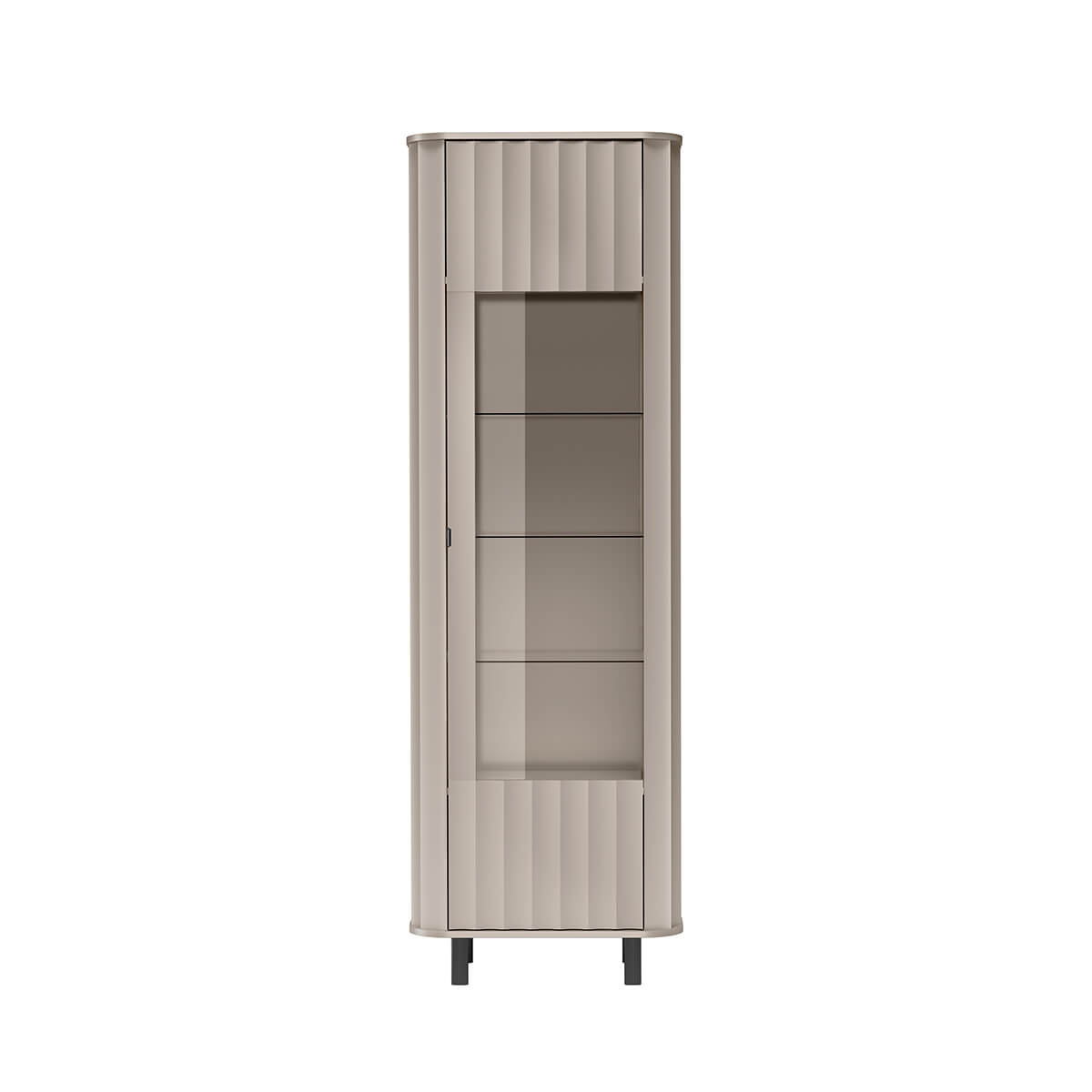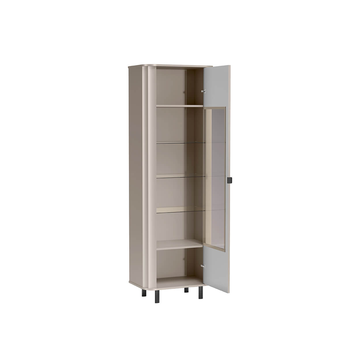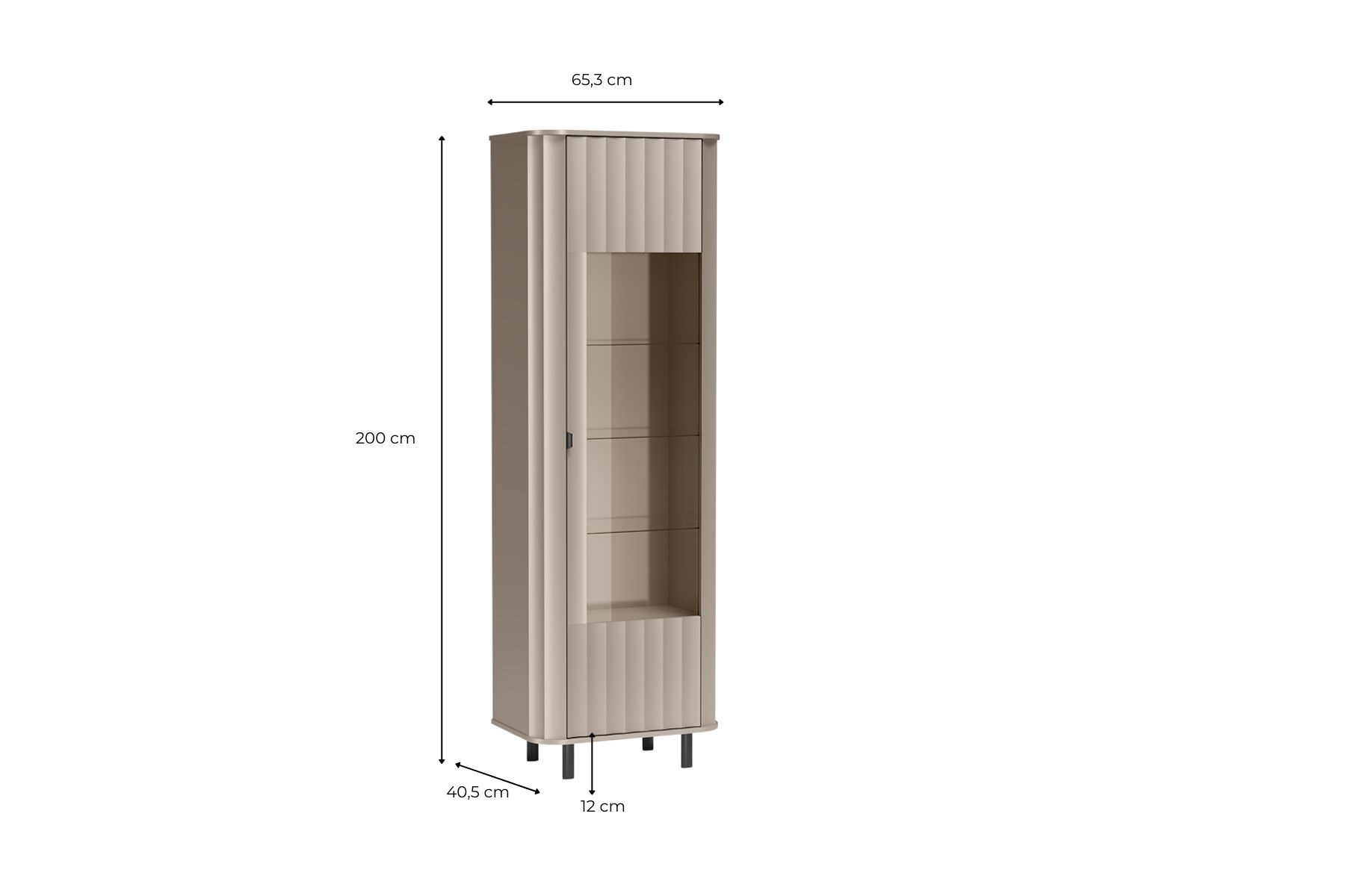 Charakterystyczne zaokrąglone blaty i krawędzie nadają witrynie lekkości, a owalne metalowe nogi o wysokości 12 cm nie tylko podkreślają nowoczesny styl, ale też umożliwiają bezproblemowe sprzątanie – robot sprzątający przejedzie pod meblem bez przeszkód. Całość dopełnia elegancki, minimalistyczny uchwyt, który dodaje subtelnego akcentu i wpisuje się w nowoczesną stylistykę kolekcji.