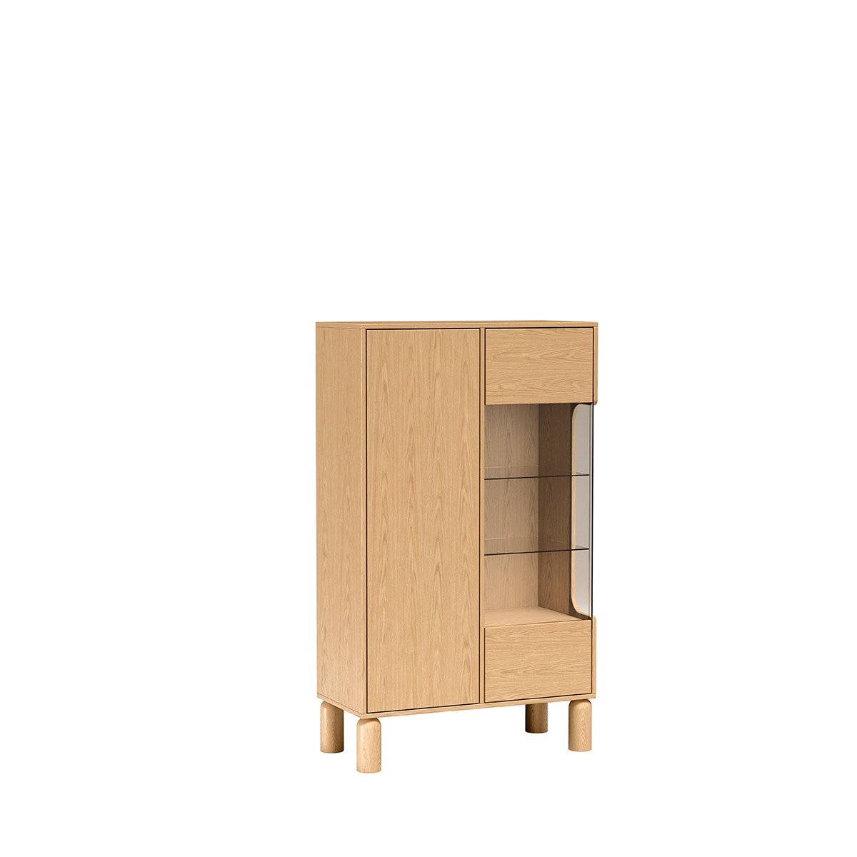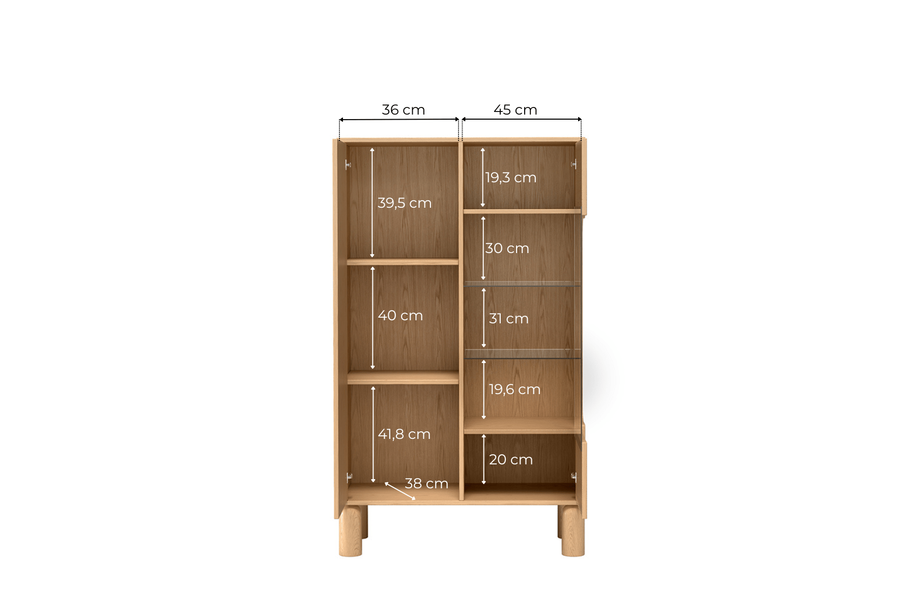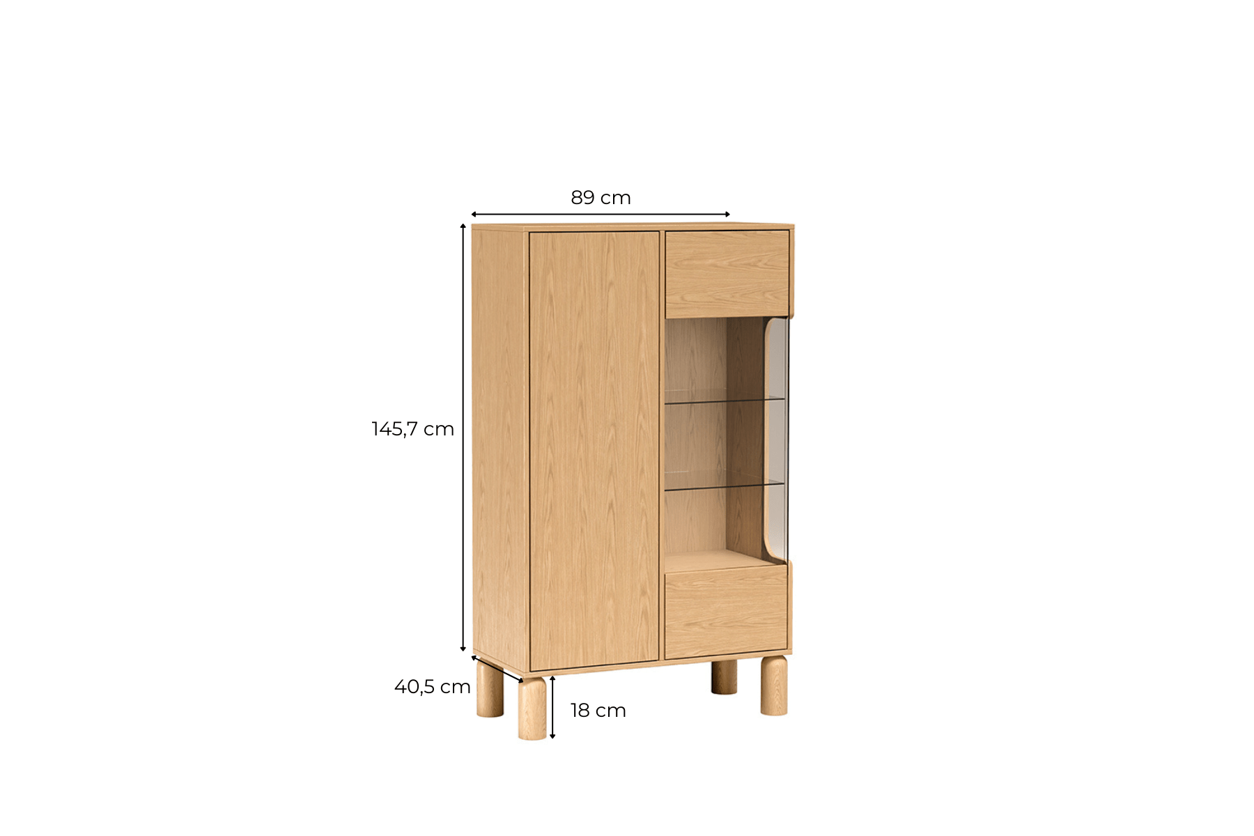 Witryna S-3 łączy w sobie funkcję ekspozycji z praktycznym przechowywaniem. Górna część z przeszklonymi drzwiami pozwala pięknie wyeksponować kolekcje porcelany, książek czy cennych pamiątek, podczas gdy dolna szafka dyskretnie ukrywa przedmioty codziennego użytku. System push to open zapewnia płynne otwieranie bez potrzeby stosowania uchwytów – wystarczy delikatny dotyk, by drzwi otworzyły się bezgłośnie. Fronty wykonane z dębu bookmatch prezentują naturalną symetrię słojów, tworząc harmonijną kompozycję, która przyciąga wzrok. Kompaktowa szerokość 89 cm pozwala ustawić meble nawet w węższych przestrzeniach, a wysokość 145,7 cm czyni je idealnym akcentem wertykalnym. Wysokie 18-centymetrowe dębowe nogi dodają lekkości i pozwalają światłu swobodnie przepływać pod meblem. To doskonały wybór do salonu, jadalni czy gabinetu.