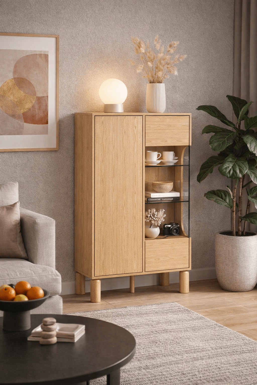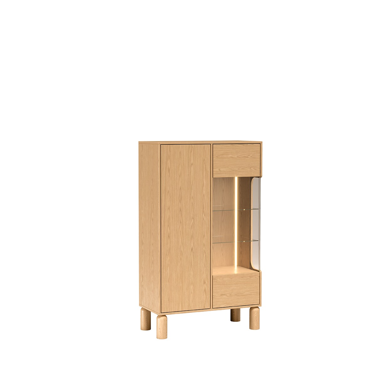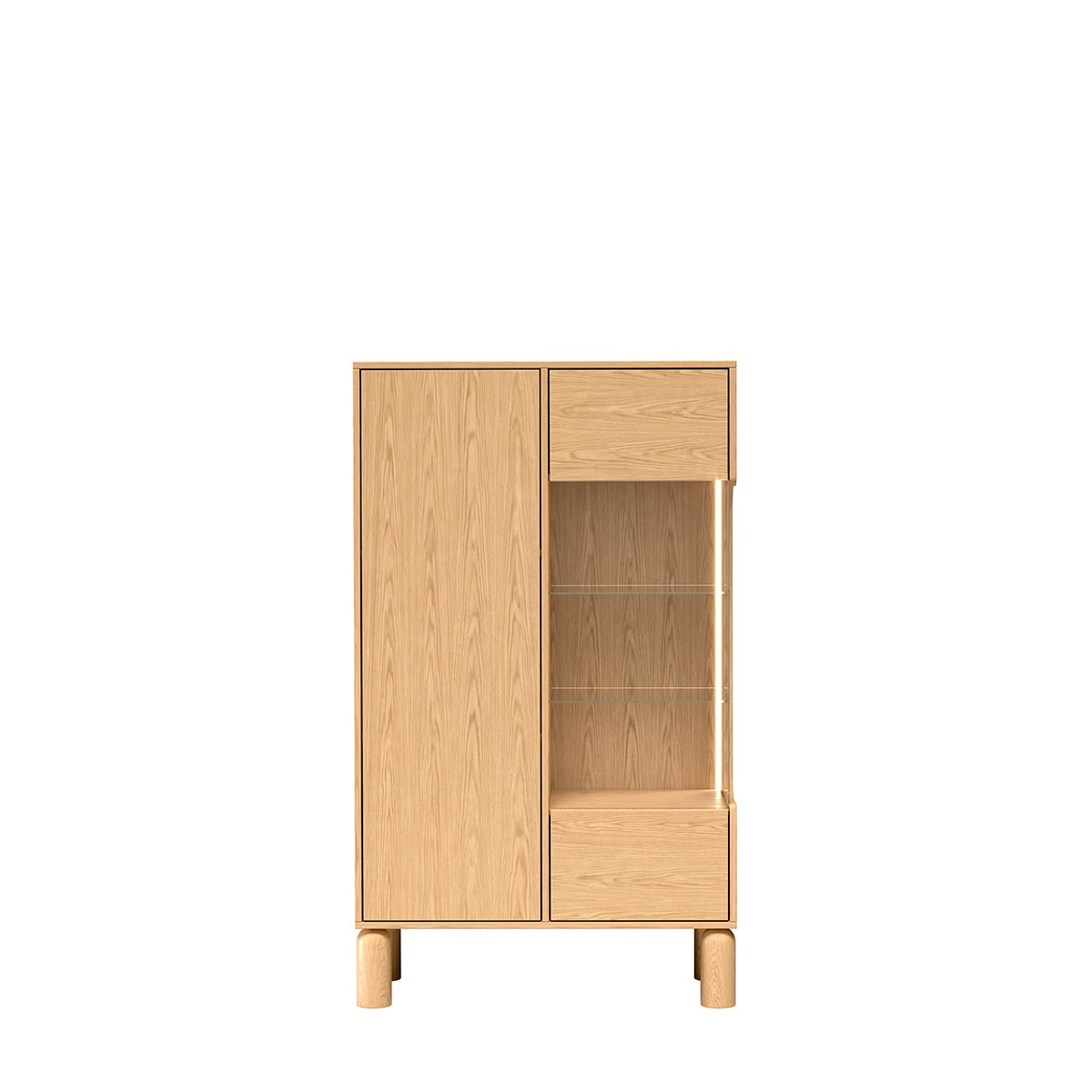Witryna S-3 łączy w sobie funkcję ekspozycji z praktycznym przechowywaniem. Górna część z przeszklonymi drzwiami pozwala pięknie wyeksponować kolekcje porcelany, książek czy cennych pamiątek, podczas gdy dolna szafka dyskretnie ukrywa przedmioty codziennego użytku. System push to open zapewnia płynne otwieranie bez potrzeby stosowania uchwytów – wystarczy delikatny dotyk, by drzwi otworzyły się bezgłośnie. Fronty wykonane z dębu bookmatch prezentują naturalną symetrię słojów, tworząc harmonijną kompozycję, która przyciąga wzrok. Kompaktowa szerokość 89 cm pozwala ustawić meble nawet w węższych przestrzeniach, a wysokość 145,7 cm czyni je idealnym akcentem wertykalnym. Wysokie 18-centymetrowe dębowe nogi dodają lekkości i pozwalają światłu swobodnie przepływać pod meblem. To doskonały wybór do salonu, jadalni czy gabinetu.