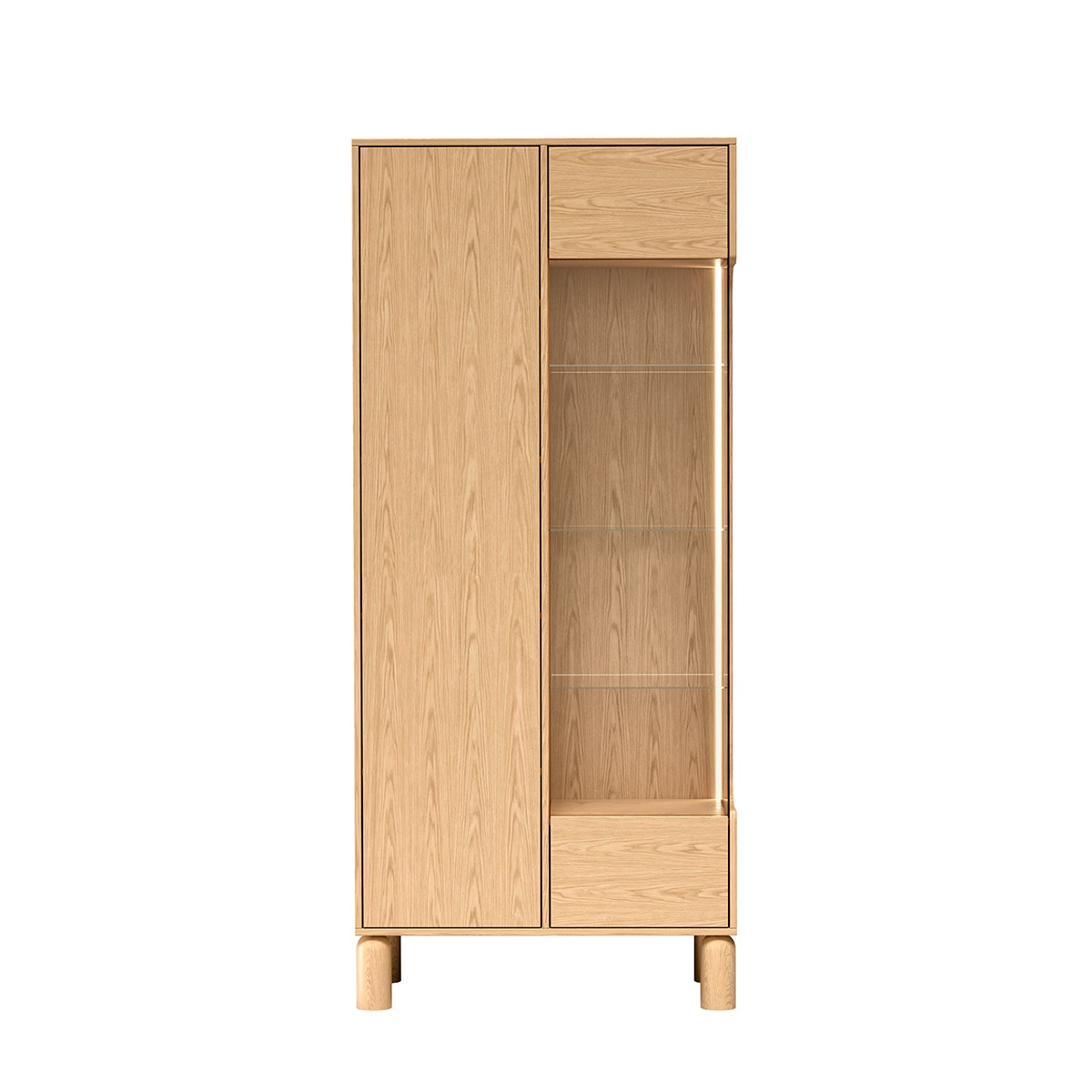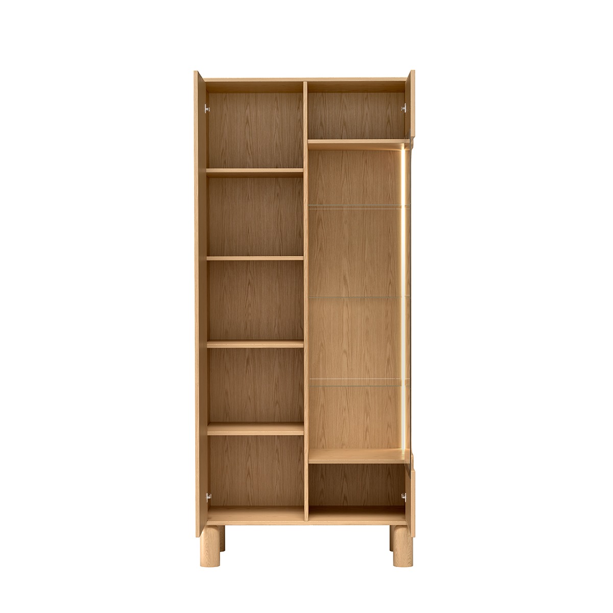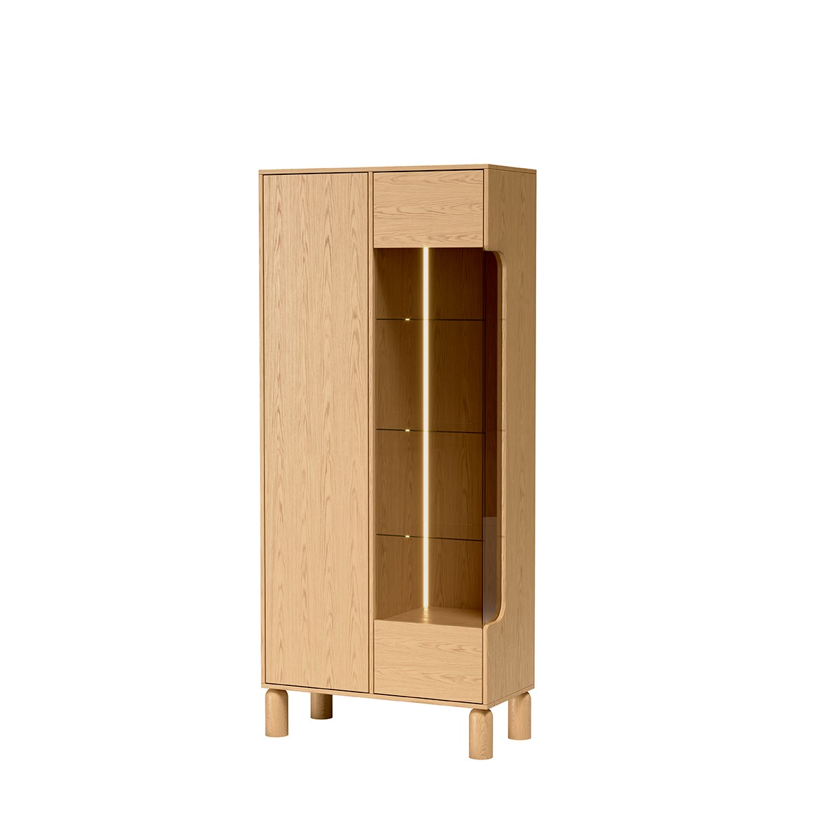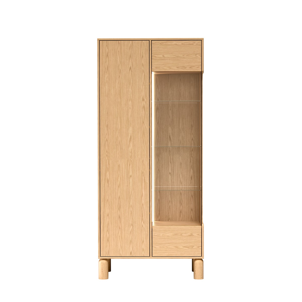 S-4 to najwyższy mebel w kolekcji Sanden, który swoją smukłą sylwetką (89 cm szerokości, 197 cm wysokości) nadaje wnętrzu elegancji i wertykalnej dynamiki. Wysokie przeszklone drzwi umożliwiają piękną ekspozycję kolekcji na kilku poziomach, tworząc efektowną galerię ulubionych przedmiotów. System push to open pozwala na bezuchwtowe otwieranie – wystarczy dotknąć frontu, by drzwi otworzyły się płynnie i bezgłośnie. Fronty z naturalnego dębu bookmatch tworzą symetryczne, lustrzane wzory słojów, które nadają meblowi unikalny charakter. Wąska forma sprawia, że witryna doskonale sprawdzi się nawet w mniejszych pomieszczeniach, przy jednoczesnym zachowaniu dużej pojemności. Wysokie 18-centymetrowe dębowe nogi unoszą mebel nad podłogą, tworząc wrażenie lekkości i pozwalając na swobodny przepływ światła. Idealna do salonu, jadalni czy biblioteki domowej.