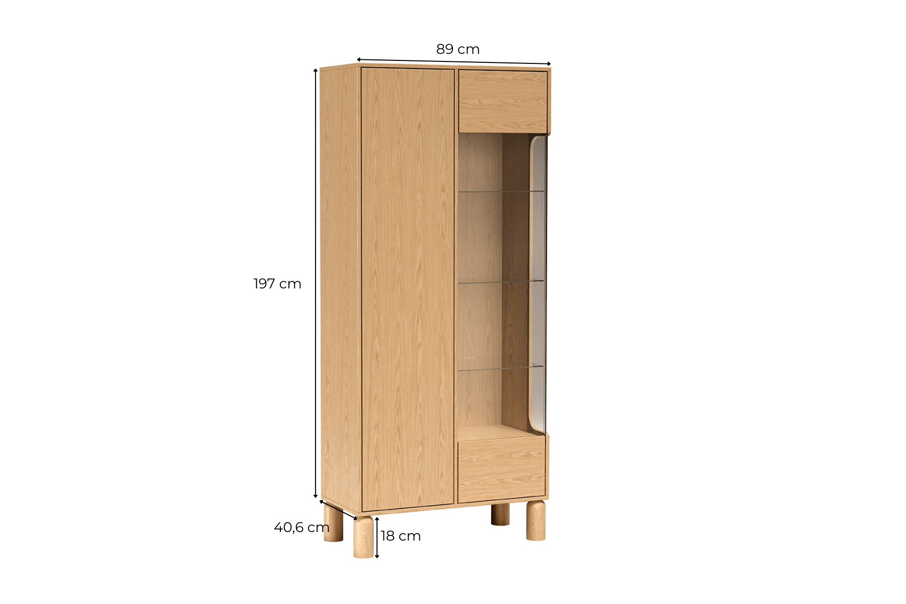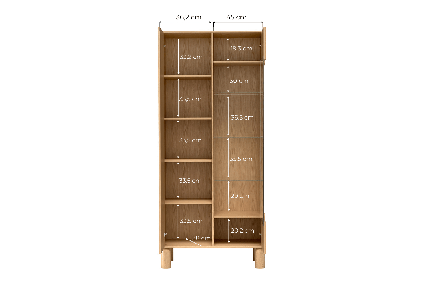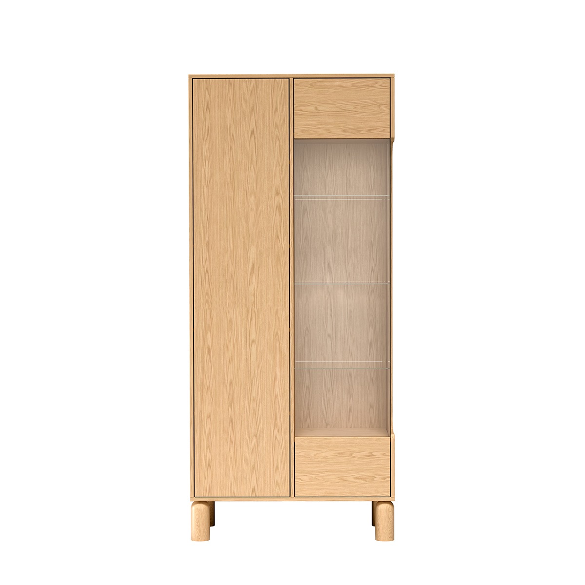 S-4 to najwyższy mebel w kolekcji Sanden, który swoją smukłą sylwetką (89 cm szerokości, 197 cm wysokości) nadaje wnętrzu elegancji i wertykalnej dynamiki. Wysokie przeszklone drzwi umożliwiają piękną ekspozycję kolekcji na kilku poziomach, tworząc efektowną galerię ulubionych przedmiotów. System push to open pozwala na bezuchwtowe otwieranie – wystarczy dotknąć frontu, by drzwi otworzyły się płynnie i bezgłośnie. Fronty z naturalnego dębu bookmatch tworzą symetryczne, lustrzane wzory słojów, które nadają meblowi unikalny charakter. Wąska forma sprawia, że witryna doskonale sprawdzi się nawet w mniejszych pomieszczeniach, przy jednoczesnym zachowaniu dużej pojemności. Wysokie 18-centymetrowe dębowe nogi unoszą mebel nad podłogą, tworząc wrażenie lekkości i pozwalając na swobodny przepływ światła. Idealna do salonu, jadalni czy biblioteki domowej.