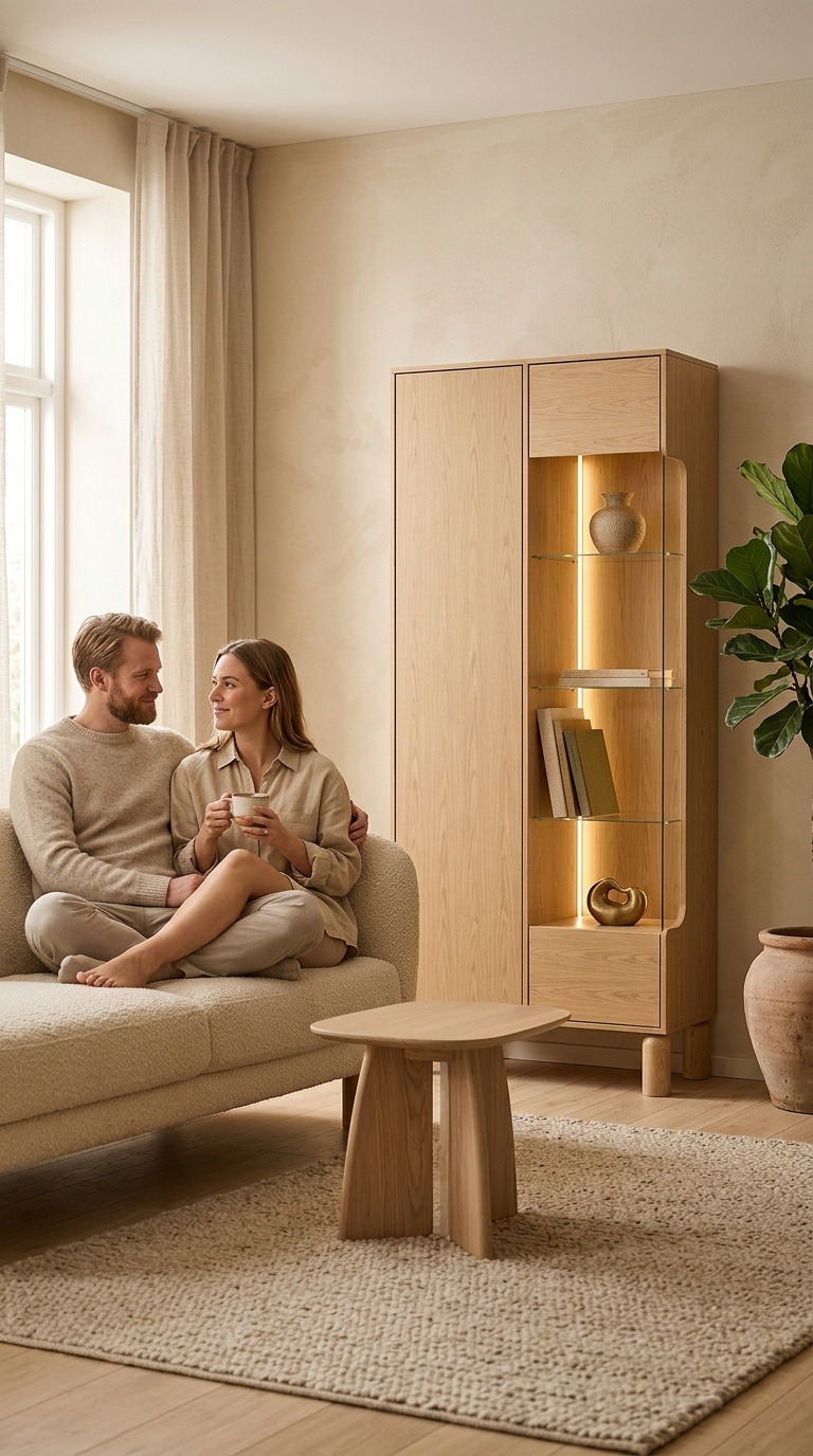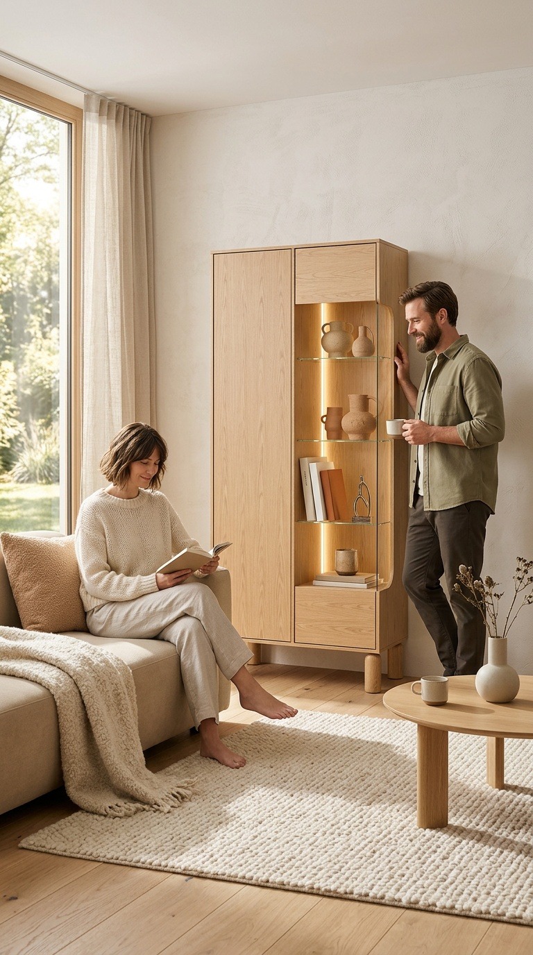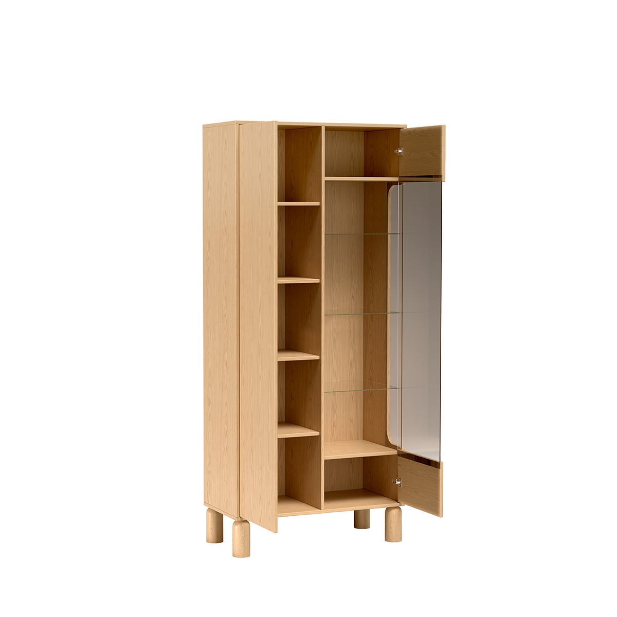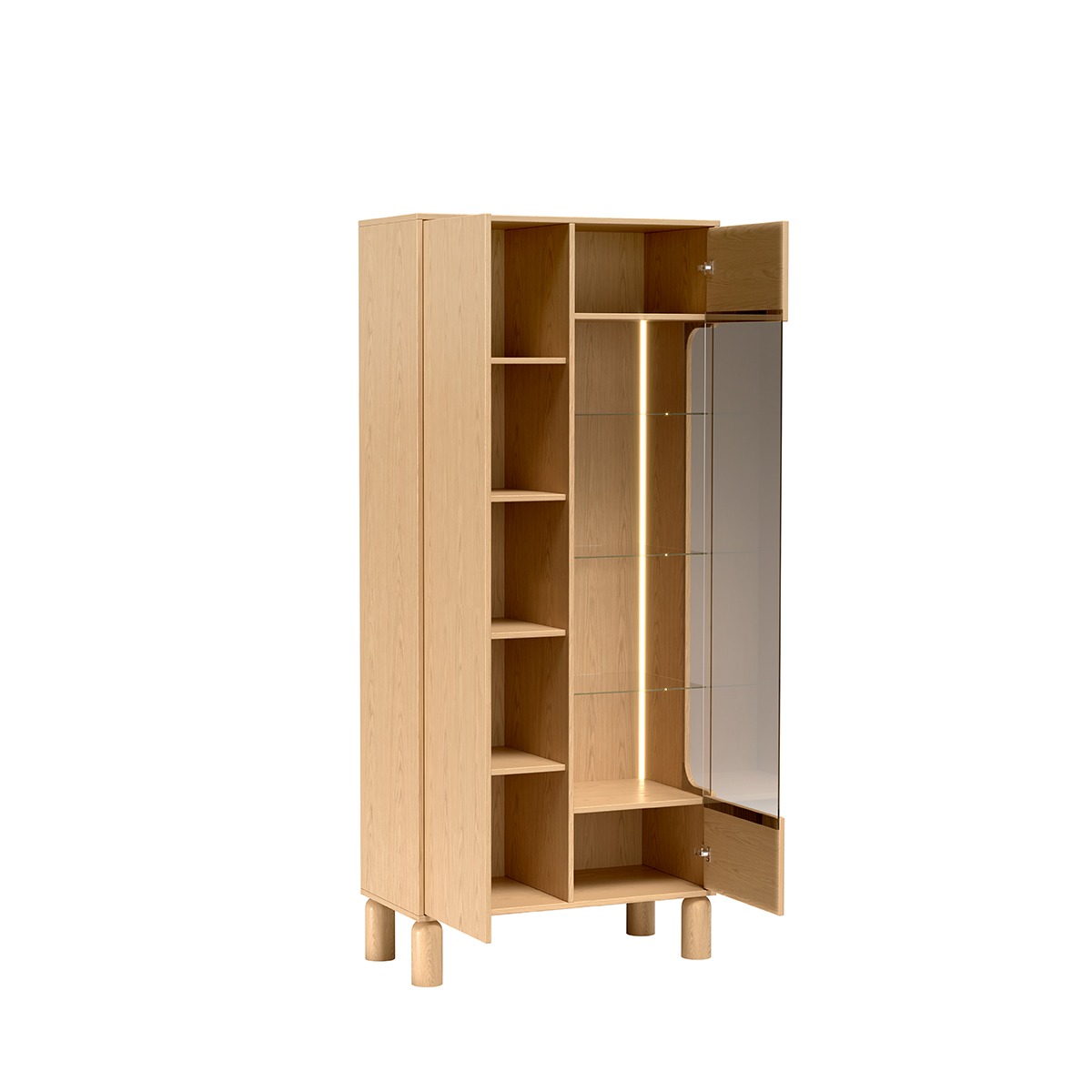 S-4 to najwyższy mebel w kolekcji Sanden, który swoją smukłą sylwetką (89 cm szerokości, 197 cm wysokości) nadaje wnętrzu elegancji i wertykalnej dynamiki. Wysokie przeszklone drzwi umożliwiają piękną ekspozycję kolekcji na kilku poziomach, tworząc efektowną galerię ulubionych przedmiotów. System push to open pozwala na bezuchwtowe otwieranie – wystarczy dotknąć frontu, by drzwi otworzyły się płynnie i bezgłośnie. Fronty z naturalnego dębu bookmatch tworzą symetryczne, lustrzane wzory słojów, które nadają meblowi unikalny charakter. Wąska forma sprawia, że witryna doskonale sprawdzi się nawet w mniejszych pomieszczeniach, przy jednoczesnym zachowaniu dużej pojemności. Wysokie 18-centymetrowe dębowe nogi unoszą mebel nad podłogą, tworząc wrażenie lekkości i pozwalając na swobodny przepływ światła. Idealna do salonu, jadalni czy biblioteki domowej.