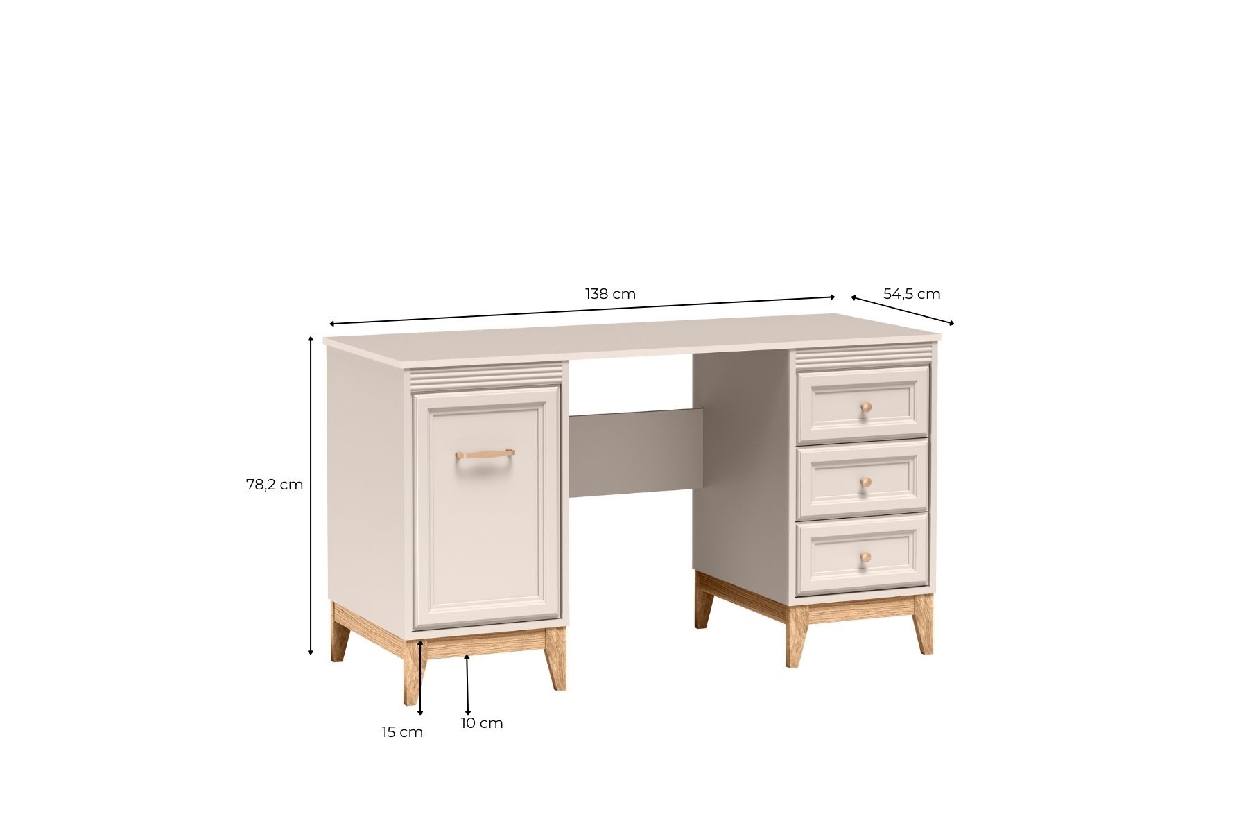 Biurko Windsor to nie tylko piękny design – to przemyślana funkcjonalność. Po lewej stronie znajduje się szafka z drzwiczkami, idealna na dokumenty, książki czy sprzęt biurowy. Po prawej – trzy pojemne szuflady, w których z łatwością zmieścisz wszystkie niezbędne akcesoria. Przestrzenne miejsce pod blatem pozwala swobodnie usiąść i wygodnie pracować przez wiele godzin.