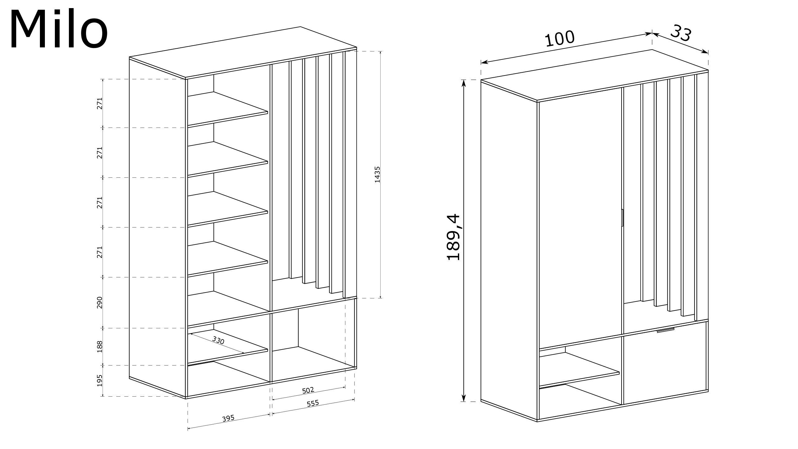 Garderoba to mebel, który potrzebny jest w każdym domu, to funkcjonalna szafa do przechowywania butów i odwieszenia kurtek na wieszaku. Nie może w niej zabraknąć lustra, w którym będziemy mogli się przejrzeć przed wyjściem z mieszkania. Nowoczesny wygląd sprawia, że garderoba wpasuje się w modowe trendy tego sezonu. Za drzwiami z lustrem znajdują się półki, które można wykorzystać do schowania obuwia dla całej rodziny. Garderoba dostępna jest w trzech wersjach kolorystycznych: cała w kolorze kaszmir, stone green i grafit. Garderoba będzie pasować do każdego holu, jest uniwersalna, ozdobne lamele mogą być po prawej, jak i po lewej stronie. Wieszak i uchwyty są bardzo solidne i wykonane z metalu.