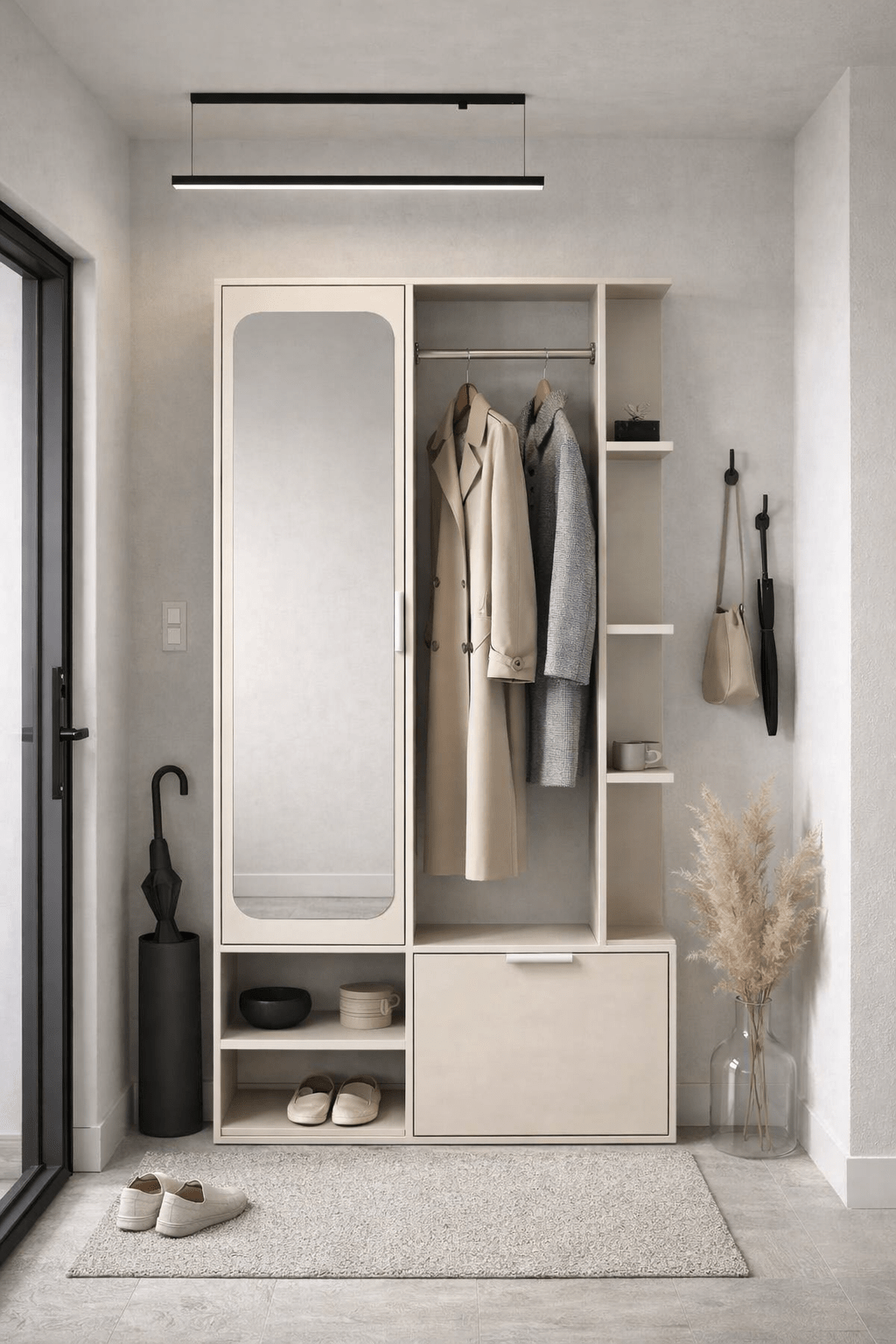 ✔ 3 otwarte półki – szybki dostęp do czapek, torebek, kluczy
