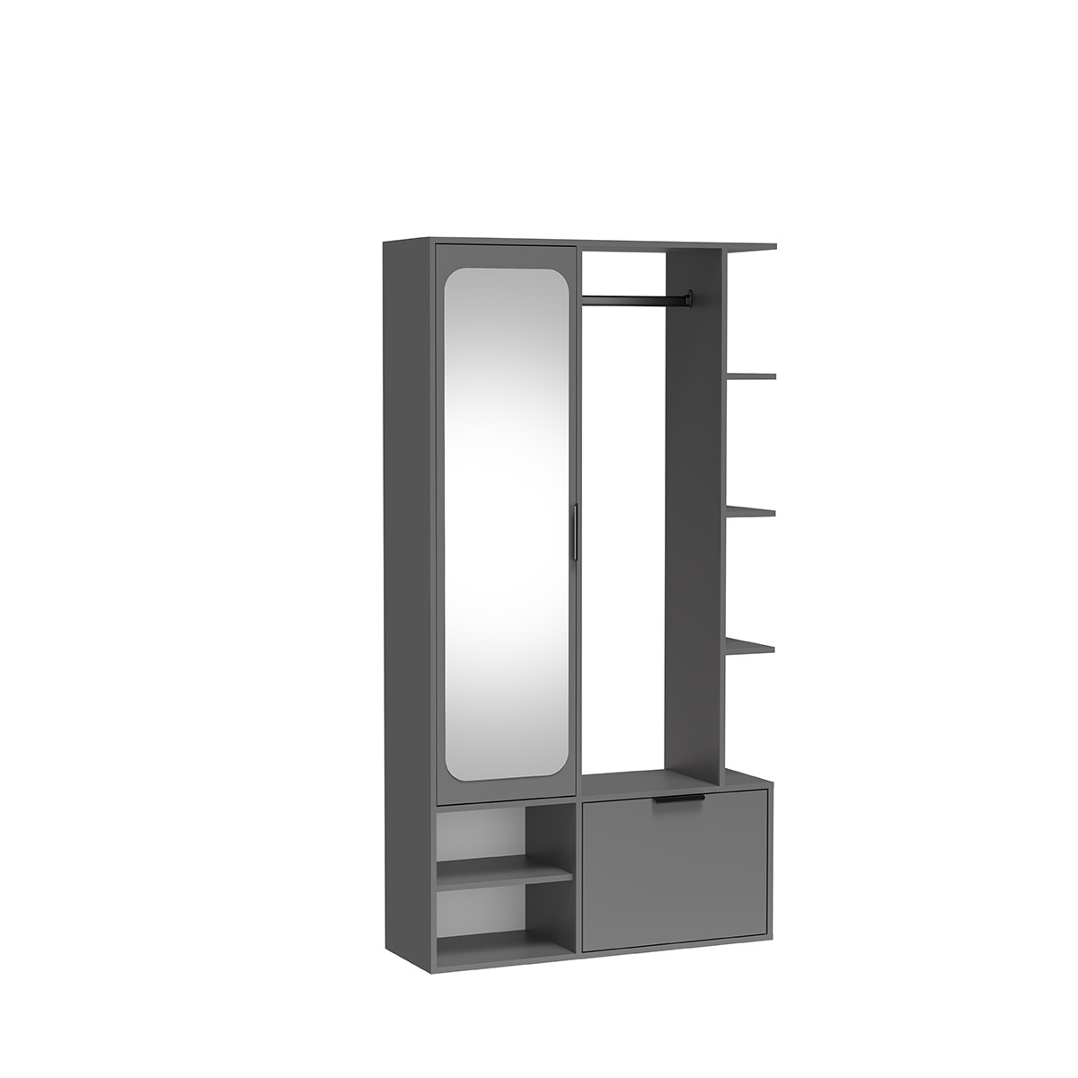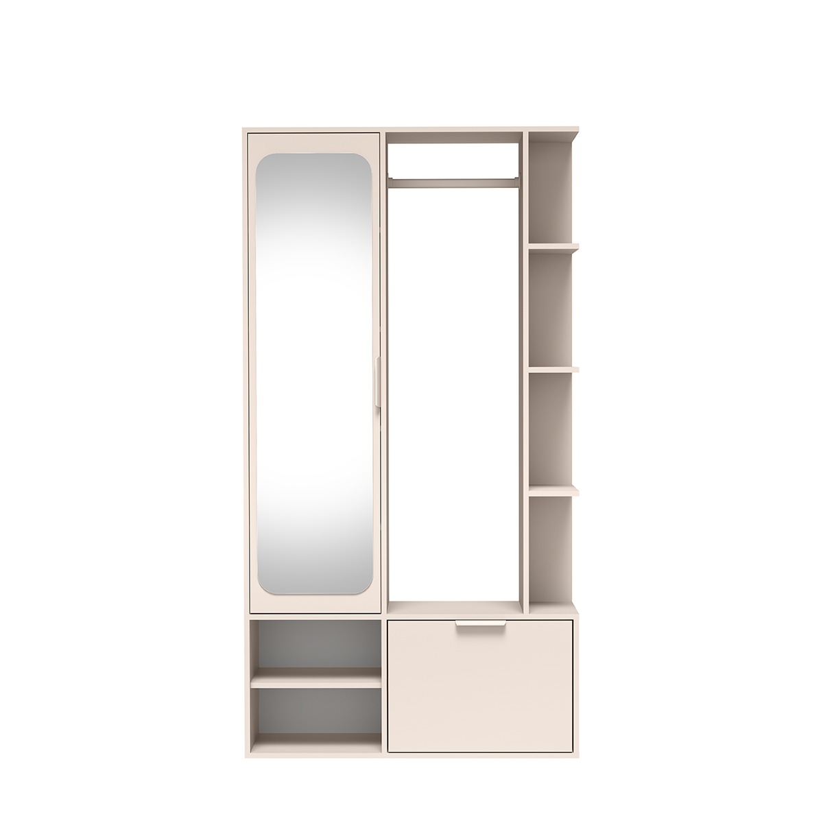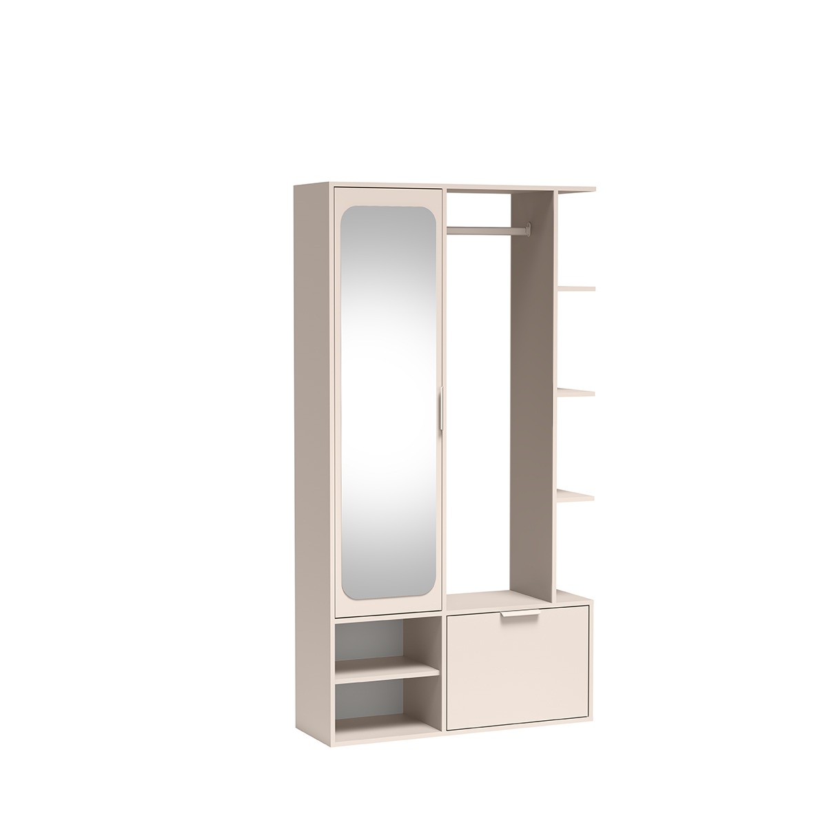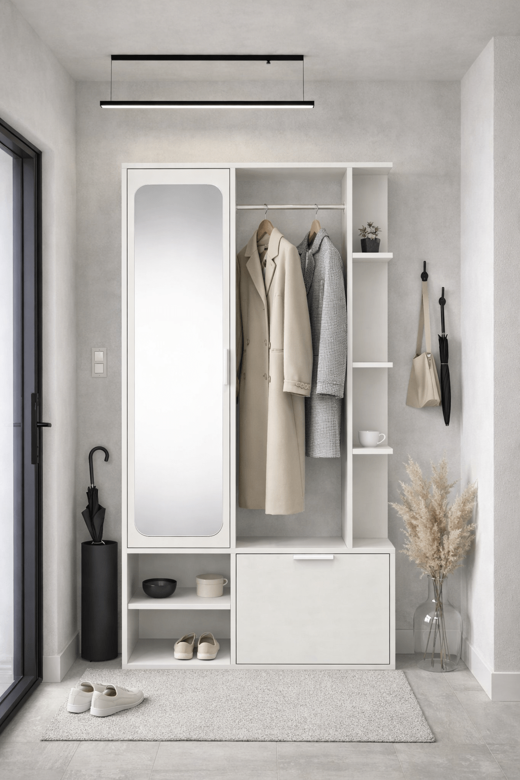 Garderoba NALA to funkcjonalne rozwiązanie do przedpokoju, które łączy praktyczność z nowoczesnym designem. Dzięki lustru, drążkowi na ubrania, półkom na buty i otwartym półkom bocznym zapewnia wygodną organizację przestrzeni. Eleganckie metalowe uchwyty i dostępność w 4 stylowych kolorach sprawiają, że NALA idealnie dopasuje się do każdego wnętrza.