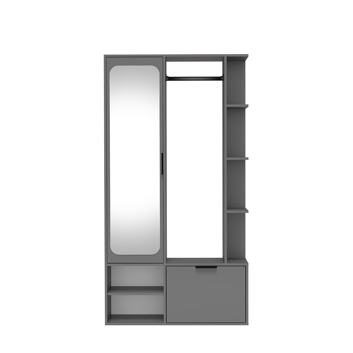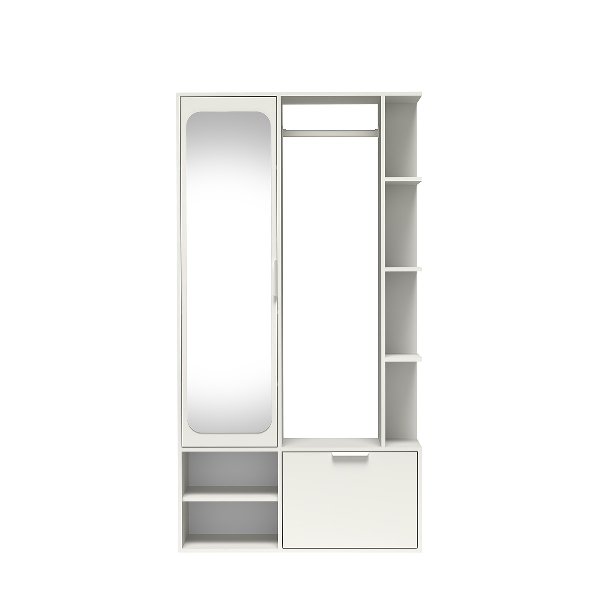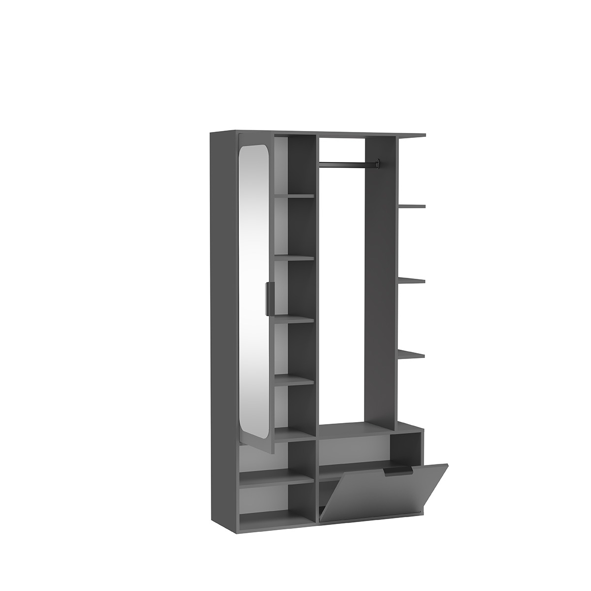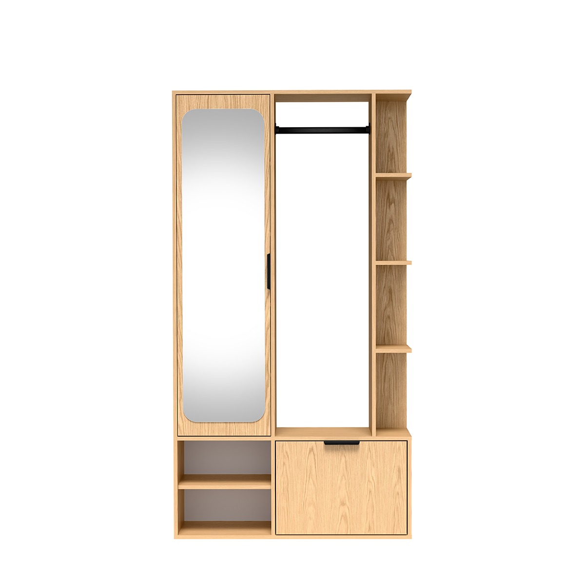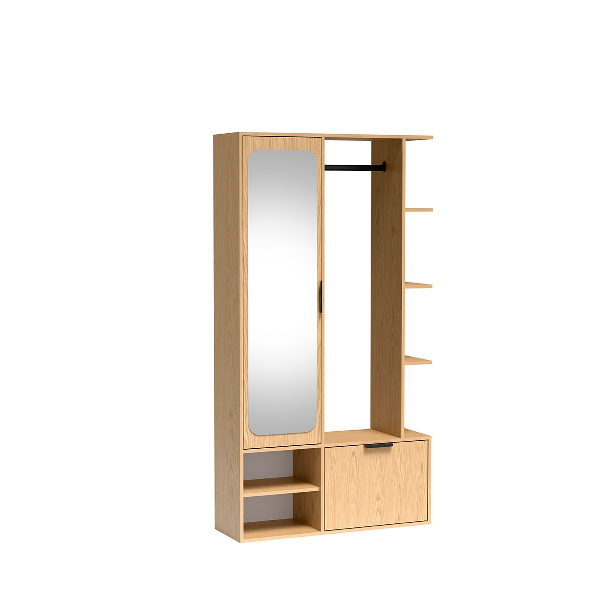 Garderoba NALA to funkcjonalne rozwiązanie do przedpokoju, które łączy praktyczność z nowoczesnym designem. Dzięki lustru, drążkowi na ubrania, półkom na buty i otwartym półkom bocznym zapewnia wygodną organizację przestrzeni. Eleganckie metalowe uchwyty i dostępność w 4 stylowych kolorach sprawiają, że NALA idealnie dopasuje się do każdego wnętrza.