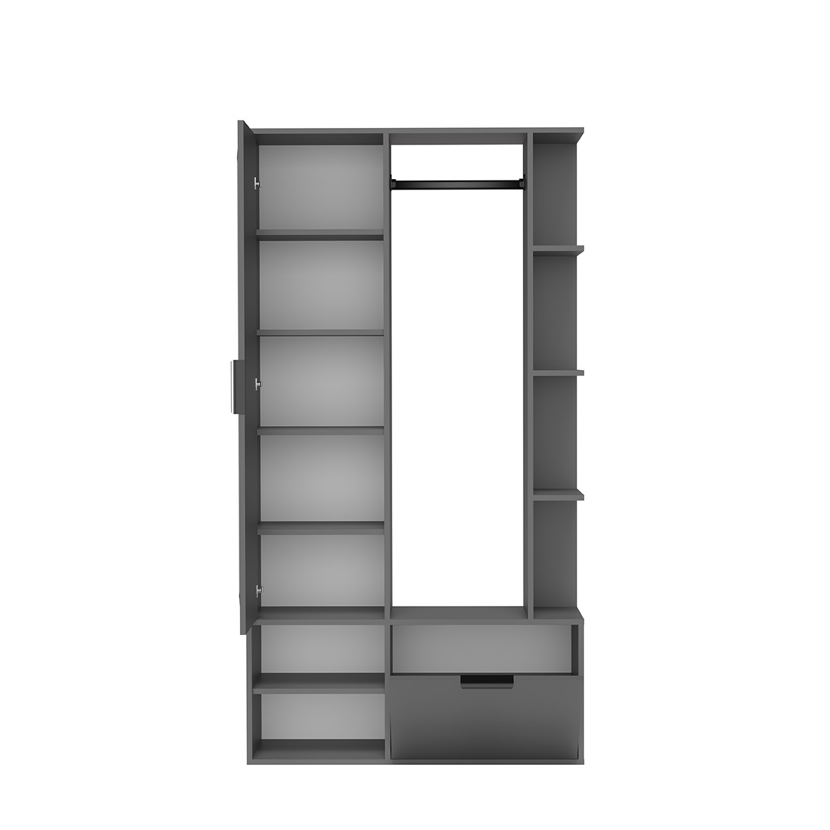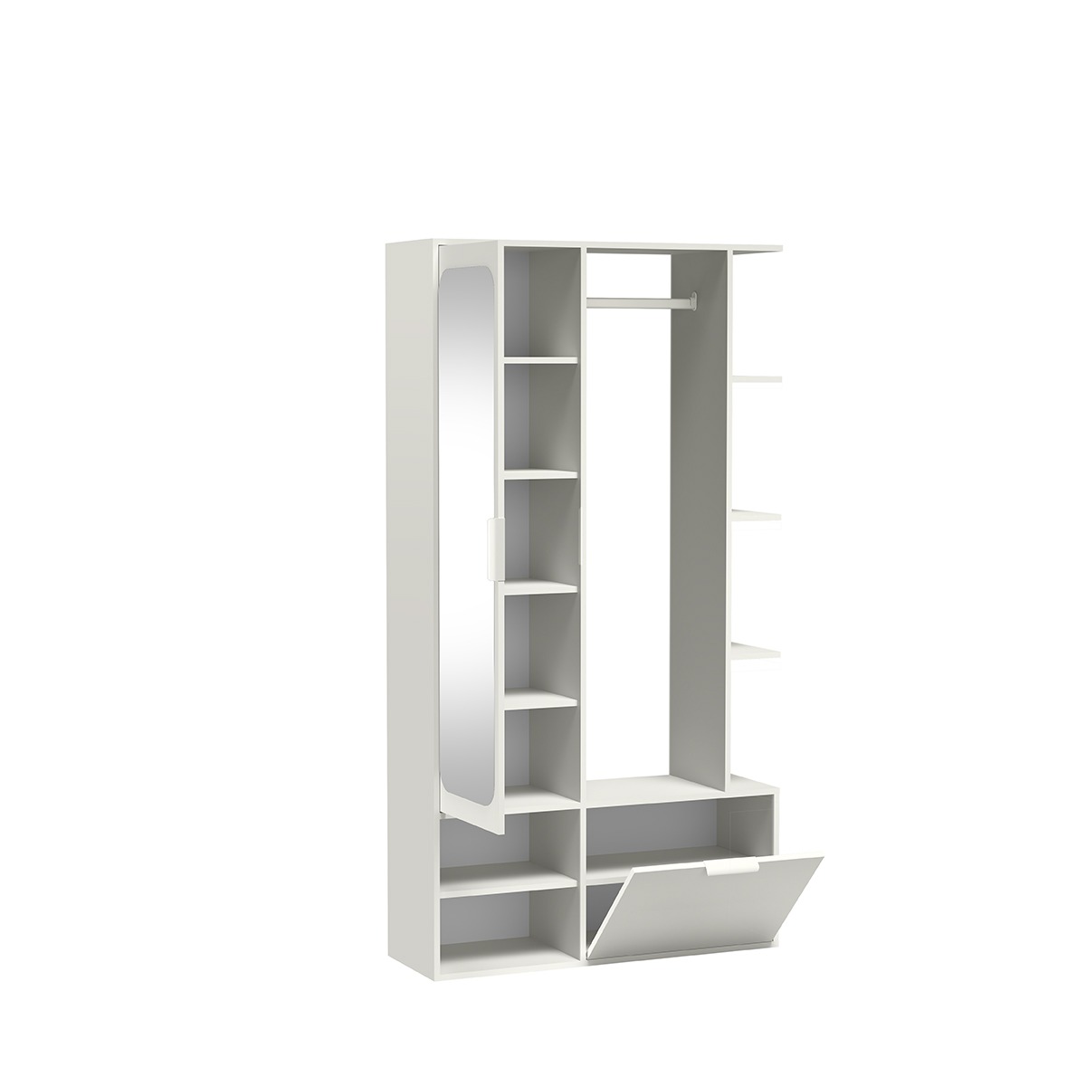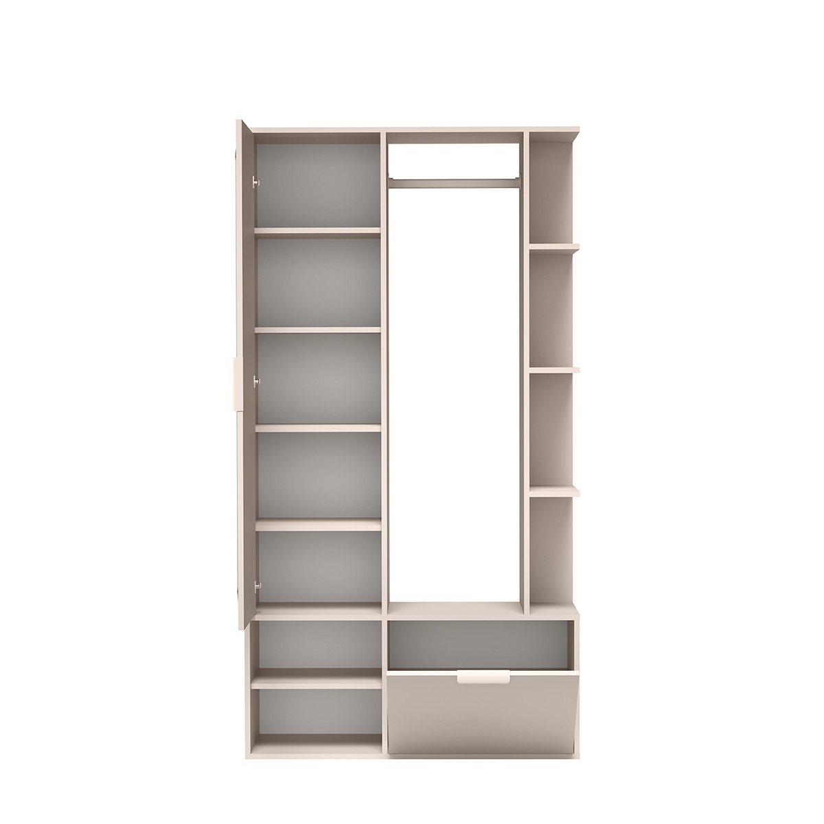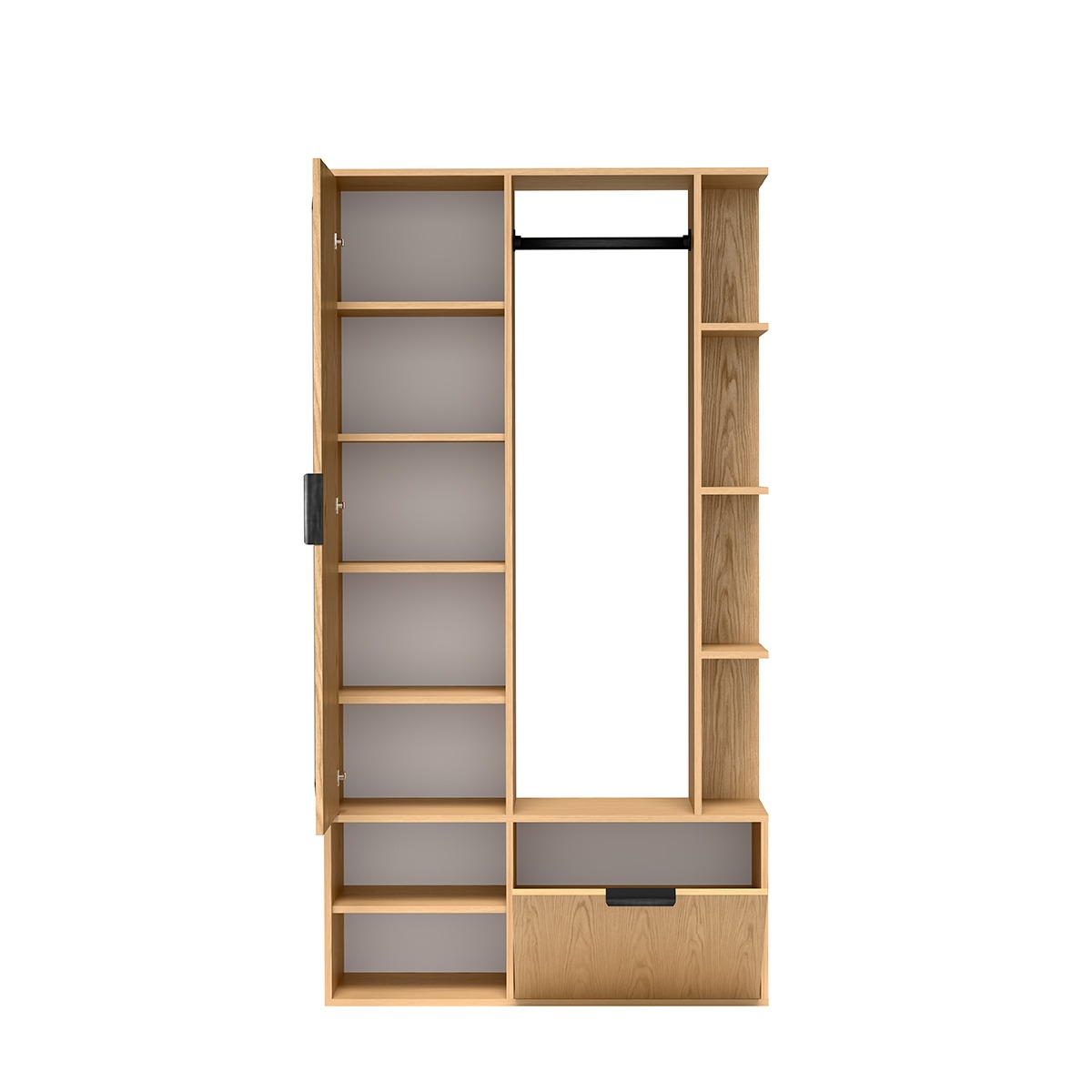 NALA oferuje wszystko, czego potrzebujesz na co dzień – przestronny drążek na wieszaki pozwala wygodnie przechowywać płaszcze, kurtki i marynarki. Pojemne półki na buty mieszczą ulubione obuwie, a otwarte półki z prawej strony idealnie sprawdzą się do ekspozycji dekoracji, przechowywania torebek czy koszyków z drobiazgami.