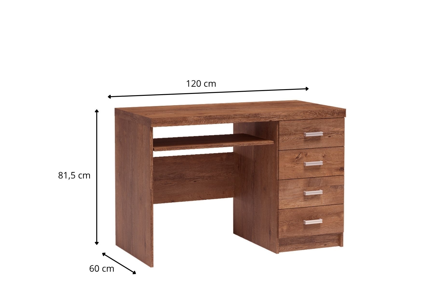 Biurko z kolekcji Indianapolis. Posiada cztery pojemne szuflady na dokumenty czy różne akcesoria. Znajduje się w nim również wysuwana półka na klawiaturę, laptopa lub inne rzeczy. Biurko jest bardzo eleganckie. Wpasuję się do wielu aranżacji, pasuje do salonu, jak i biura bądź gabinetu. Mile będzie się na nim odrabiać prace domowe, biurowe, jest dla każdego. Metalowe uchwyty podkreślają wyjątkowość mebla. Dostępne w trzech wybarwieniach.