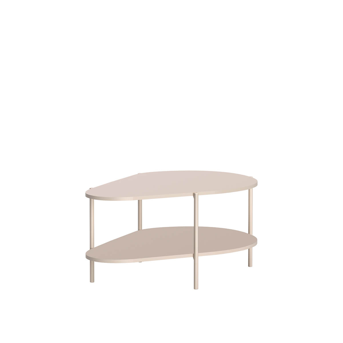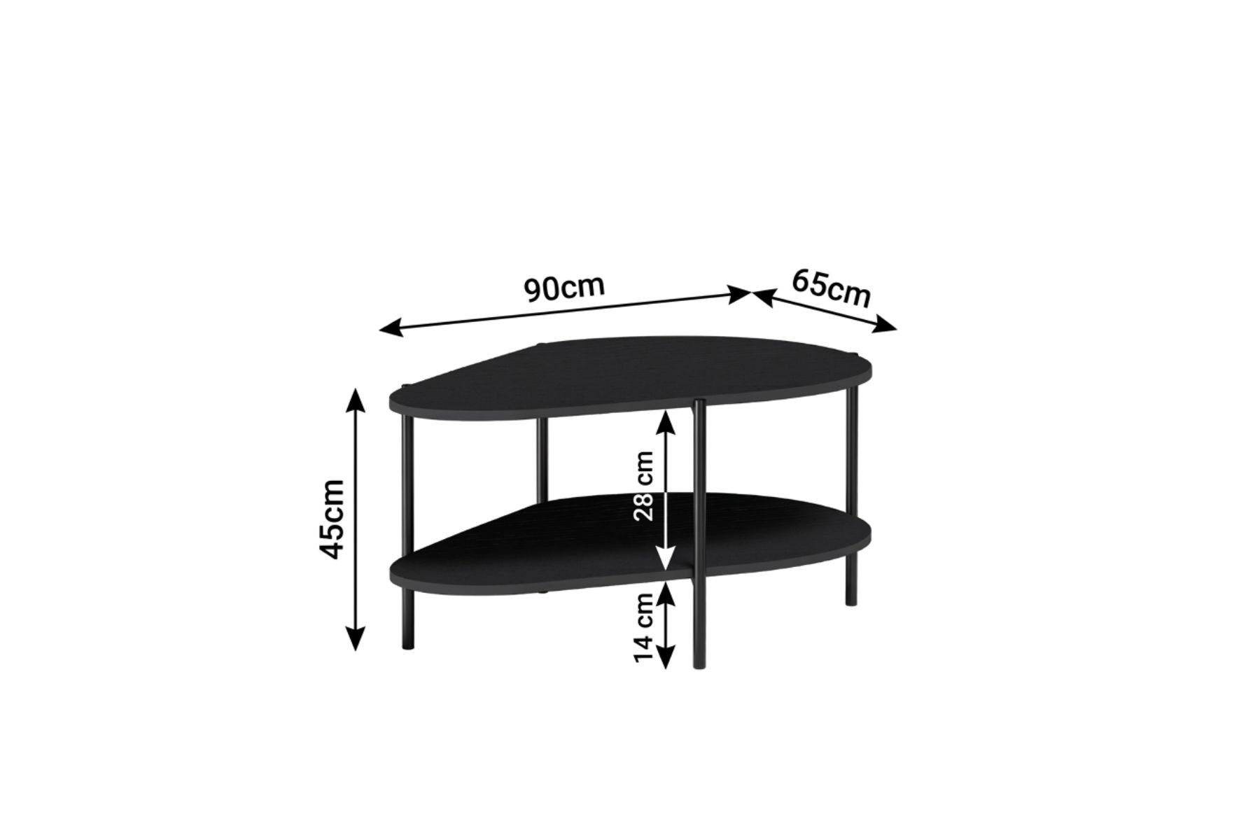 Nowoczesny stolik kawowy o organicznym kształcie i dwupoziomowej konstrukcji. Elegancka czerń, solidna metalowa rama i dodatkowa półka łączą styl z funkcjonalnością, idealnie komponując się z nowoczesnymi wnętrzami.