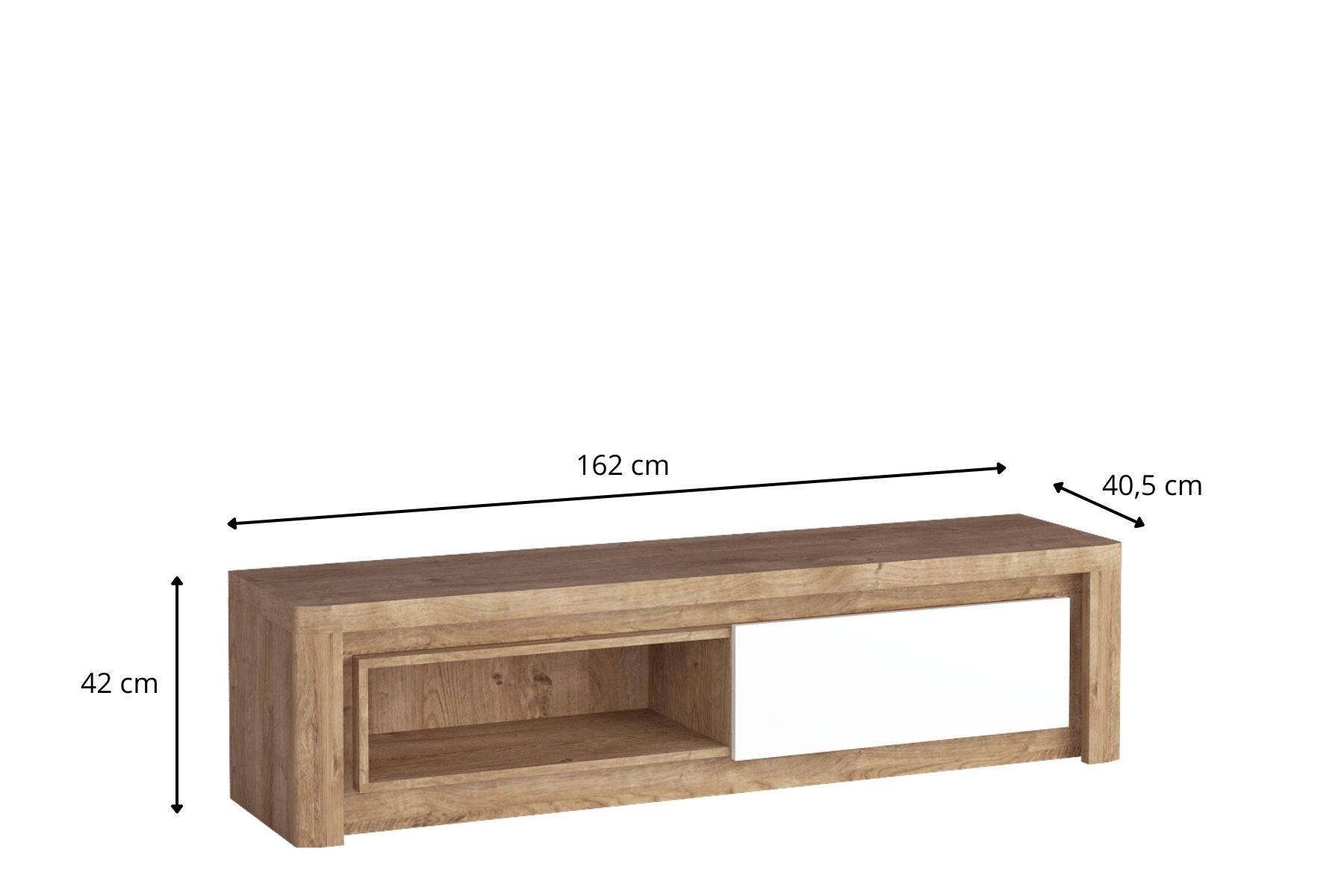 Duża, nowoczesna szafka pod telewizor. Zastosowane naturalne wybarwienie korpusu i frontów wpasuje się w każde wnętrze. Szafka posiada z prawej strony zamykaną szafkę z frontem w formie klapy, otwieraną do dołu. Lewa strona to otwarta półka na której można postawić dekoder czy sprzęt muzyczny. Strefa telewizyjna w salonie jest miejsce gdzie spędzamy bardzo dużo czasu. Ważne by czuć się w miejscu relaksu swobodnie. Umili nam czas oświetlenie zastosowane w meblu, możemy z niego skorzystać o zmroku. Szafka doskonale będzie się prezentować z innymi elementami z systemu, tworząc wspólną całość w pięknych kolorach.