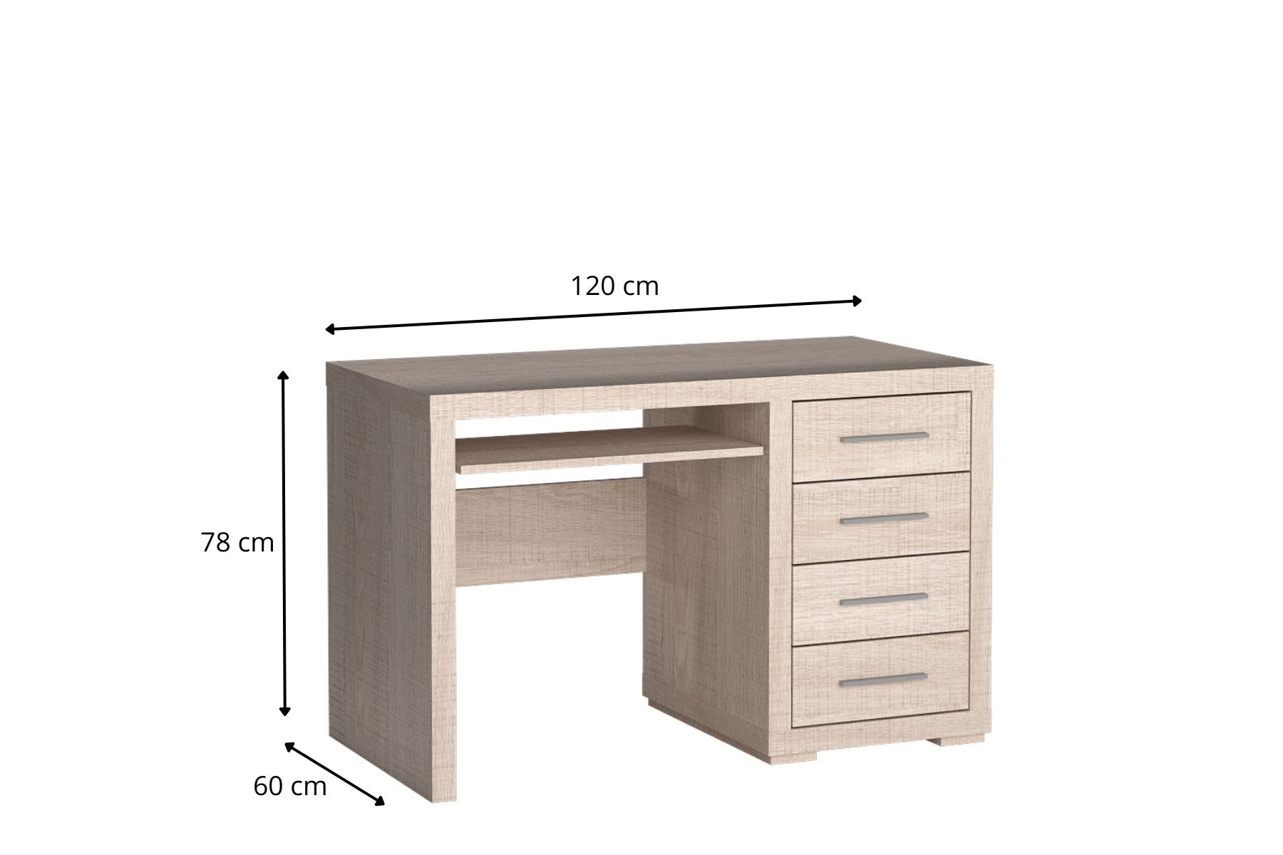 Biurko z kolekcji Vegas. Posiada cztery szuflady, które pomieszczą wiele dokumentów, przyborów czy książek. Wysuwana półka jest idealna w zgraniu z klawiaturą, czy najpotrzebniejszymi rzeczami. Metalowe uchwyty podkreślają stanowczość i charakter mebla. Biurko ułatwia organizacje, pasuje do biura, gabinetu, ale również do salonu czy sypialni. Można z nim stwarzać wiele aranżacji, wykorzystać nawet jako toaletka. Dostępne w dwóch wybarwieniach.